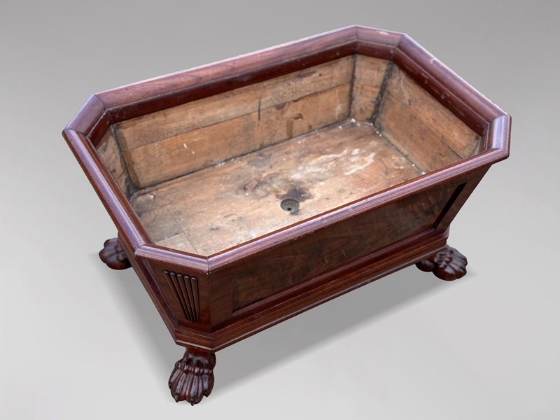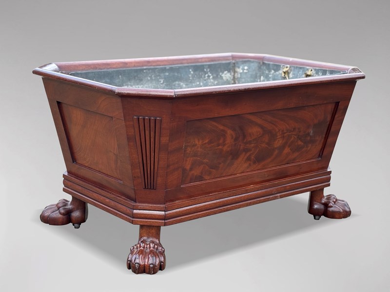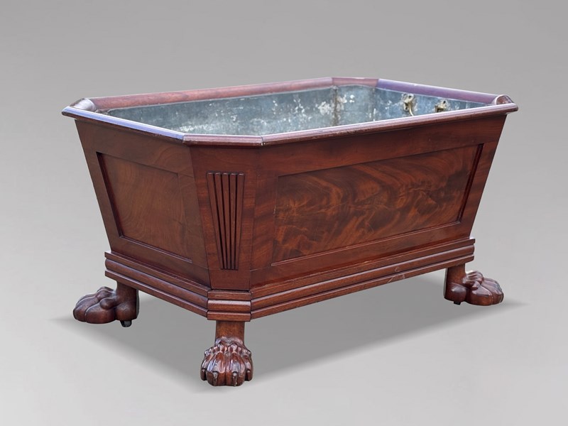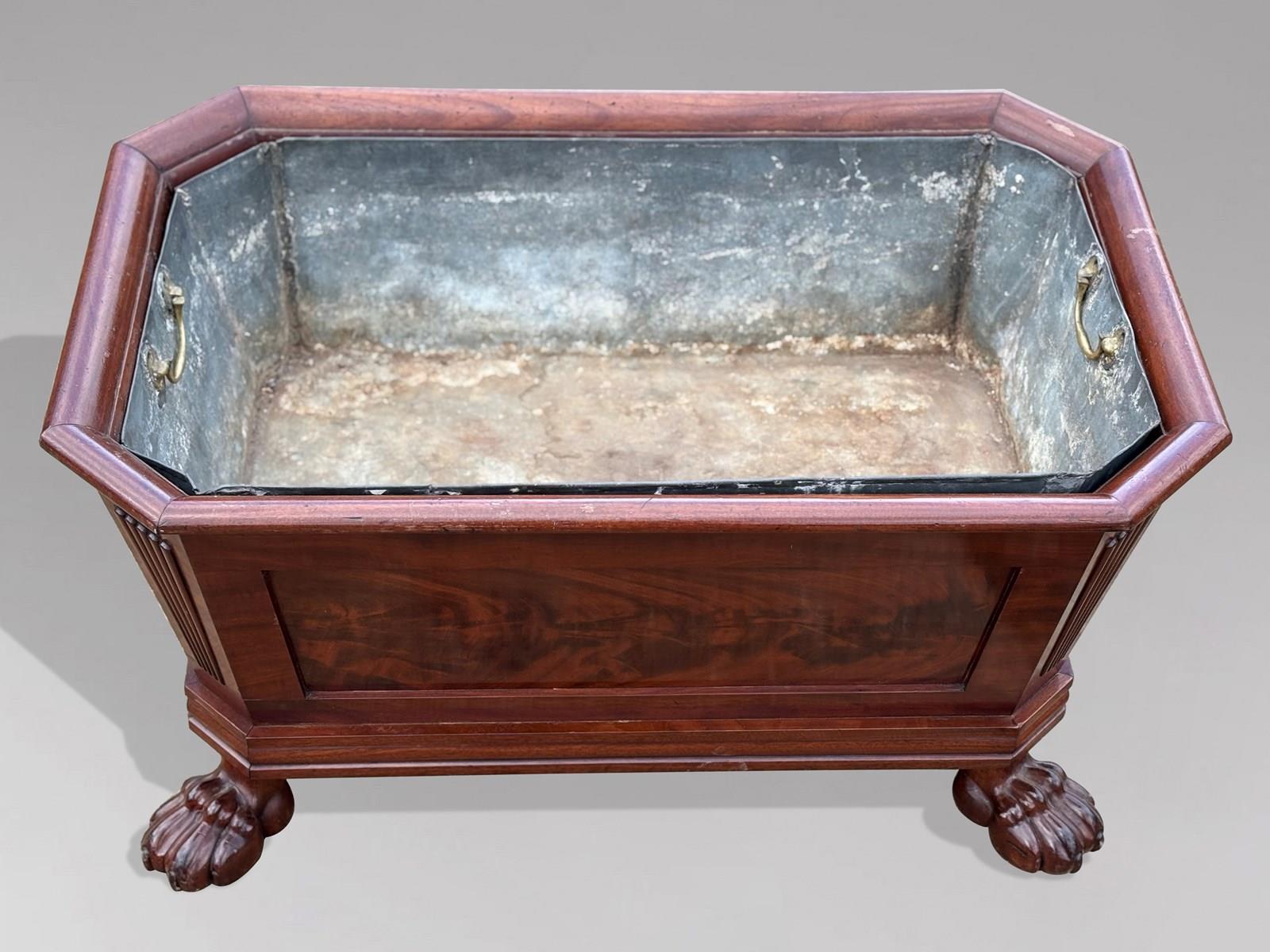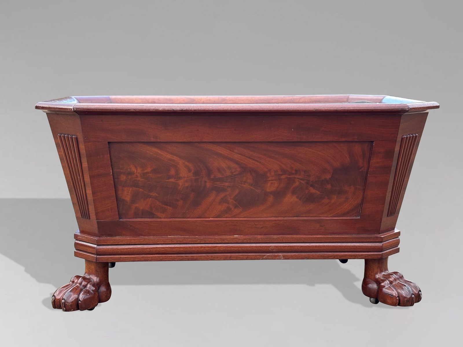 Inside, the original zinc (or lead) liner with a pair of brass swan neck handles remains intact, a mark of both quality and authenticity. The overall form, use of richly figured mahogany, and the distinctive carved paw feet are closely associated with leading Regency cabinetmakers such as Gillows of Lancaster London, to whom comparable examples are often attributed.