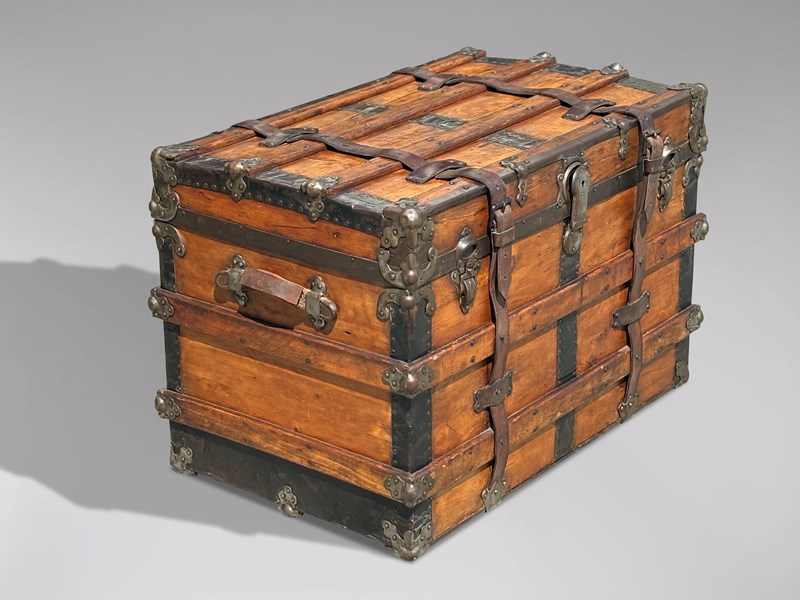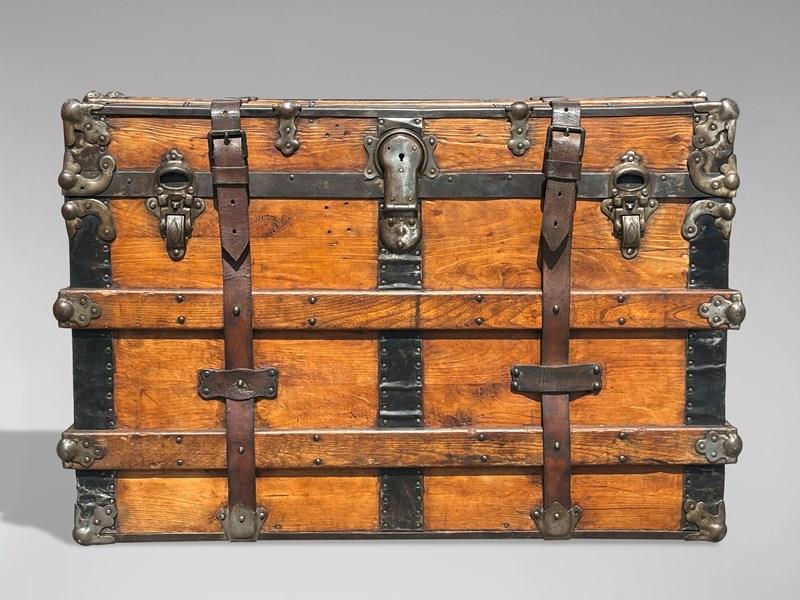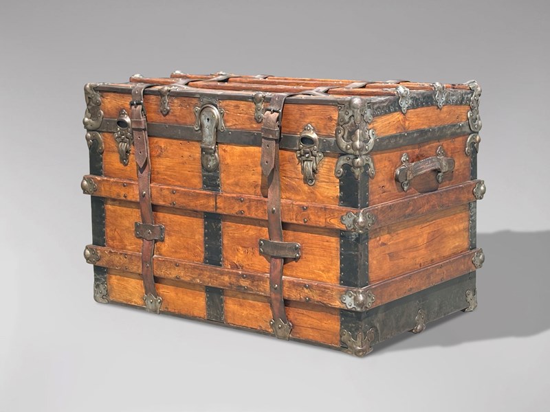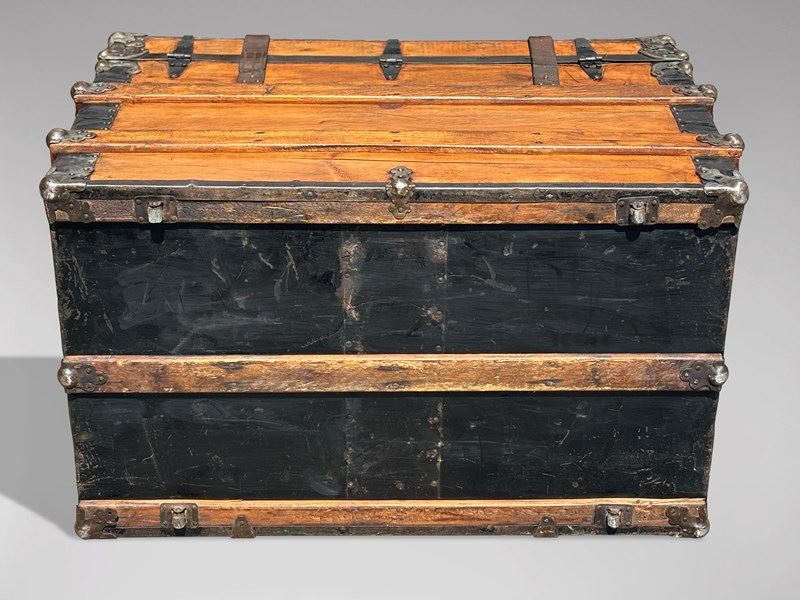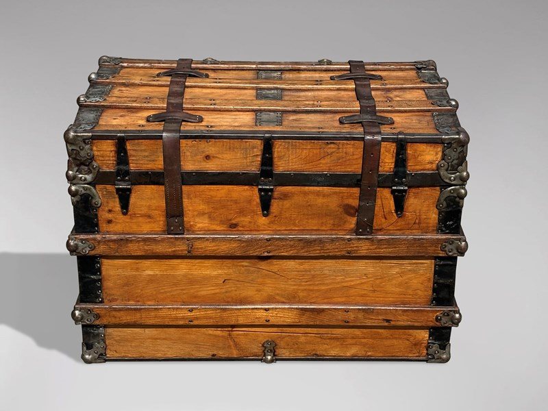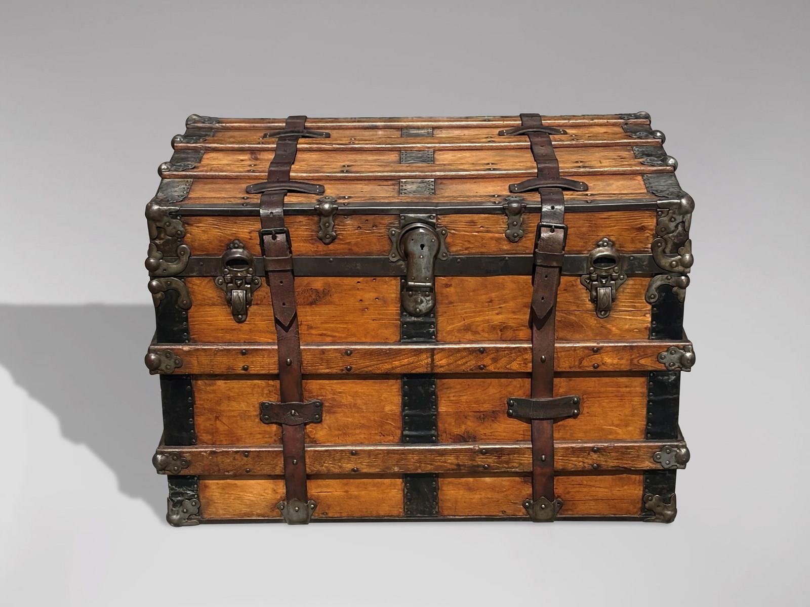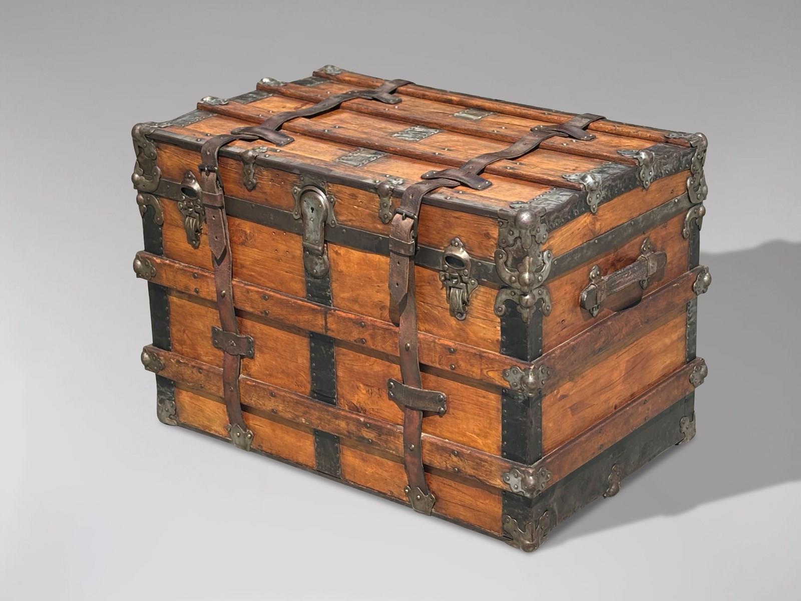 This 19th-century English pine and iron-bound shipping trunk dates to the mid-Victorian period, circa 1870. It features a superb presentation that highlights its distinctive and versatile design, showcasing a desirable aged patina and remaining in good original condition.