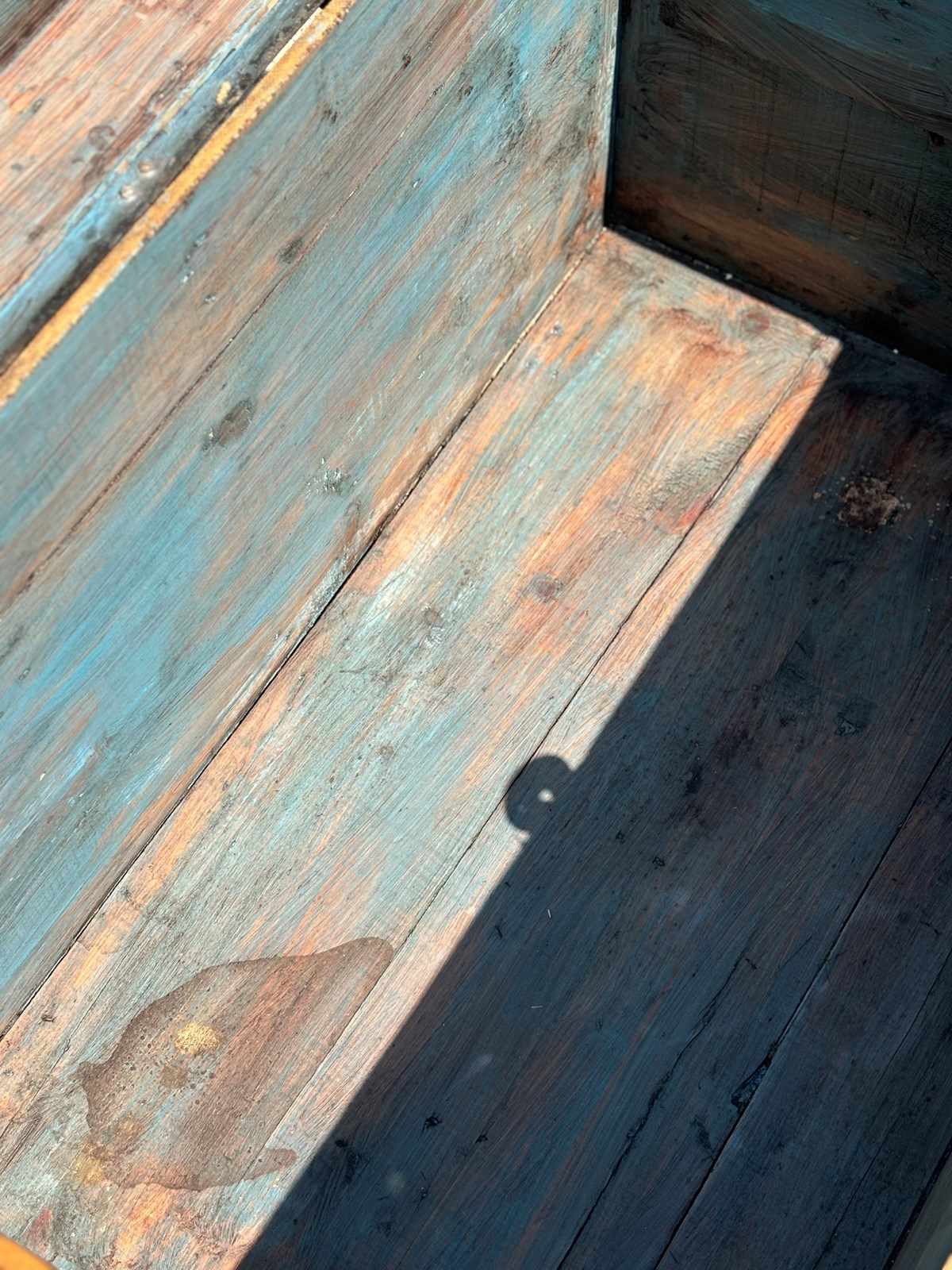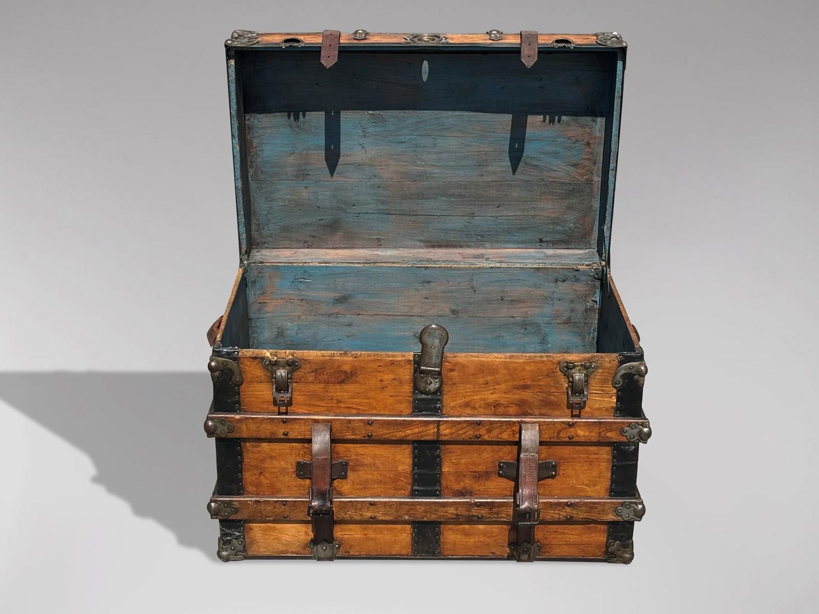 The stained pine exhibits fine grain interest and deep caramel hues, while the trunk is bound throughout with cast iron straps and braced with sturdy pine supports. Please note that the lock is not functioning, and the key is absent. The painted interior offers generous storage space, making it practical for various uses. The trunk is equipped with a pair of thick leather handles for easy transport and stands upon four small iron castors, set at each corner for enhanced mobility. The hardware is original and in great shape, while the original leather handles and straps are also well-preserved. The top corners are protected with beautifully contoured hardware that wraps around for added durability. The hardwood slats are similarly protected with classic hardware.