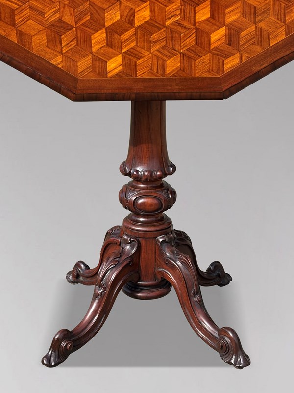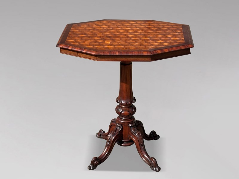 A magnificent 19th-century Victorian period walnut tilt-top occasional table of superb quality, dating from around 1860. The oblong octagonal top has moulded and banded edges, with a striking parquetry centre inlaid in a contrasting geometric design. The top is raised on a finely turned and carved pedestal with four splayed carved legs, richly decorated with floral relief carving and a central turned finial to the underside. A snap-release tilt mechanism allows the top to be folded upright, making it practical both for use and for display. Exquisitely detailed and presented in immaculate condition, this table retains its entirely original colour and patina, with a deep polish and warm, characterful glow that only well preserved 19th century furniture develops over time. Structurally sound and in excellent original order throughout, it is a piece of clear, top tier Victorian craftsmanship.