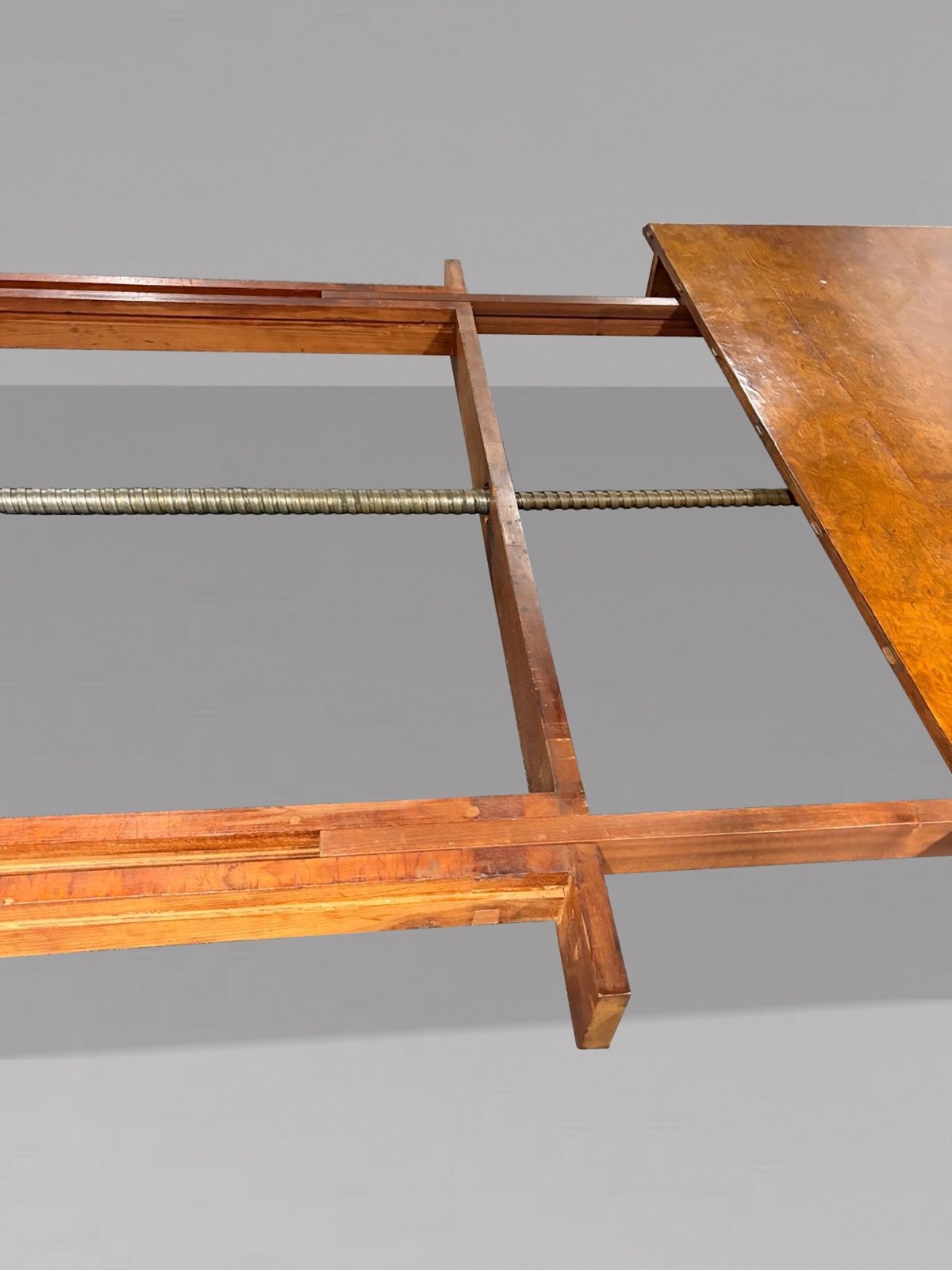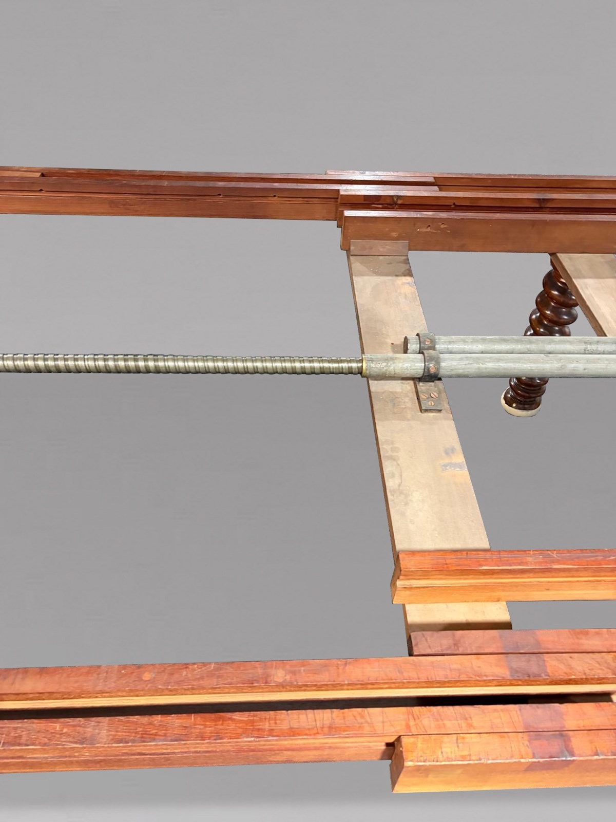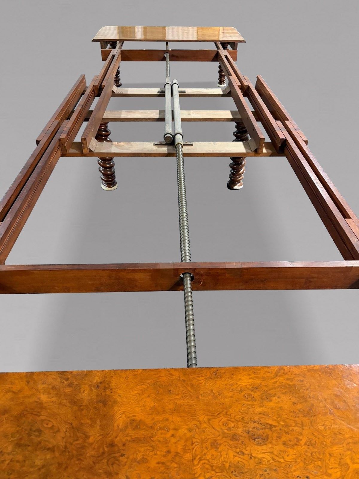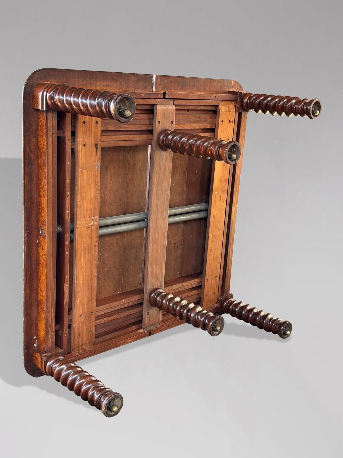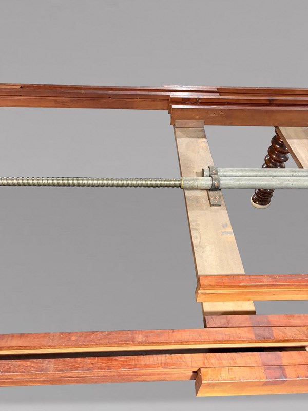 Of superb quality throughout, this impressive table is constructed in richly figured pollard oak with a deep, warm patina. The moulded rectangular top with gently rounded corners rests on six bold spiral turned legs, each terminating in its original large brass castors. The table is fitted with its original double screw expander winding mechanism, which operates smoothly to extend the table to its full, very rare length of approximately 600 cm.
