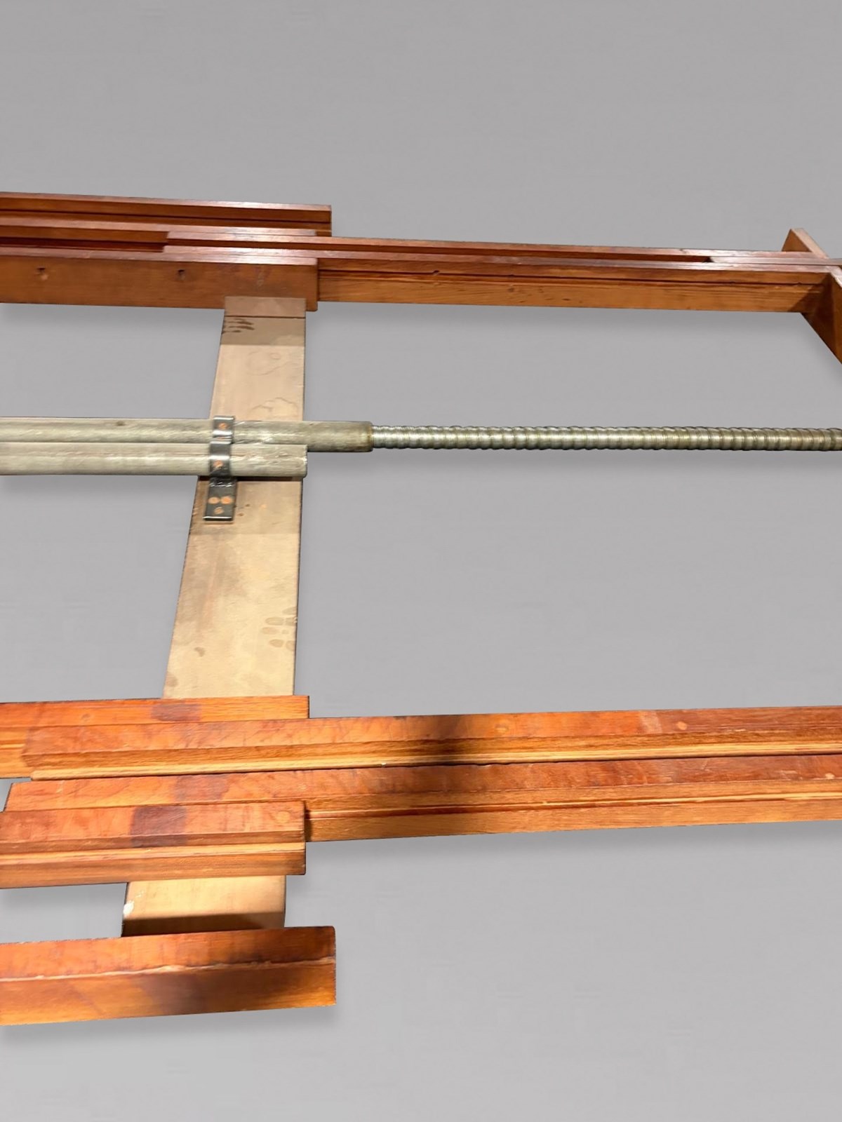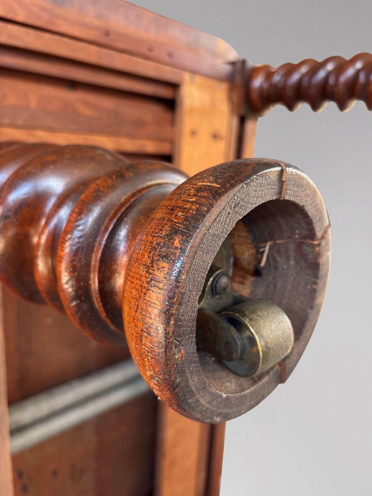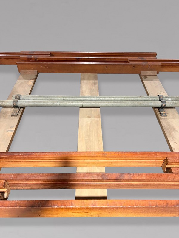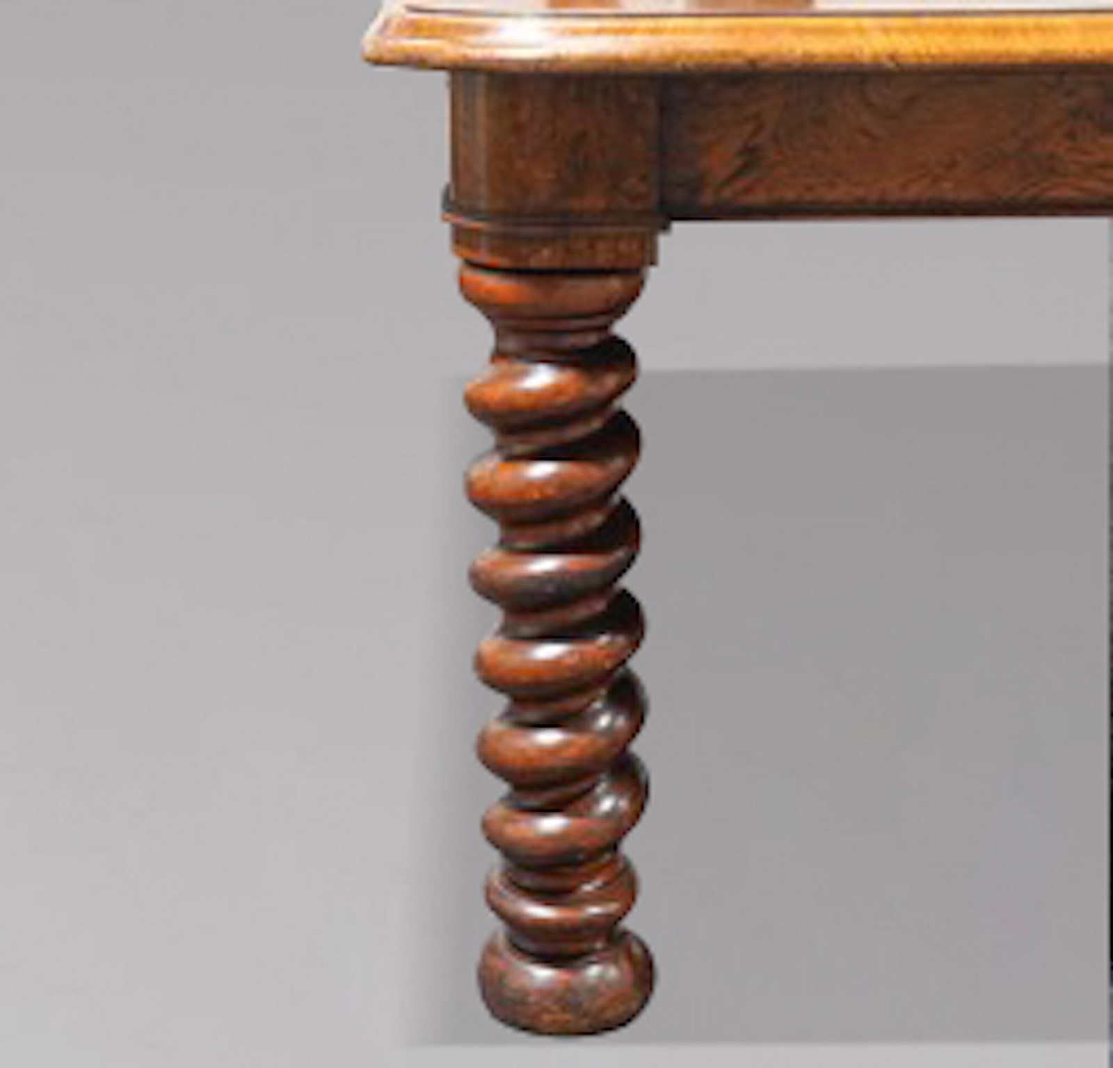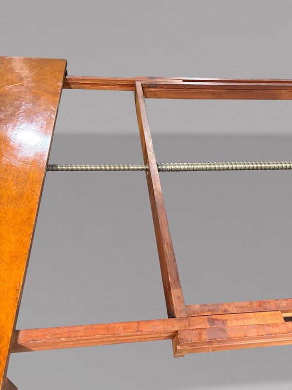 Of superb quality throughout, this impressive table is constructed in richly figured pollard oak with a deep, warm patina. The moulded rectangular top with gently rounded corners rests on six bold spiral turned legs, each terminating in its original large brass castors. The table is fitted with its original double screw expander winding mechanism, which operates smoothly to extend the table to its full, very rare length of approximately 600 cm.