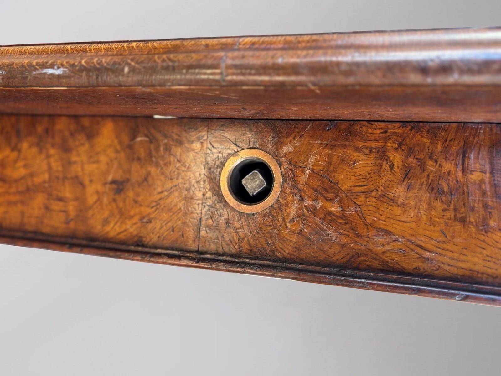 Each side of the base is stamped “Gillow”, confirming its manufacture by one of the most renowned English cabinetmaking firms of the 19th century. Gillows pieces of this scale, in pollard oak, with full original leaves and mechanism intact, very seldom appear on the market.