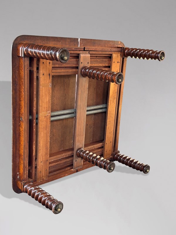 Dating from circa 1850, this table is in excellent original condition, with beautifully figured pollard oak top with a rich, even patina, original double winder mechanism in good working order, seven original matched leaves (extremely rare for a table of this length) and six original turned spiral legs with large brass castors.