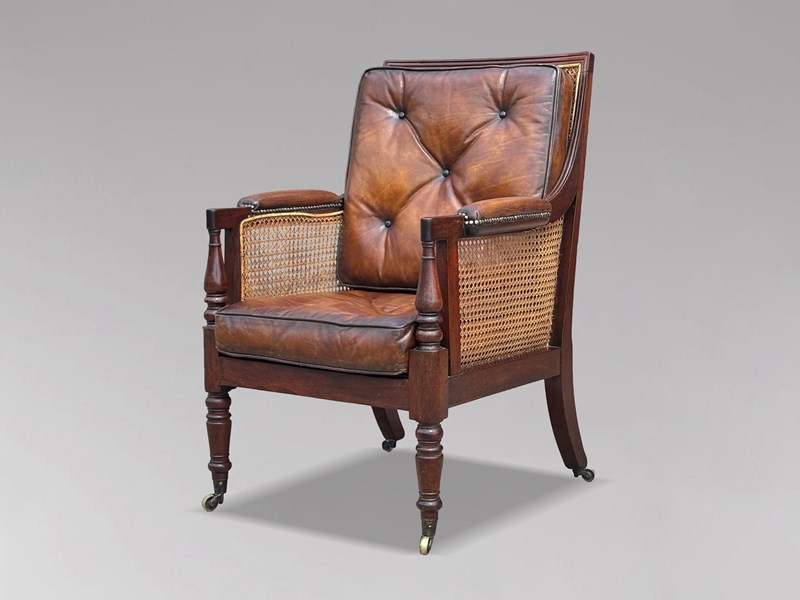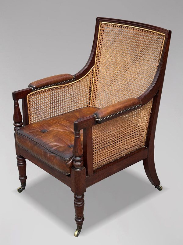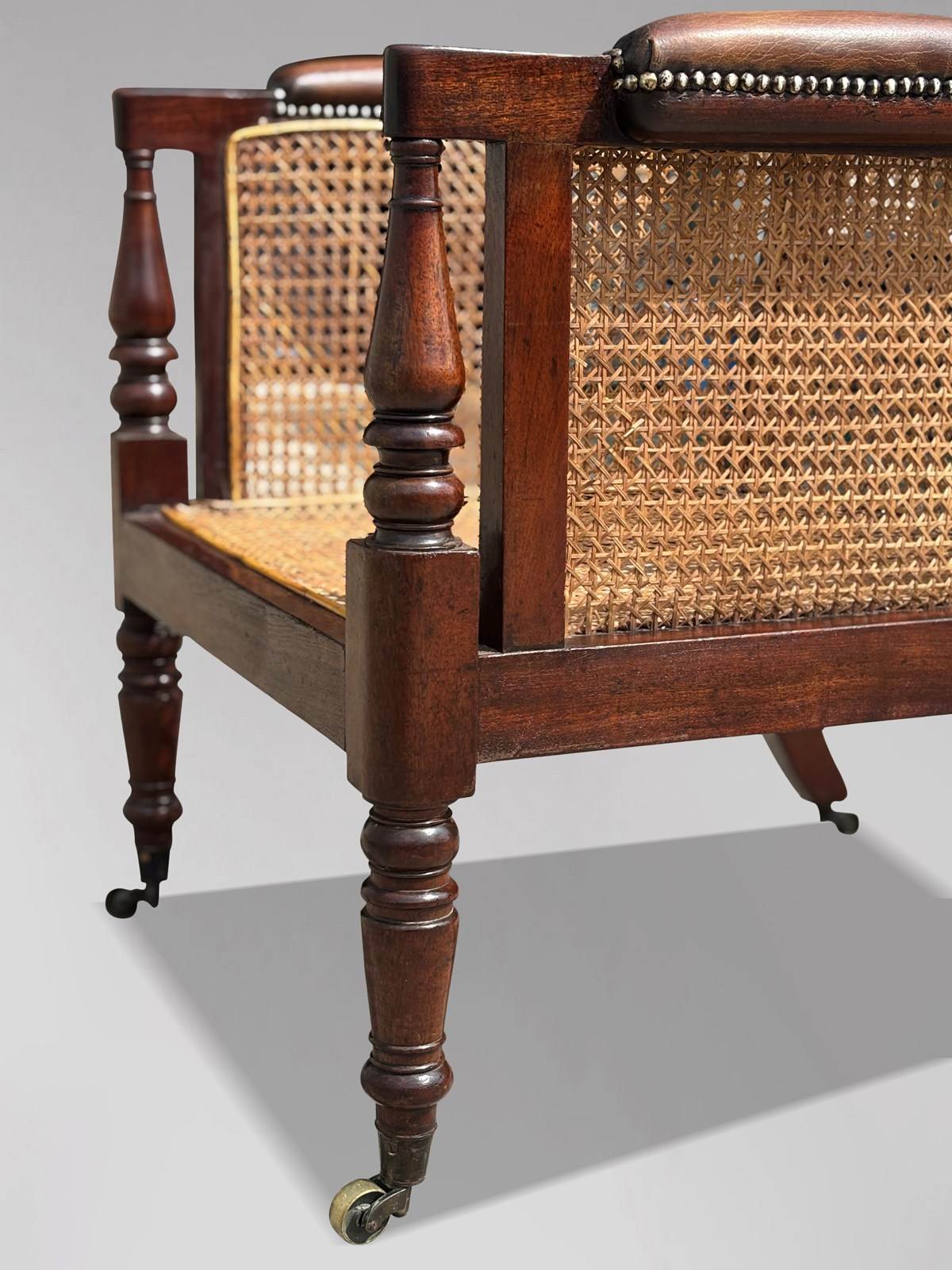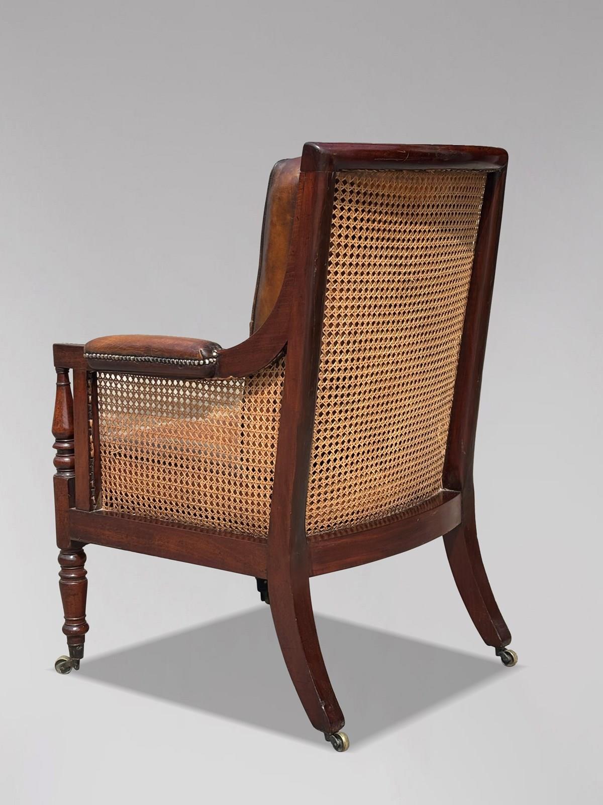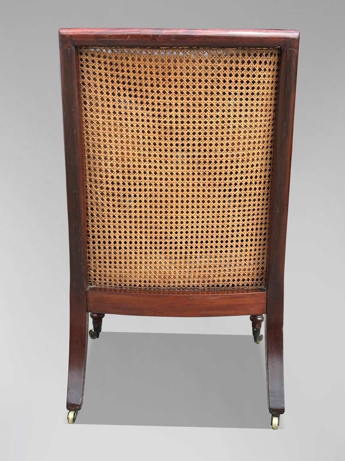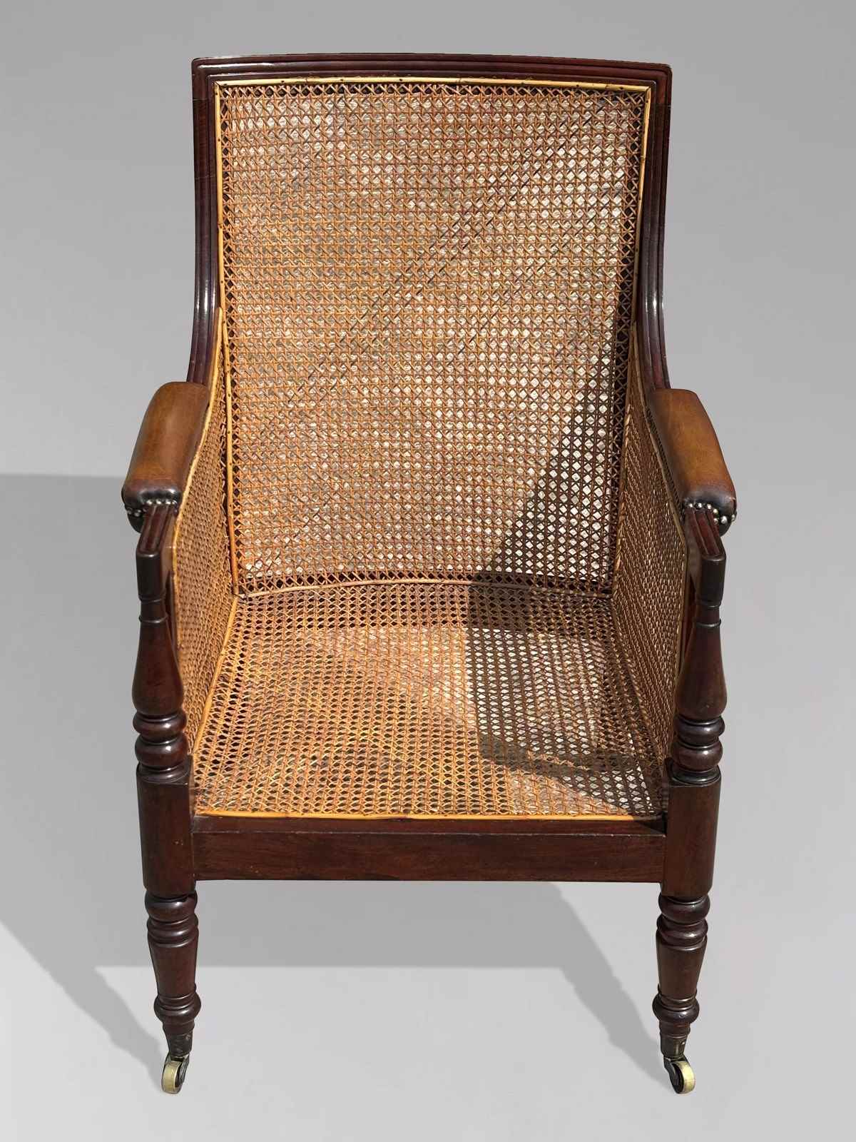 This exquisite early 19th-century George IV period mahogany caned library bergère armchair is a fine example of the craftsmanship and elegance of its time. It features a beautifully caned back, arms, and seat, and is supported by elegant turned front legs and arm supports, all resting on original brass castors.