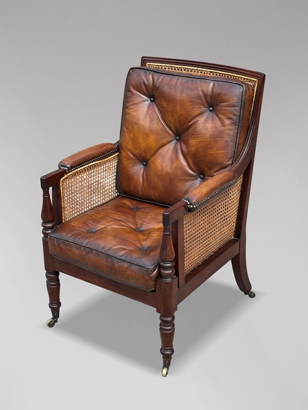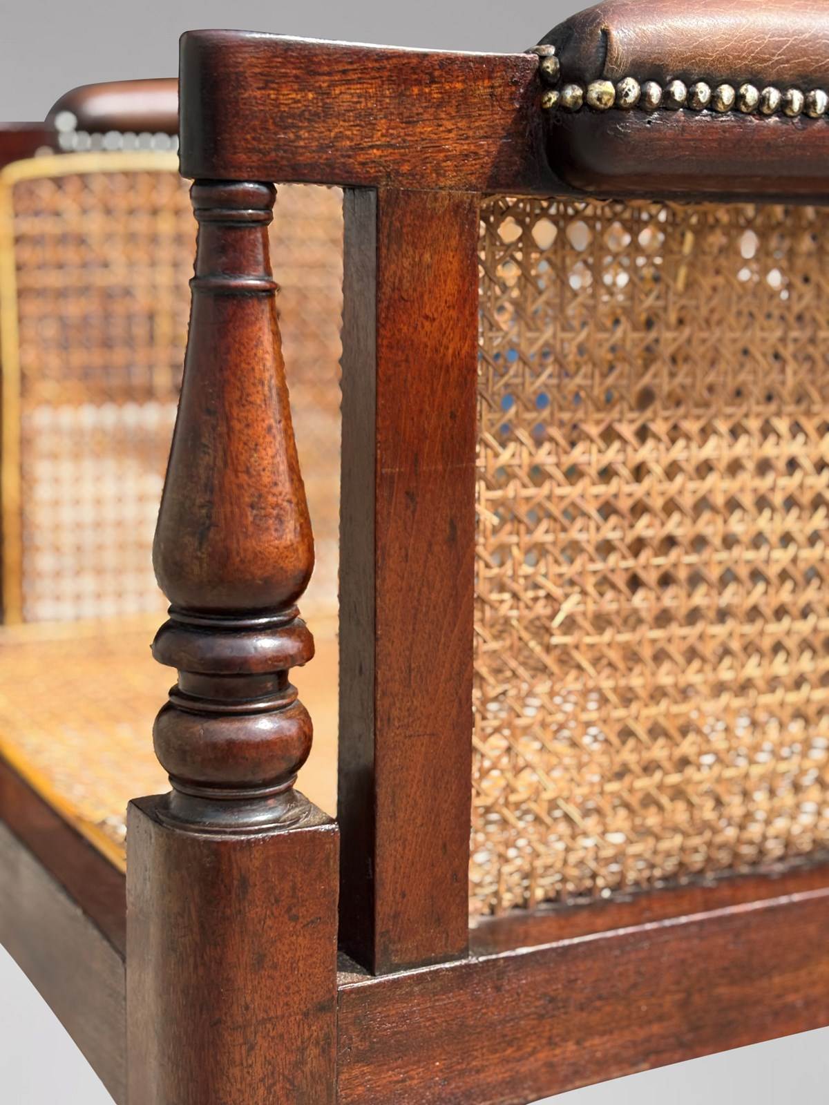 The chair showcases stunning quality mahogany and original brown leather, reflecting its rich history and craftsmanship. Equipped with leather squab cushions and arm pads adorned with float buttons, this bergère offers both style and comfort. The chair retains its original colour and patina, along with caning on the sides, seat, and back, ensuring it remains a standout piece in any setting.