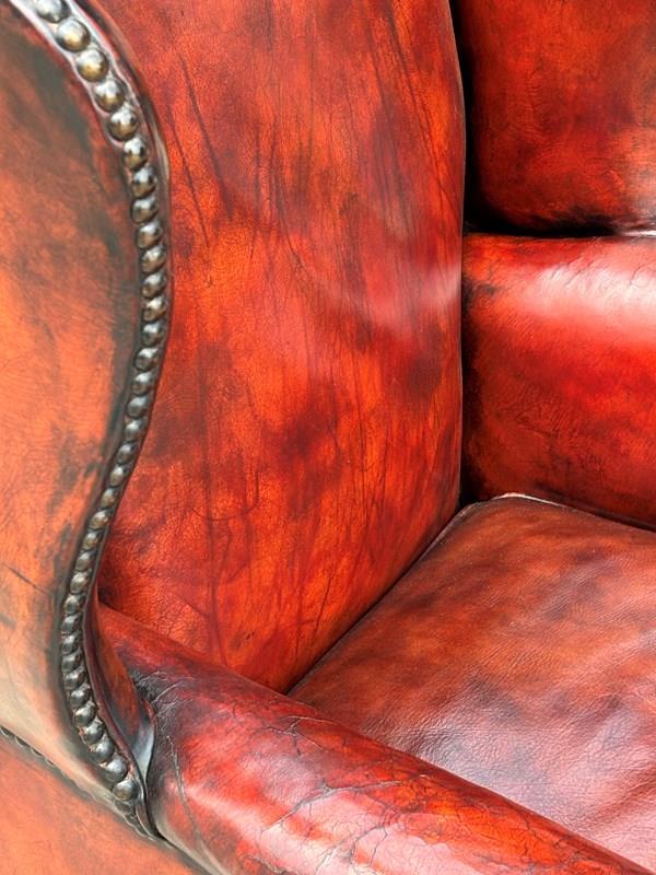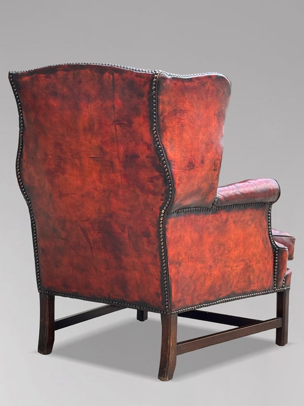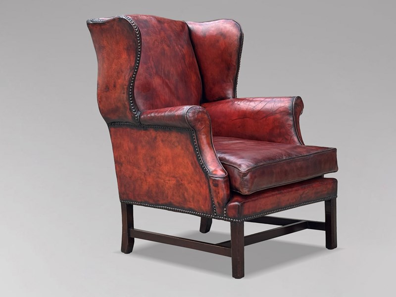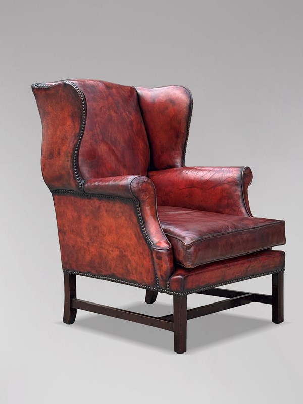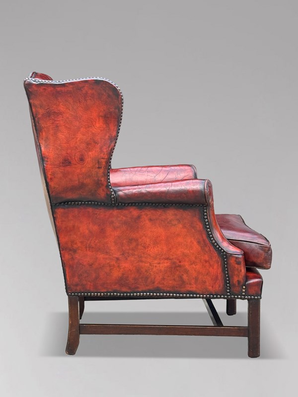 This handsome and larger scale George III period wing back library armchair has recently been finely reupholstered in burgundy leather which has been hand finished to give a well patinated look. The substantial, well-shaped frame features an upholstered back, and arms, all covered in the original burgundy red leather. The chair boasts scrolling arms, a sprung loose cushion seat, and close-nailed brass stud detailing. The chair stands on square moulded mahogany legs connected with stretchers. The frame is in good solid condition and the chair has a good seat height and is very comfortable to sit in and will give many years of good service before ever needing to be reupholstered again. The chair has a beautiful colour and rich patination, and it is very comfortable. It is in superb condition with no damage or repairs. The chair seat height is 45cm. This armchair offers both comfort and aesthetic charm. English circa 1790