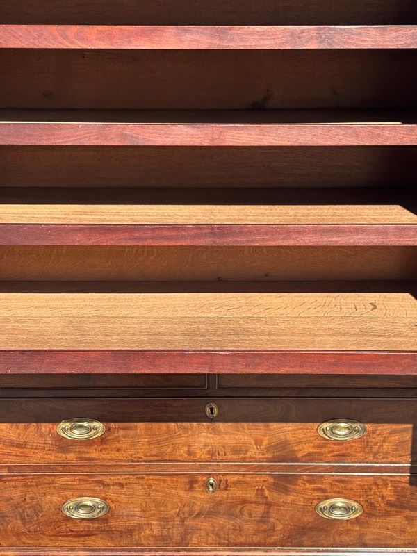 This beautiful late 18th-century piece is constructed from richly grained mahogany, showcasing magnificent colour and stunning figuring throughout. The linen press features a moulded dental cornice with a plain frieze, sitting above panelled doors adorned with flame mahogany. The spacious upper section is fitted with five oak-lined pull-out trays, perfect for storing linens or garments with ease.