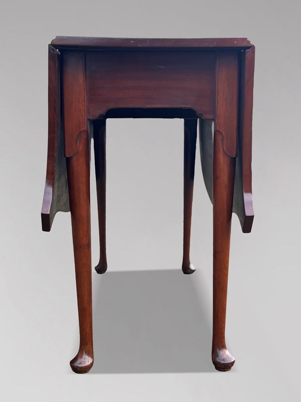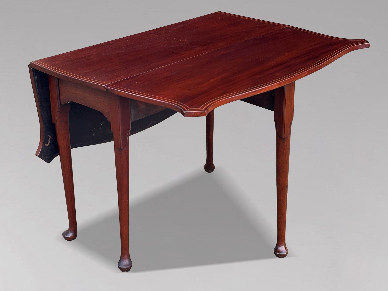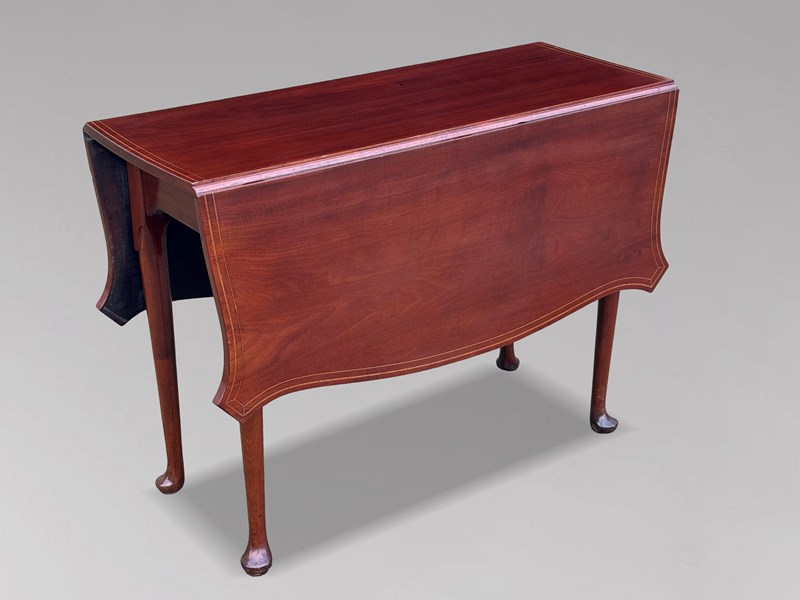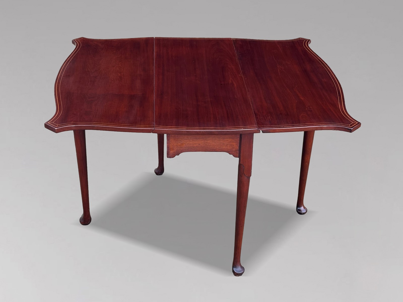 A handsome late 18th-century George III period mahogany drop-leaf dining table, retaining its original, beautifully shaped, figured solid tops. The rectangular top has drop leaves on either side, outlined with fine satinwood marquetry stringing, providing excellent versatility for both everyday use and entertaining. The leaves are supported by sturdy hinged gate cabriole legs with pad feet, ensuring stability and ease of use. The rich colour and enticing patina give the piece a timeless allure, adding depth and character to any room.