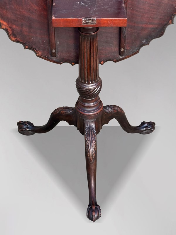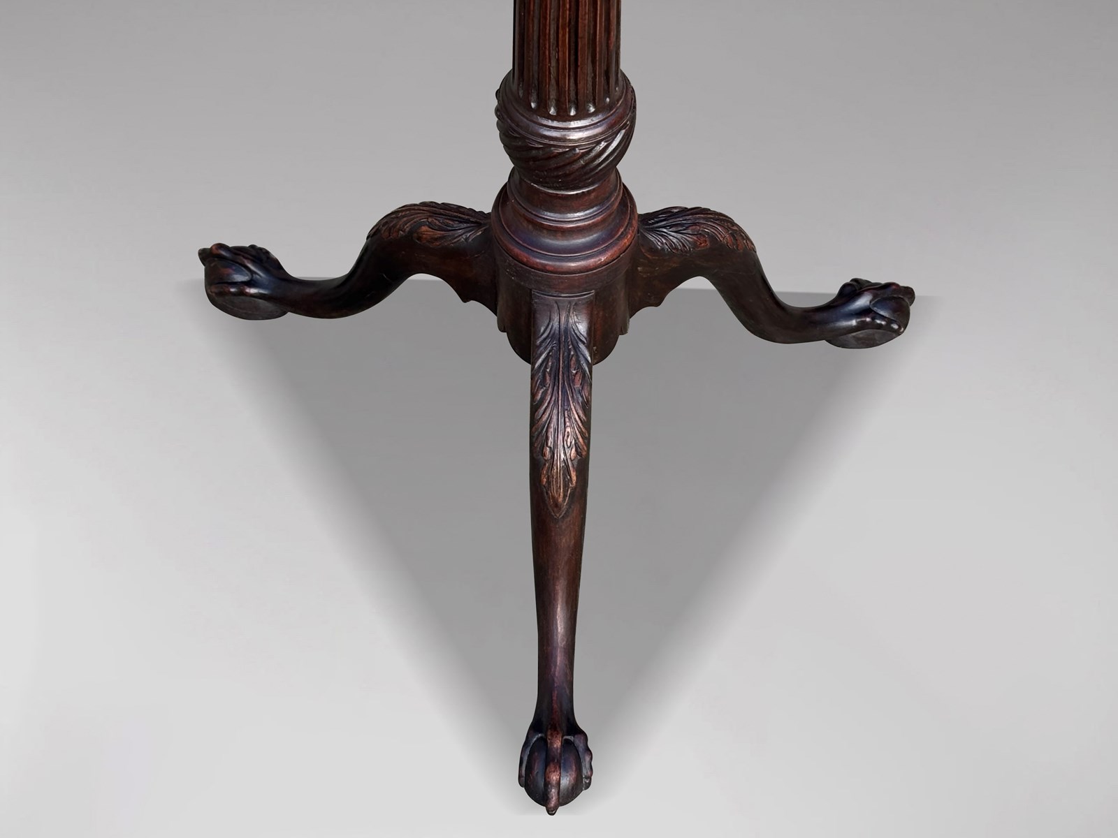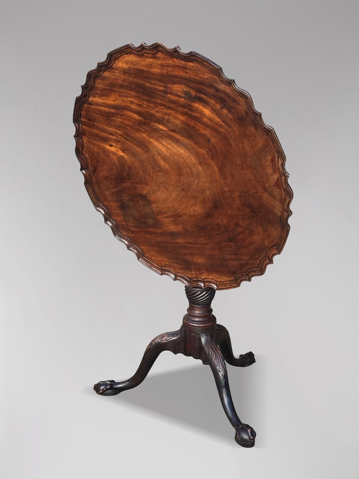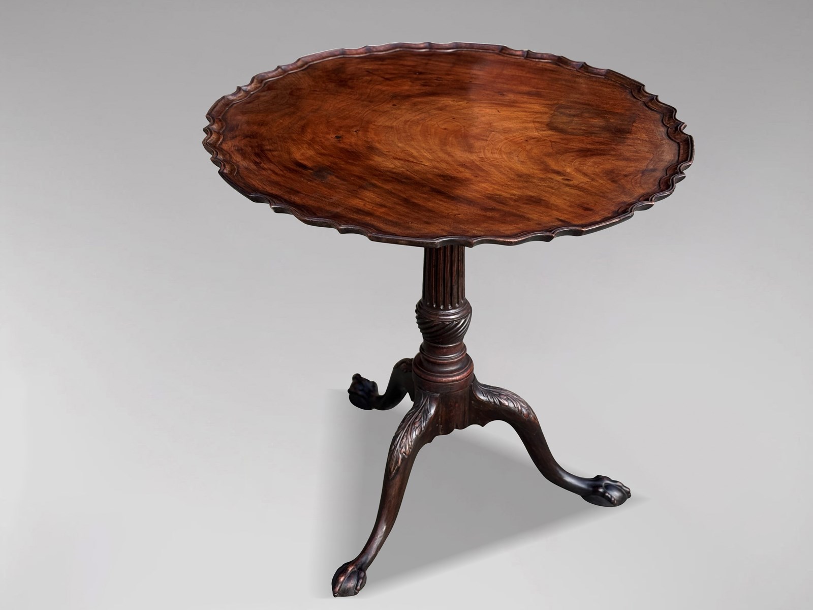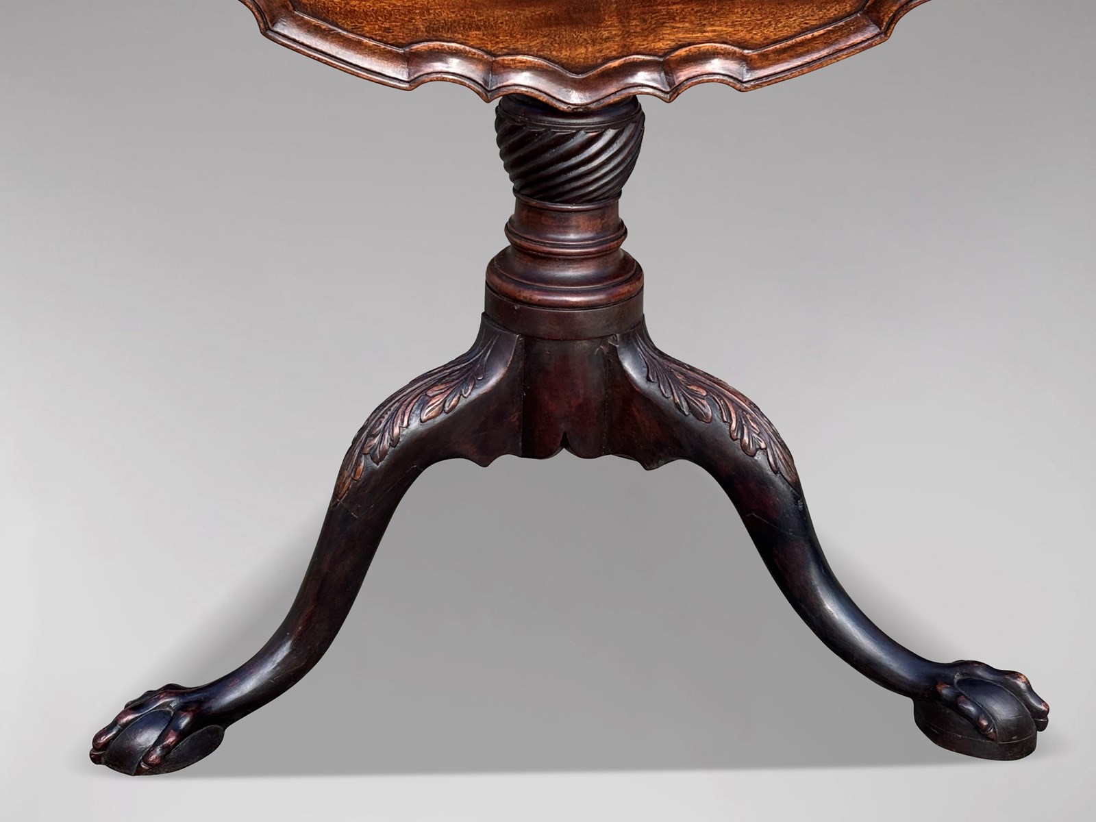 A very fine 18th-century George III period mahogany tripod table. This table consists of a solid well figured mahogany tilt top, with pie-crust edge, above a turned baluster-form column. This fine quality Georgian table is raised on well-drawn outswept carved cabriole legs that terminate in fine ball and claw feet, retaining a good original colour and rich patination. The tilt-top includes the original catch and dates to circa 1770.