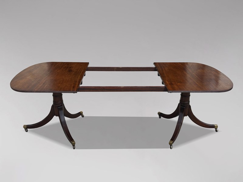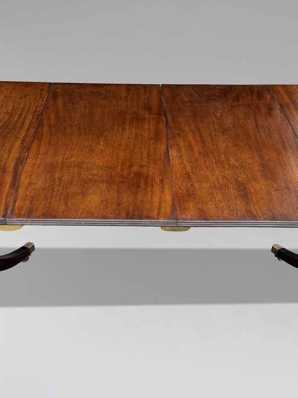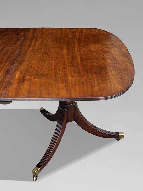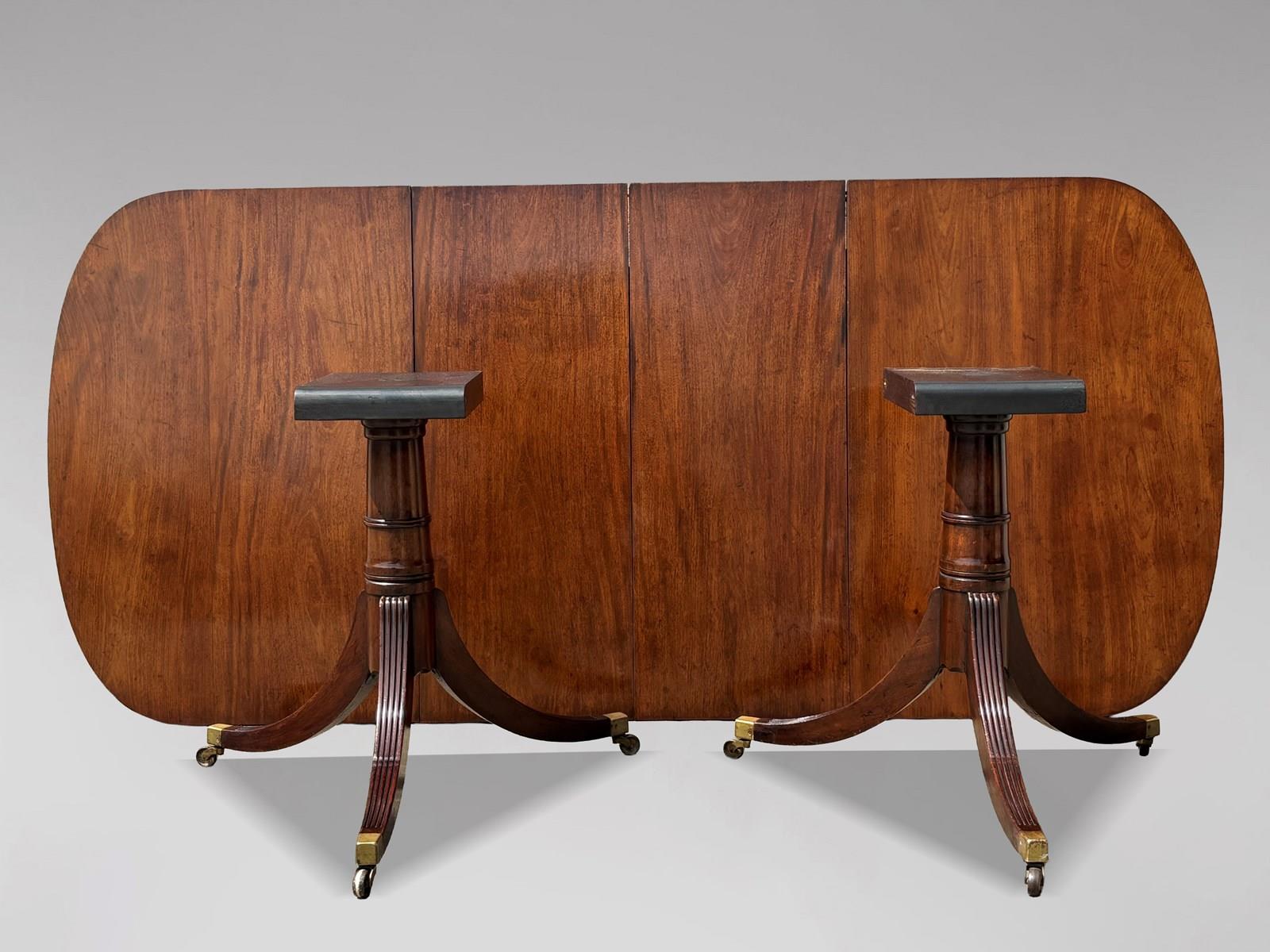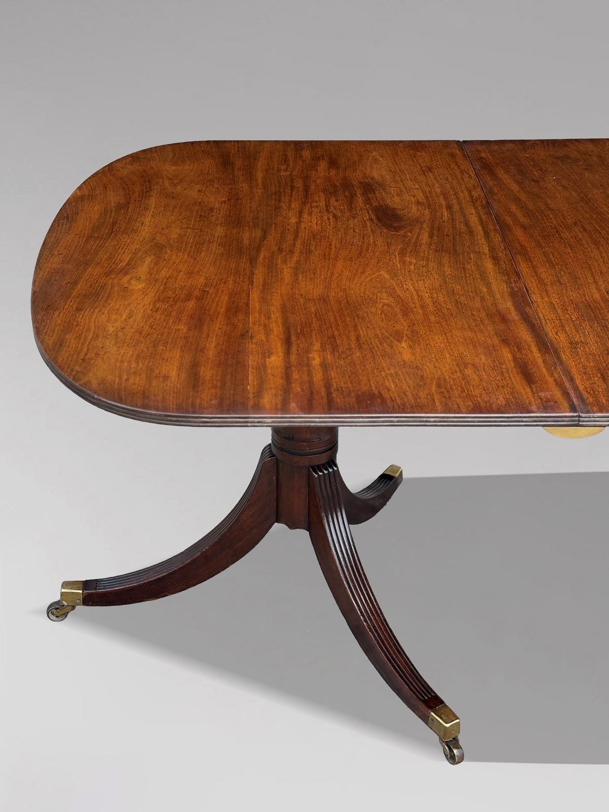 A good quality elegant early 19th-century late Georgian extending mahogany dining table. It features a solid mahogany rectangular top with a reeded edge, raised on a pair of beautiful gunbarrel turned pillars with three outswept sabre legs terminating in brass castors. The table includes two D-shaped end sections and two extra original leaves (43cm), allowing it to extend to accommodate more people (8 seater). The solid Cuban mahogany has great quality and colour. England, circa 1820.