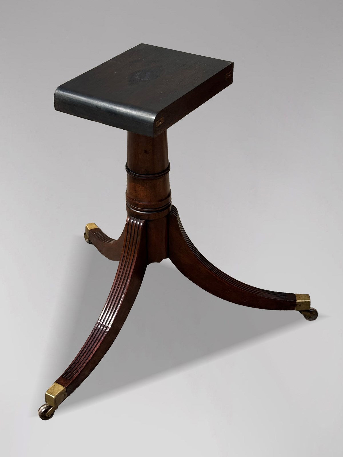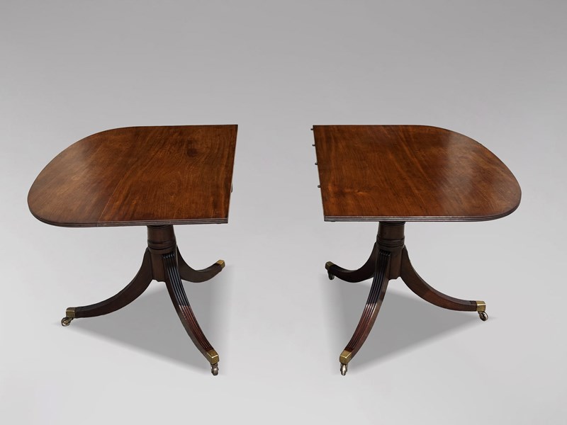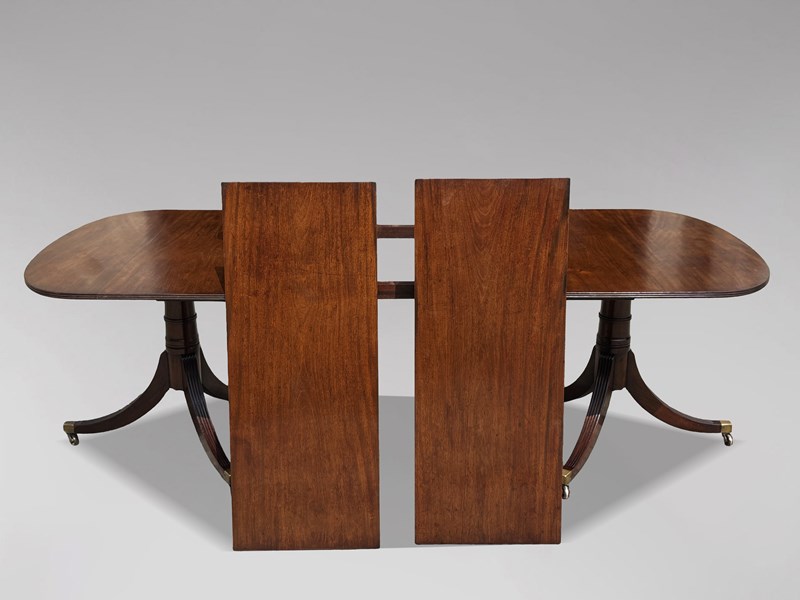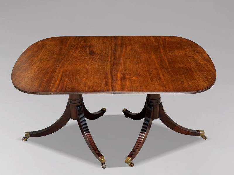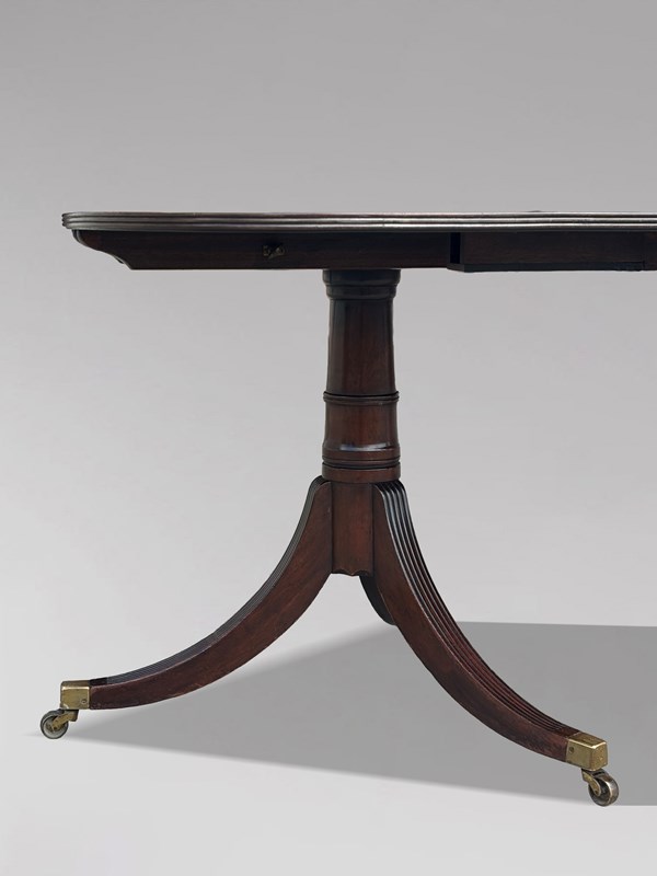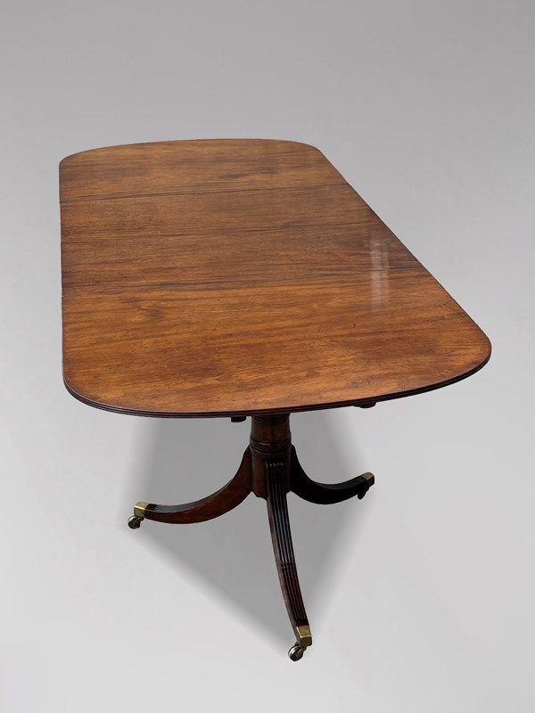 A good quality elegant early 19th-century late Georgian extending mahogany dining table. It features a solid mahogany rectangular top with a reeded edge, raised on a pair of beautiful gunbarrel turned pillars with three outswept sabre legs terminating in brass castors. The table includes two D-shaped end sections and two extra original leaves (43cm), allowing it to extend to accommodate more people (8 seater). The solid Cuban mahogany has great quality and colour. England, circa 1820.