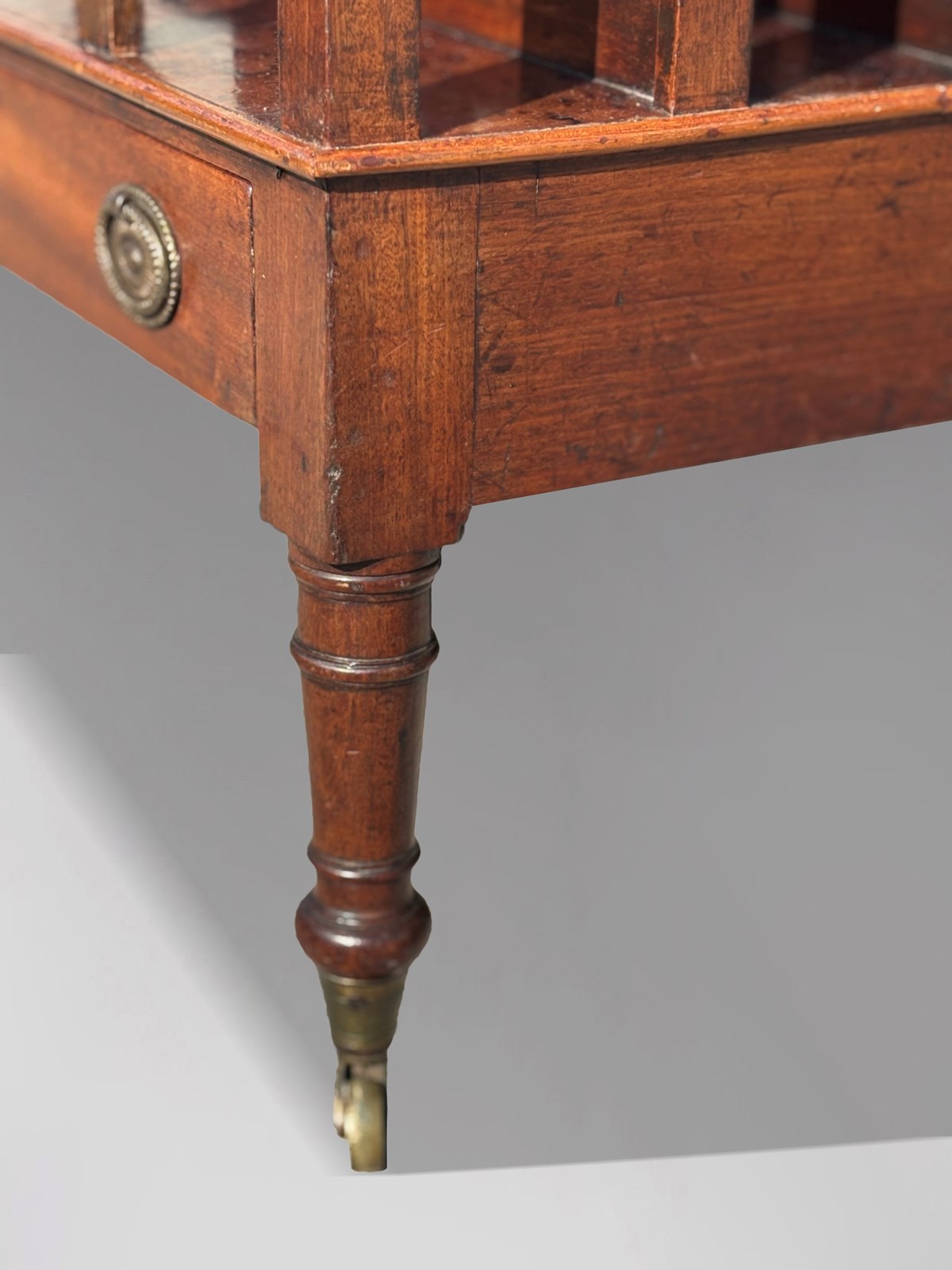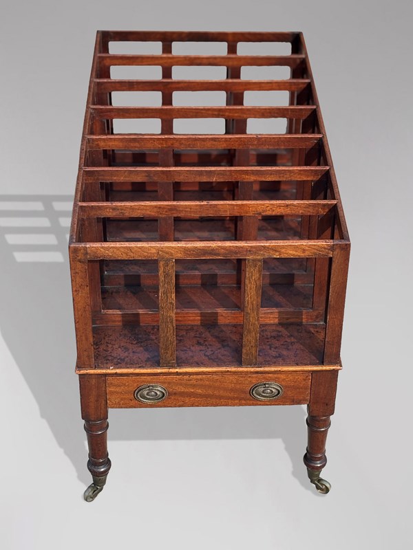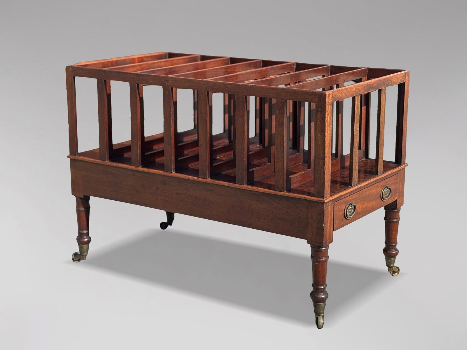 Introducing a stunning, rare and high-quality early 19th-century late George III period mahogany Canterbury, also known as a magazine rack. This exquisite piece features seven solid mahogany divisions with simple slatted uprights, perfectly designed for organizing magazines, newspapers, or music sheets.