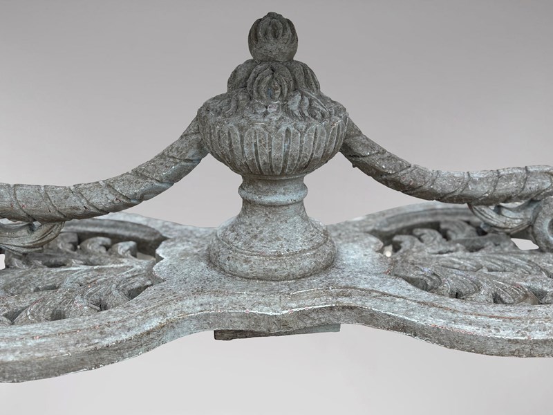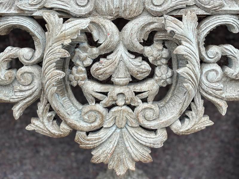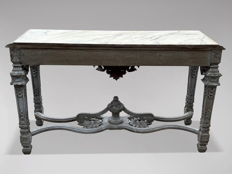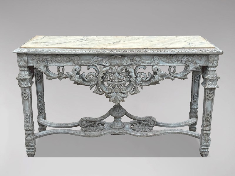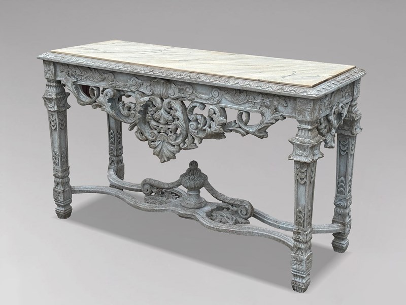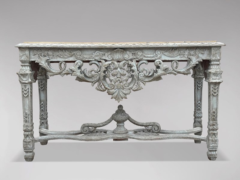 The powerful apron of the console is centered by an outstanding richly foliate carving, finished in a painted burnished style. Intricate scrolled and foliate designs extend outward, leading to elegant block rosettes. Each side of the console is embellished with central carvings and additional scrolled foliate elements. The top has a painted faux marble top with protruding corners and a finely mottled border, enhancing its grandeur and sophistication. This console is not only a testament to the exceptional craftsmanship of the Louis XIV style but also a statement piece that will elevate any interior with its intricate details and majestic presence.