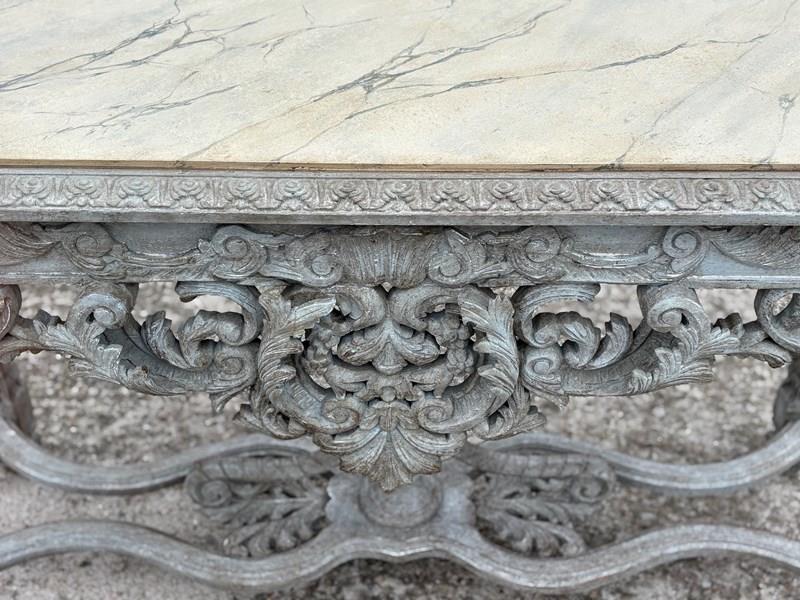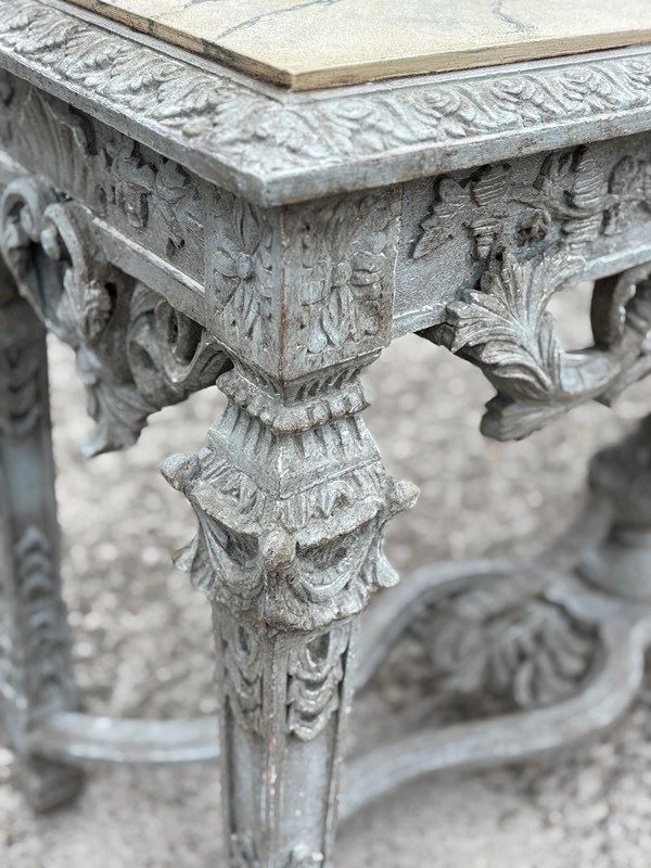 A Very Decorative French Louis XIV Style Carved Painted Faux Marble Top Hall Console Table