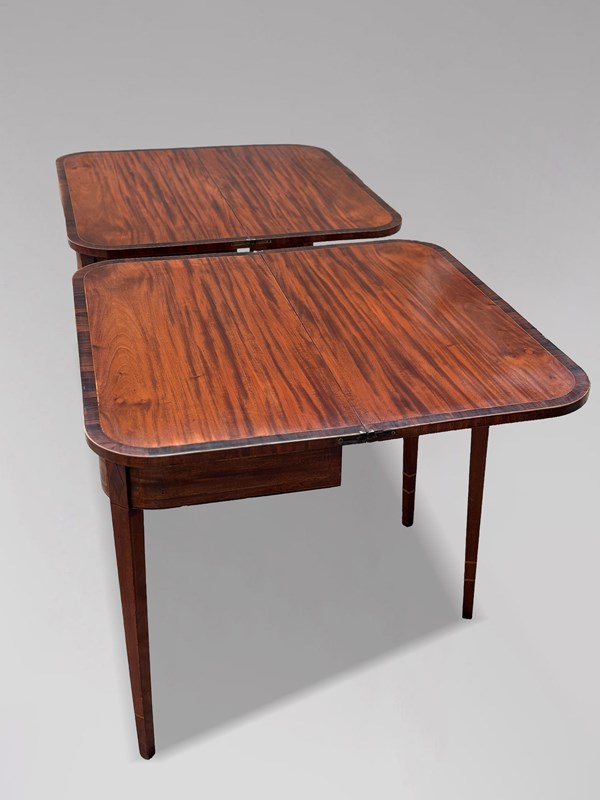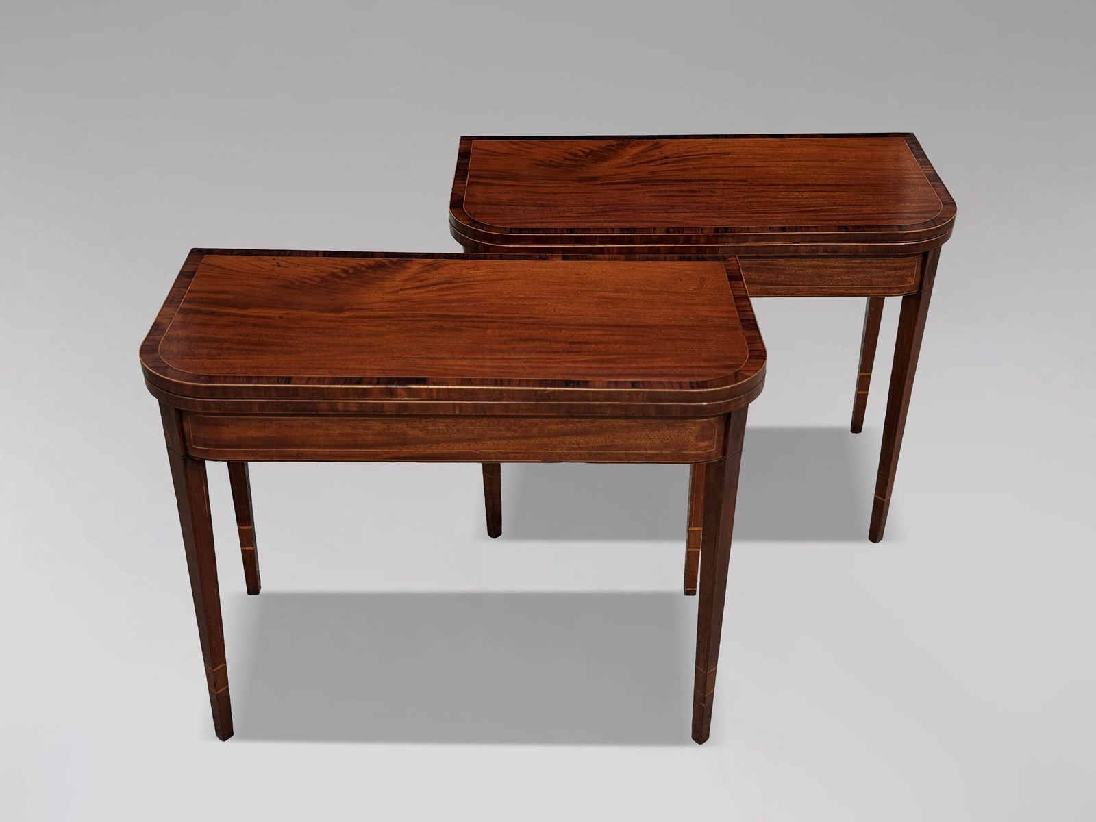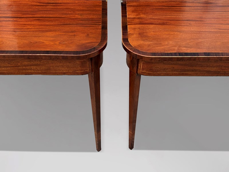 A stunning pair of late 18th-century George III Period mahogany and inlay folding console tea tables. Crafted from a finely cut mahogany, these tables boast tops that appear to be hewn from the same piece of timber, creating a seamless grain that flows beautifully from one table to the other. The folding tops feature exquisite satinwood inlay and rosewood cross banding, adding a touch of elegance.