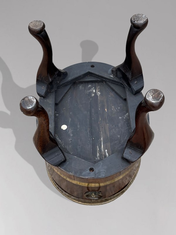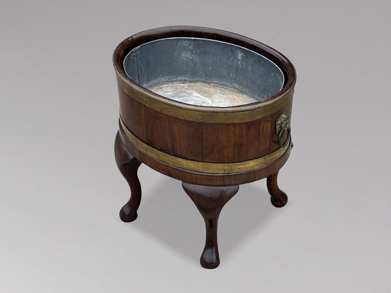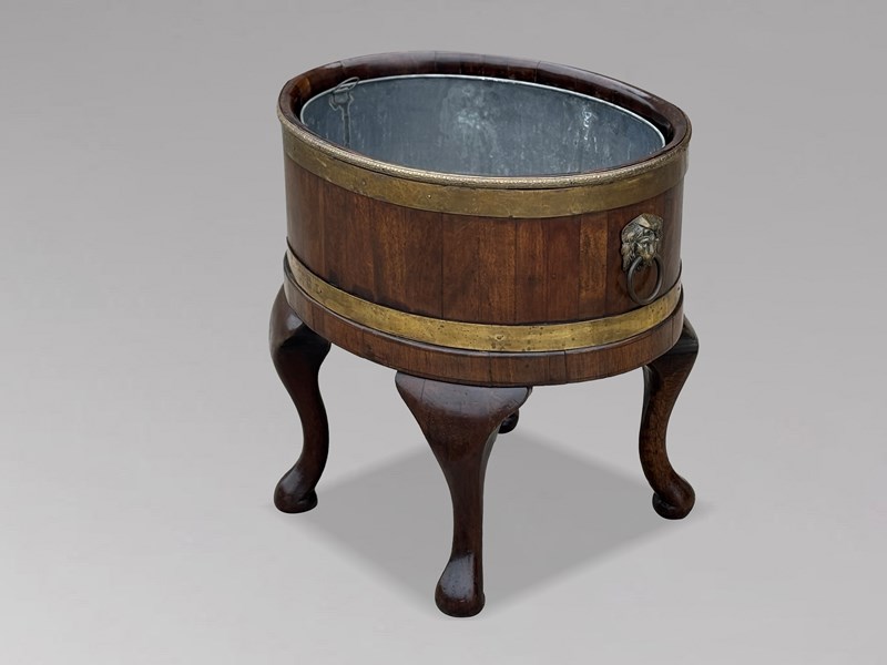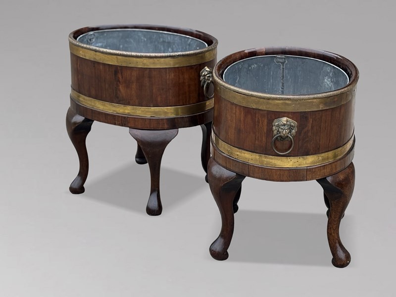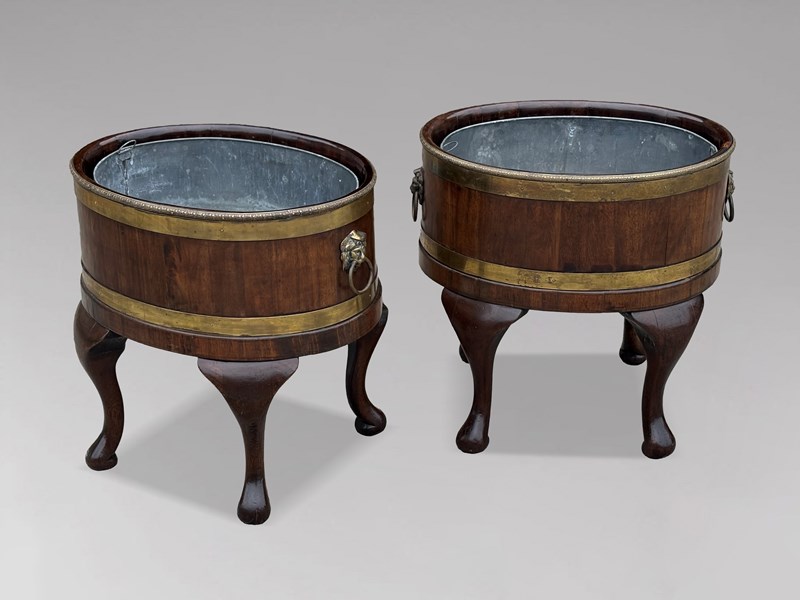 A superb and rare pair of Georgian mahogany wine coolers, exquisitely crafted and retaining their original full-depth lead liners. Each oval cooler features refined brass banding, lion mask ring handles, and graceful cabriole legs - all hallmarks of Georgian craftsmanship at its most accomplished. The deep, lustrous mahogany, enriched by its decorative brass trim, radiates a warmth and refinement that only age and skilled workmanship can produce.The main, solid mahogany body of these cellarettes, or wine coolers, has a decorative brass trim to the top, defining the top, and directly below this there is a deep brass banding. On opposite sides 2 cast brass lifting handles in the form of oval lion mask rings, adorn the main mahogany body. A further deep brass banding is placed above the apron which rests upon elegantly curved cabriole legs terminating with slightly turned under feet. The presence of both original liners, coupled with the fact that they remain a matched pair, elevates their rarity and desirability among discerning collectors.