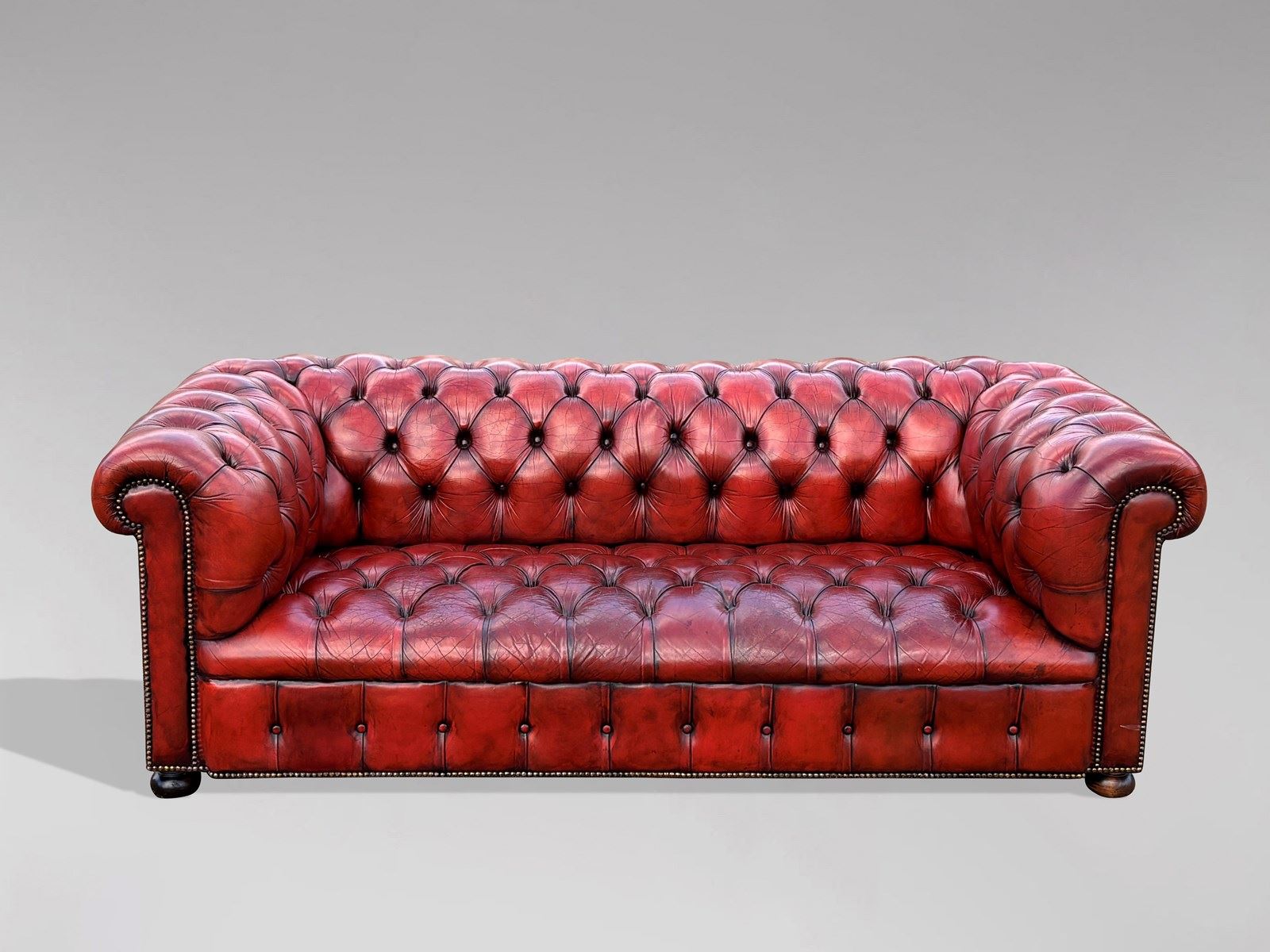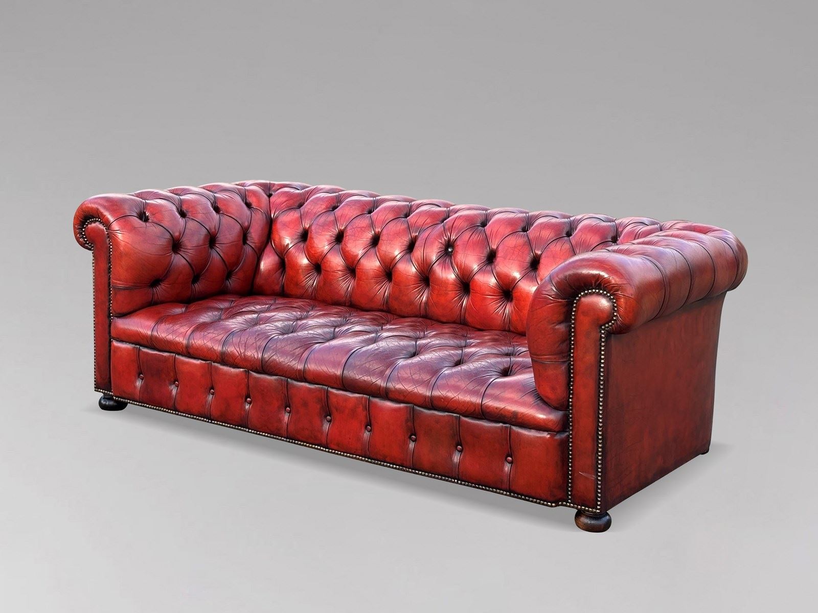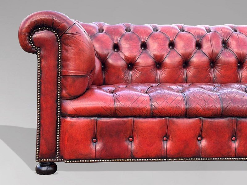 A stunning early 20th-century large three-seater red/burgundy leather button-down Chesterfield sofa. It features the original red leather hide that has been cleaned and polished, giving it a lovely soft and sumptuous feel.
