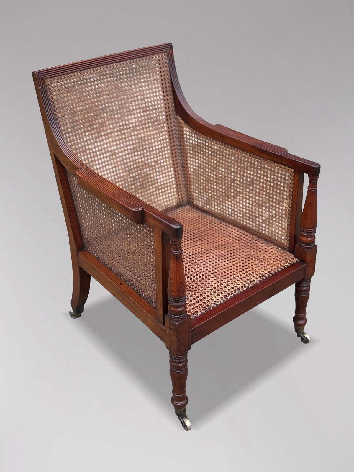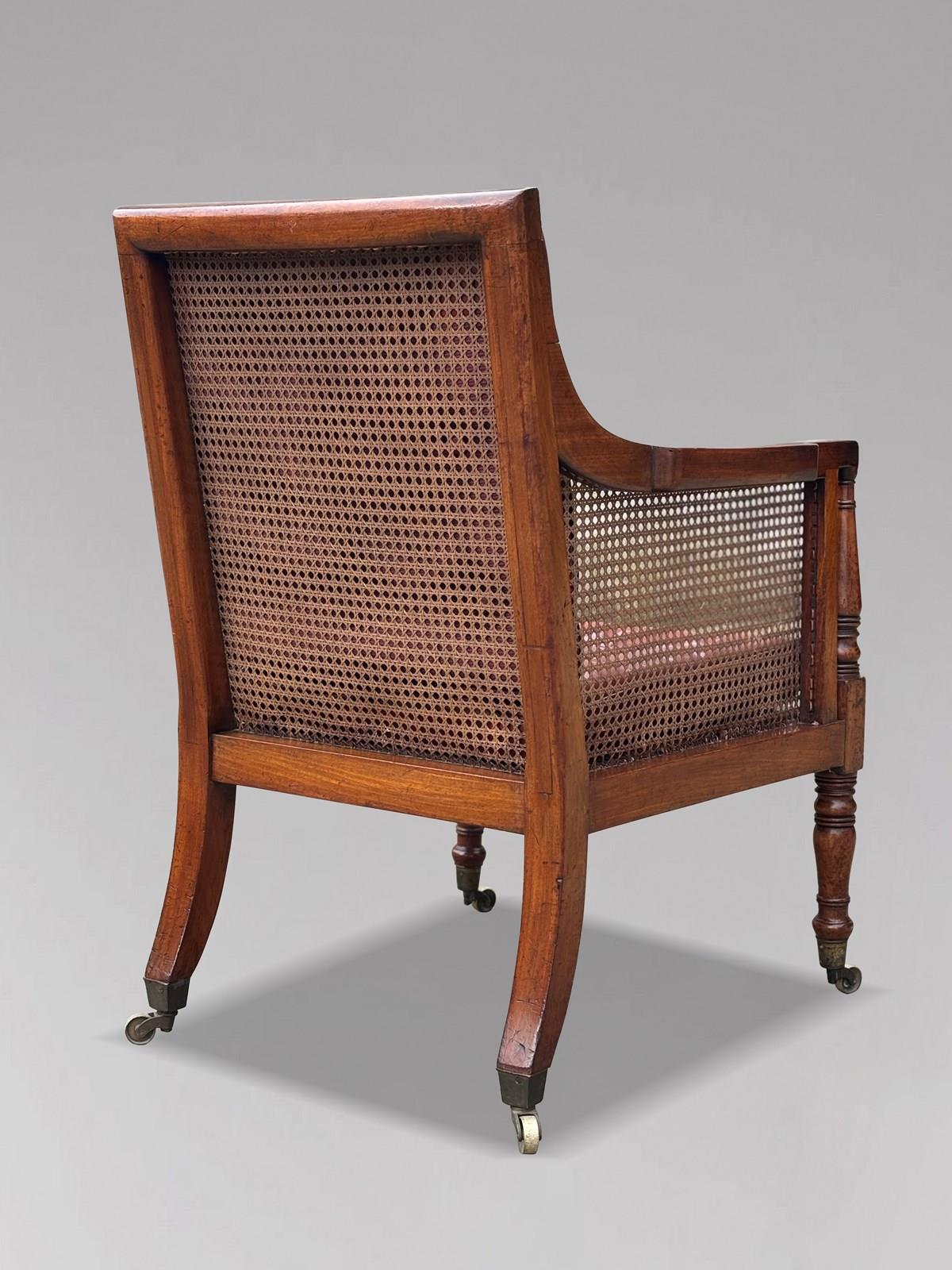 This exquisite early 19th-century Regency period mahogany caned library bergère armchair is a fine example of the craftsmanship and elegance of its time. It features a beautifully caned back, arms, and seat, and is supported by elegant turned front legs and reeded arm supports, all resting on original brass castors.