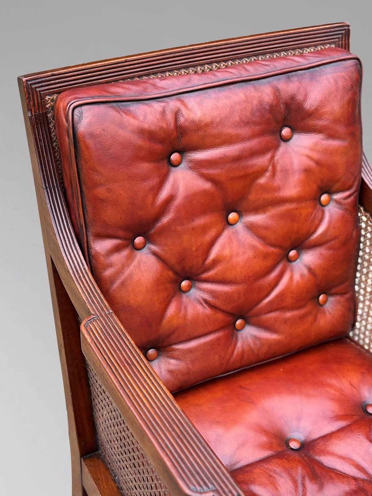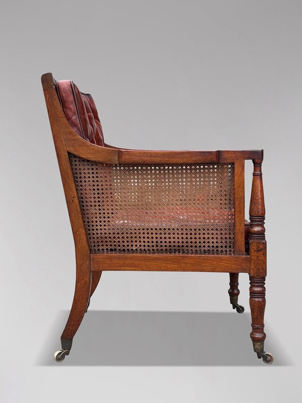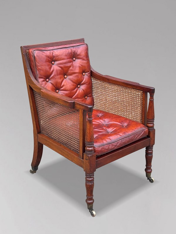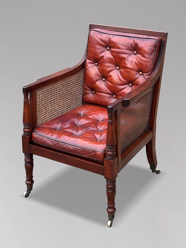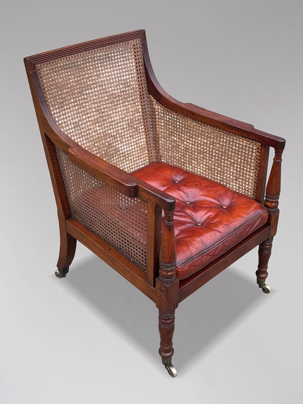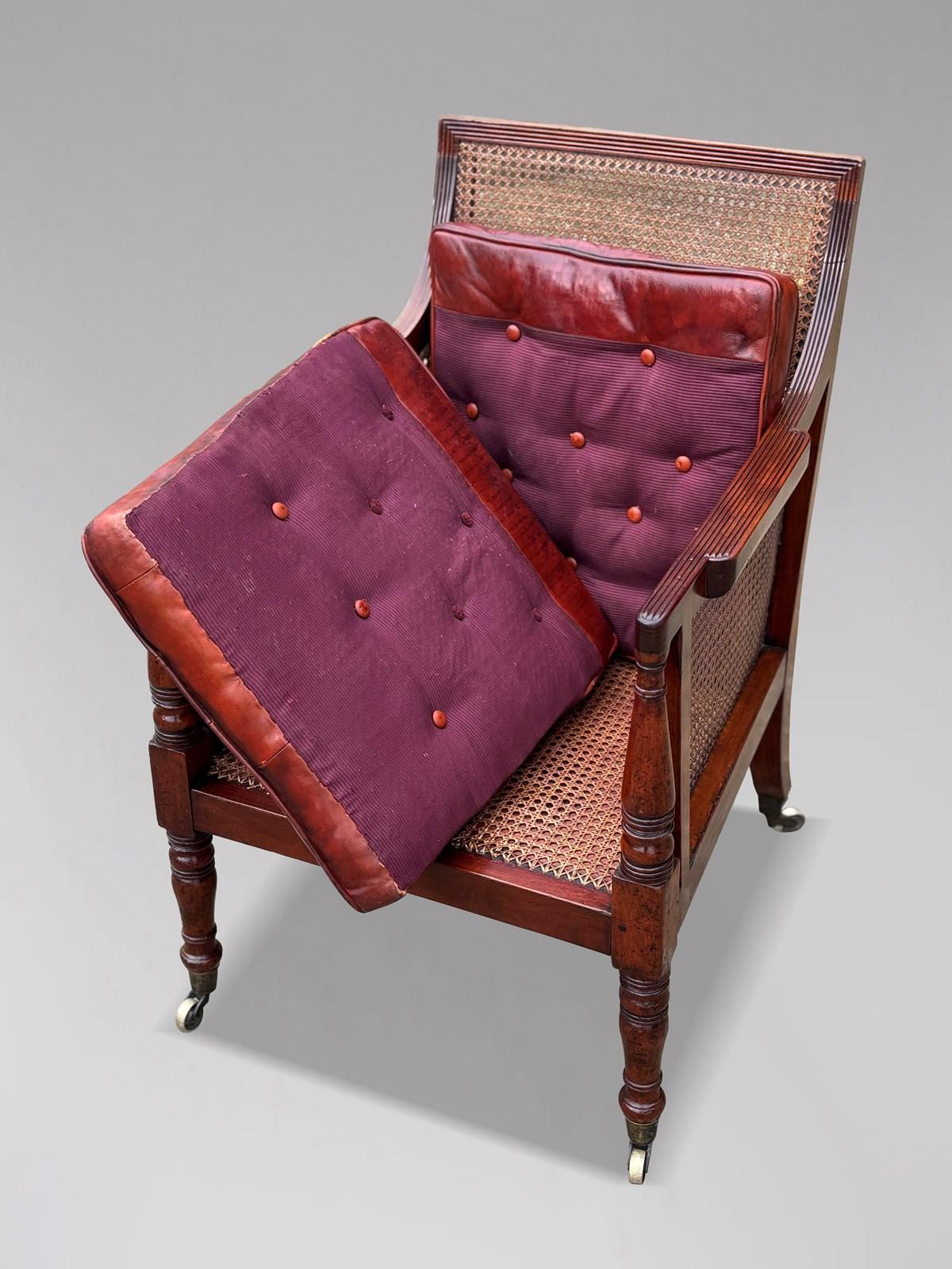 Early 19th Century Regency Period Mahogany Leather Caned Library Bergère Armchair