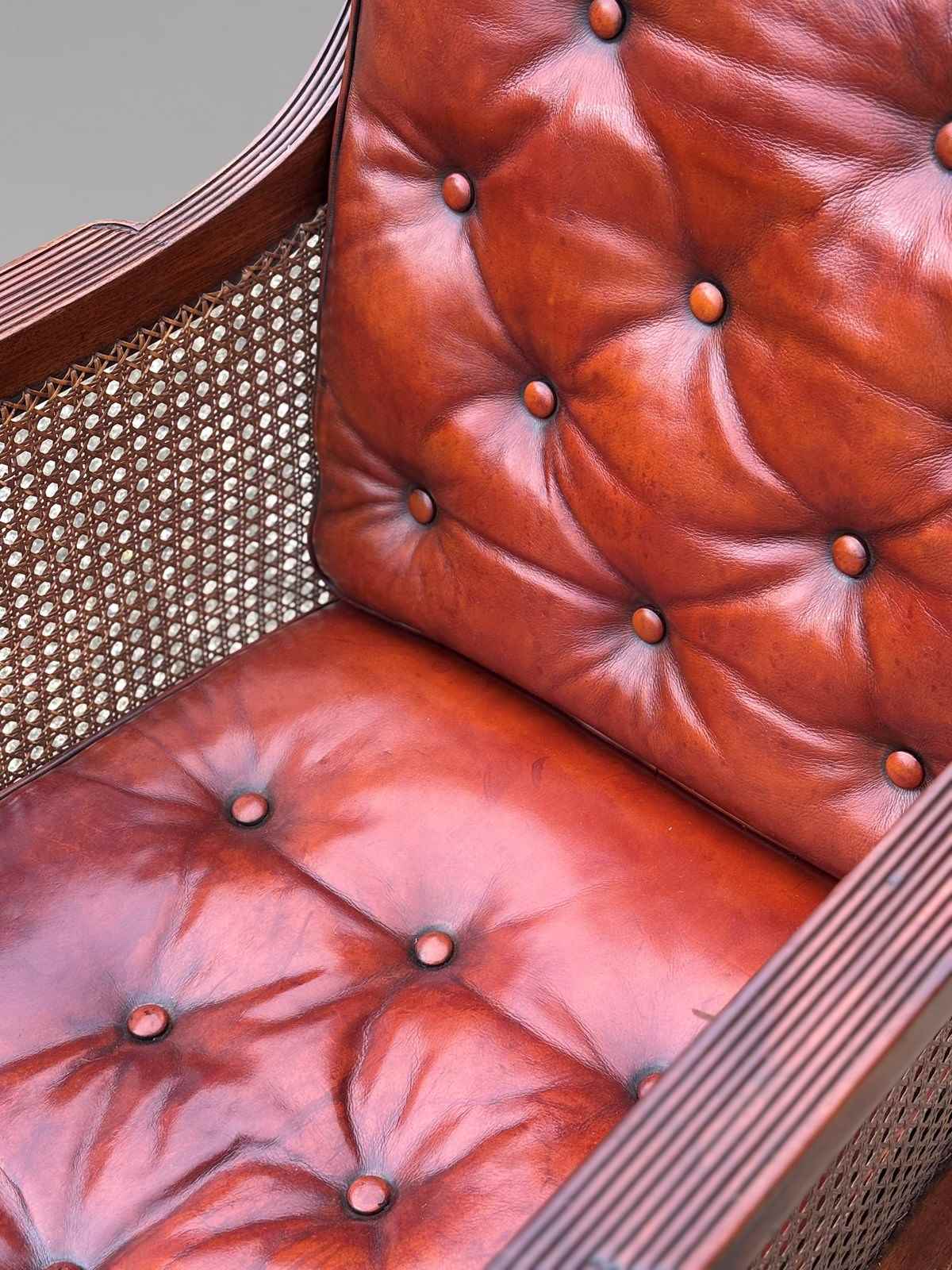 The chair showcases stunning quality mahogany and original brown red leather buttoned cushions, reflecting its rich history and craftsmanship. Equipped with leather squab cushions adorned with float buttons, this bergère offers both style and comfort. The chair retains its original colour and patina, along with caning on the sides, seat, and back, ensuring it remains a standout piece in any setting. The chair seat height is 46cm.