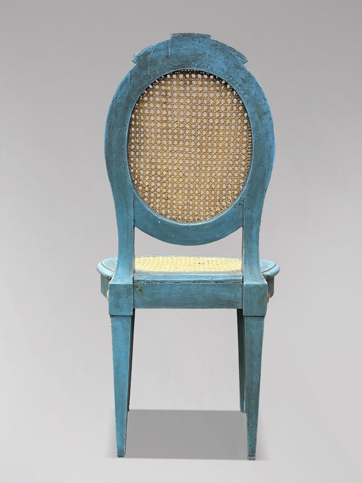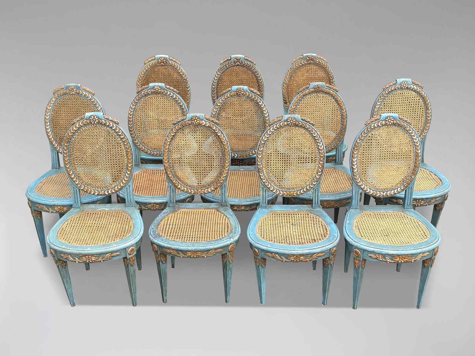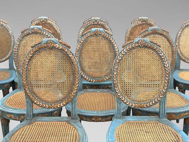 A very elegant set of twelve painted and caned dining chairs in the Louis XVI taste, retaining their original blue paint. The chairs are carved and painted wood, with caning to the backs and seats. Each has a carved bow on the seat back, with rosettes to the tops of the legs and the centre of the seat. They have an exquisite patina with gilded details. The caned backs and seats are painted with a lozenge design, and each chair comes with a squab cushion.