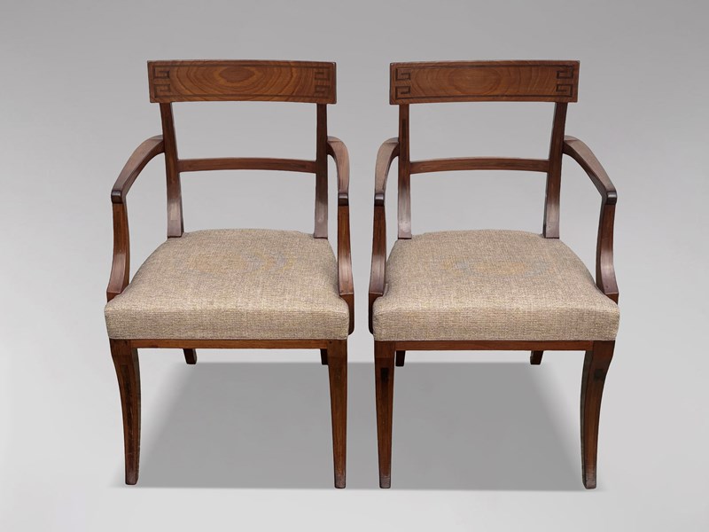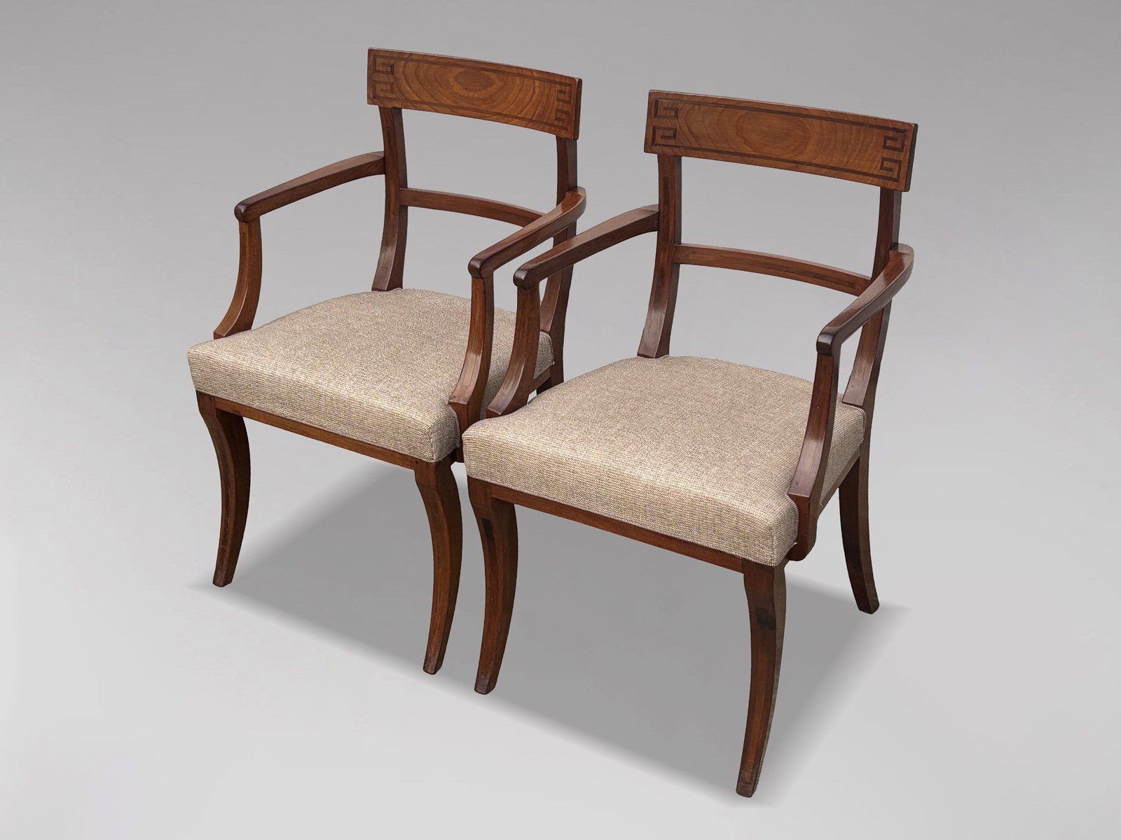 These sturdy, heavy chairs feature flame mahogany, curved rectangular bar backs decorated with ebony Greek-key marquetry, supported by ebony-inlaid moulded uprights and united by a finely inlaid central splat. The seat frames are raised on ebony inlaid sabre-shaped front legs, with splayed rear legs.