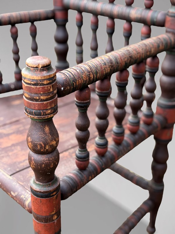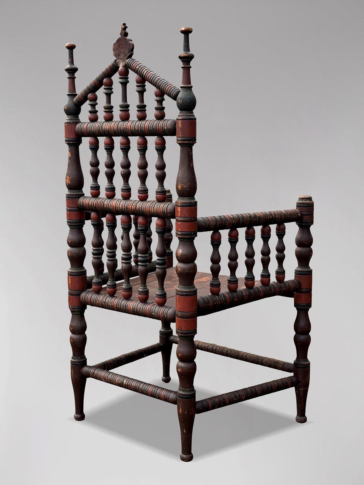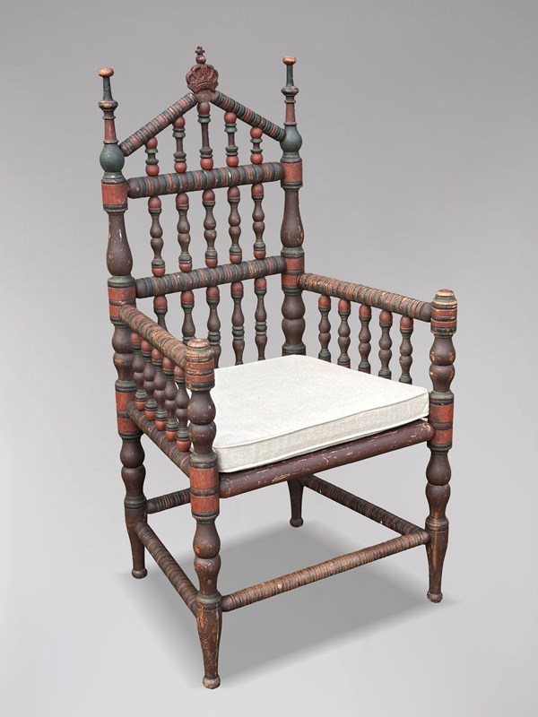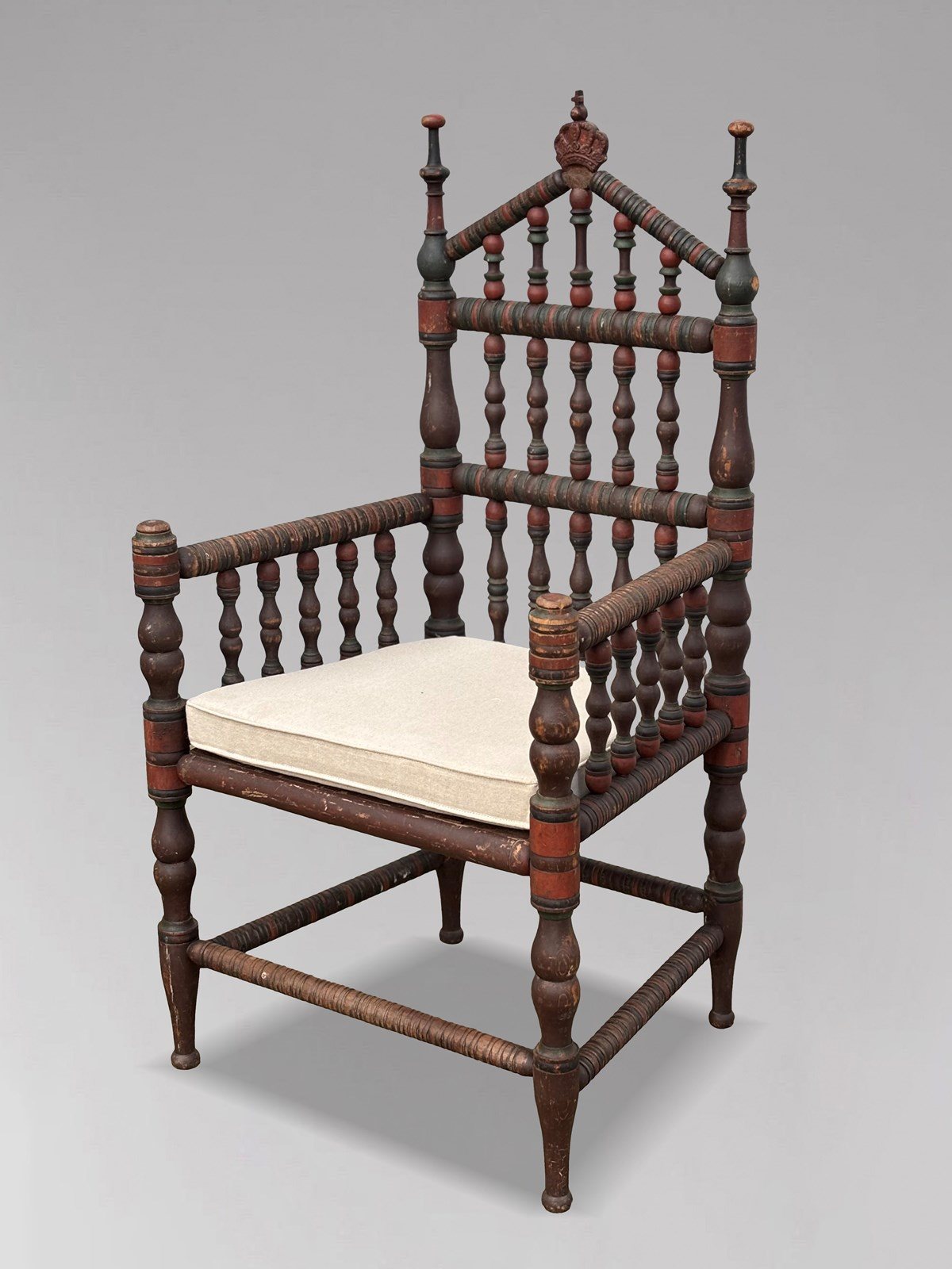 An early 19th-century Scandinavian turned armchair, probably Swedish. Turned from a hard pine sometimes called Baltic redwood, this armchair retains its original paint in red, brown, green and black, and is in remarkably good condition. It is something a bit different – perfect for making a statement.