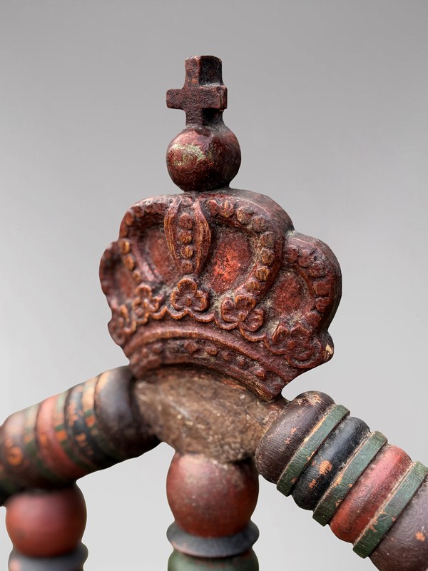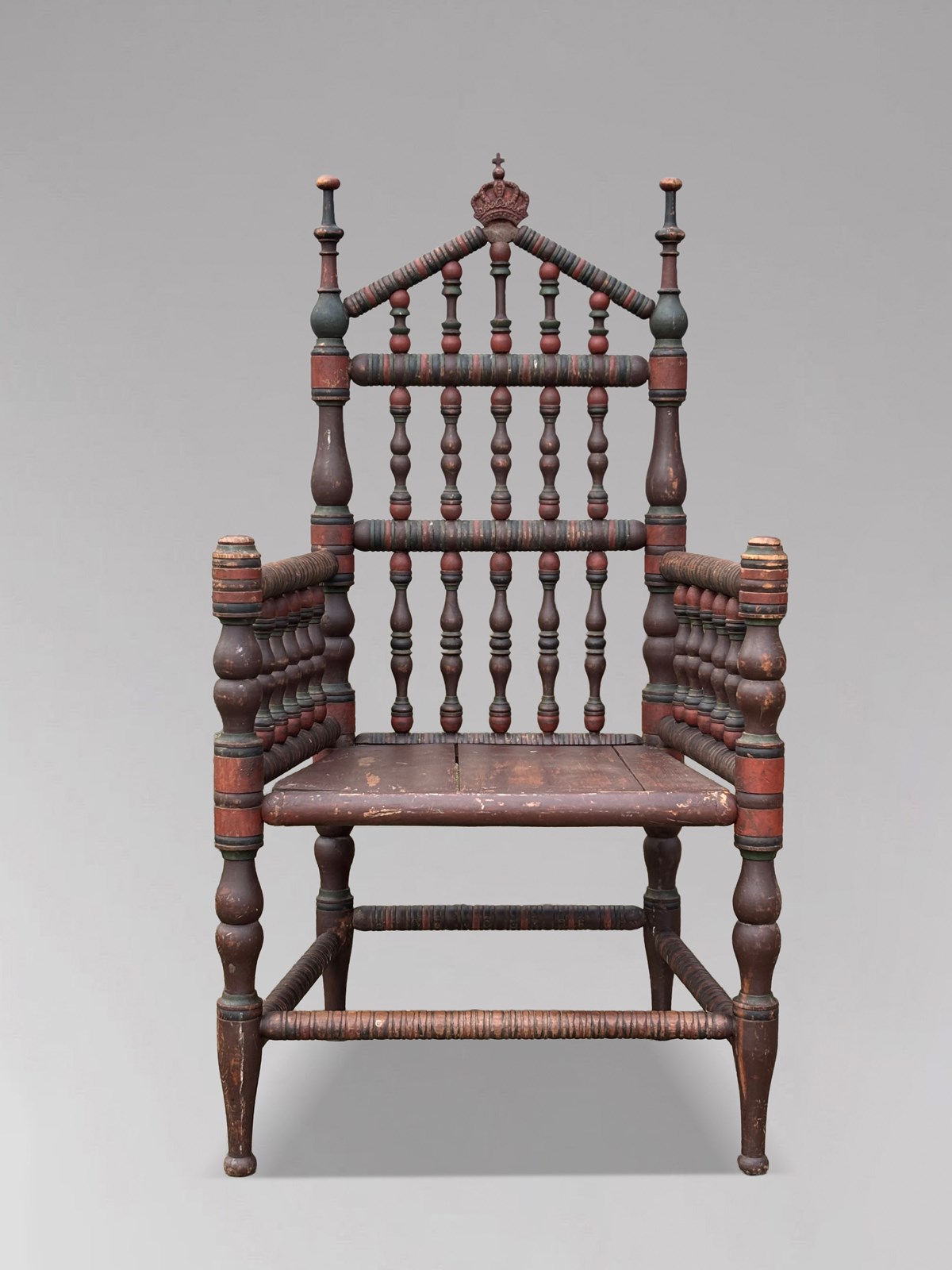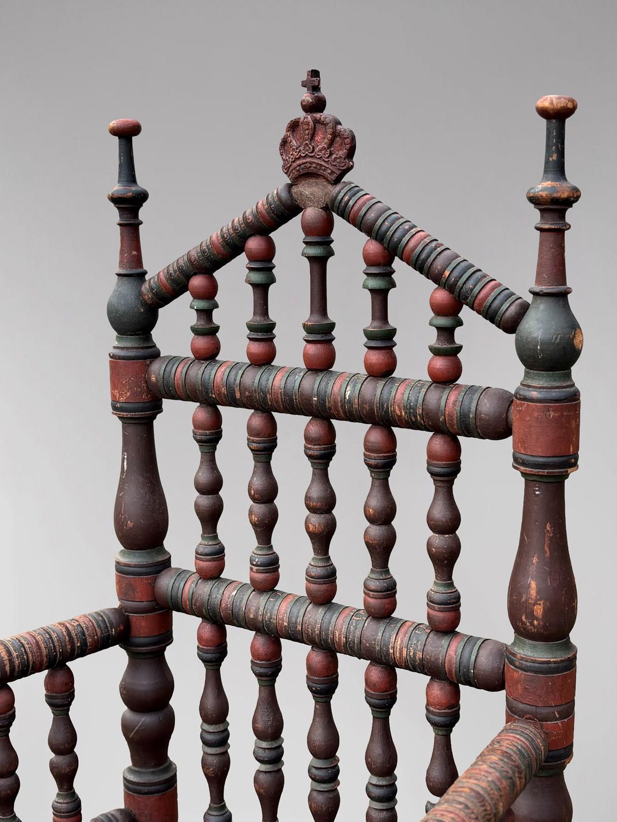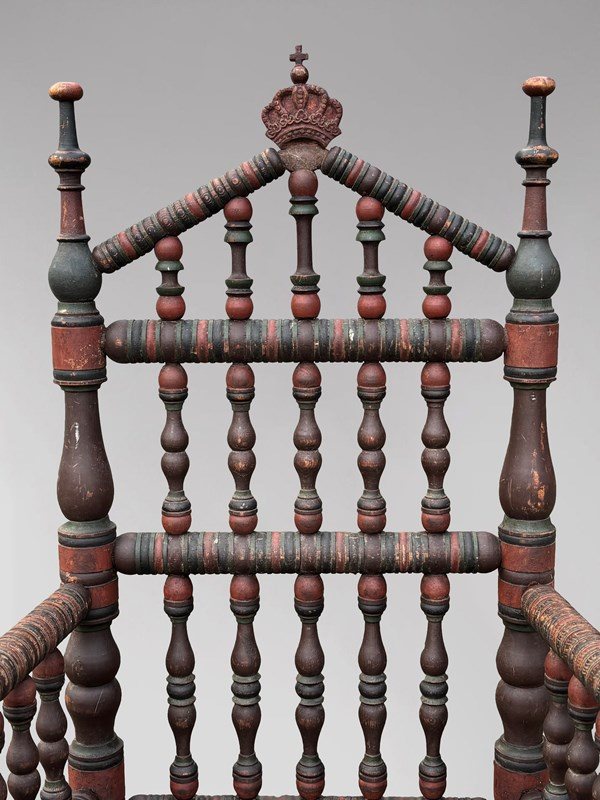 An early 19th-century Scandinavian turned armchair, probably Swedish. Turned from a hard pine sometimes called Baltic redwood, this armchair retains its original paint in red, brown, green and black, and is in remarkably good condition. It is something a bit different – perfect for making a statement.
