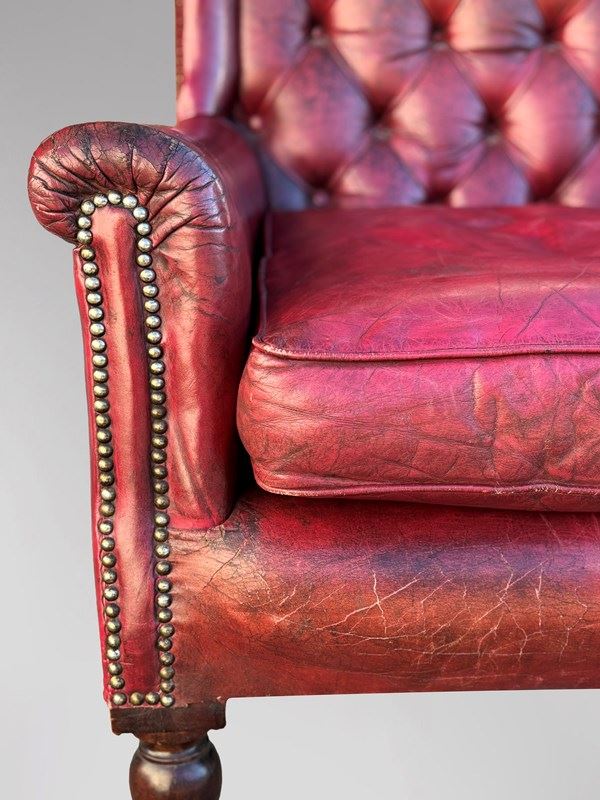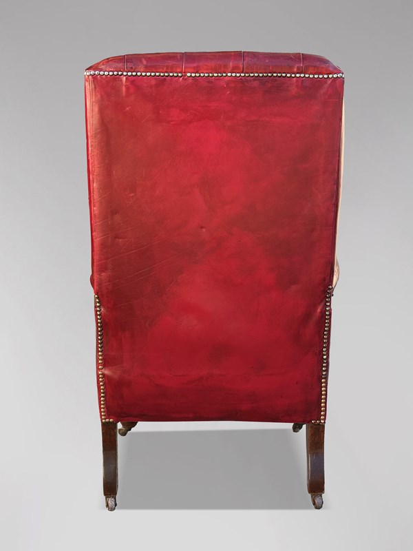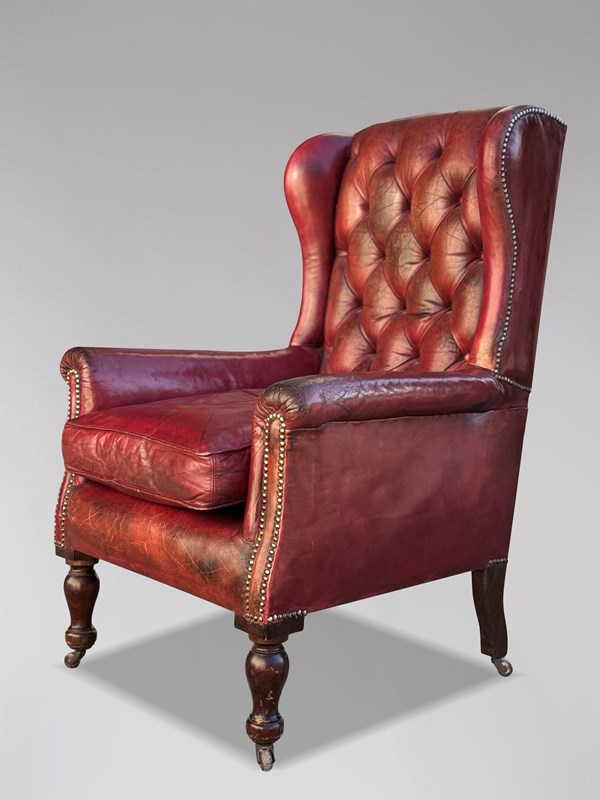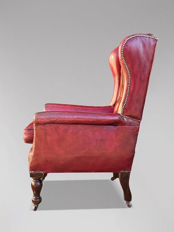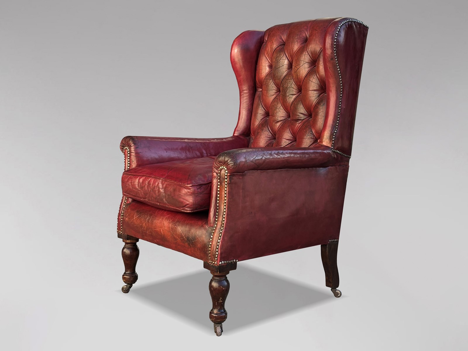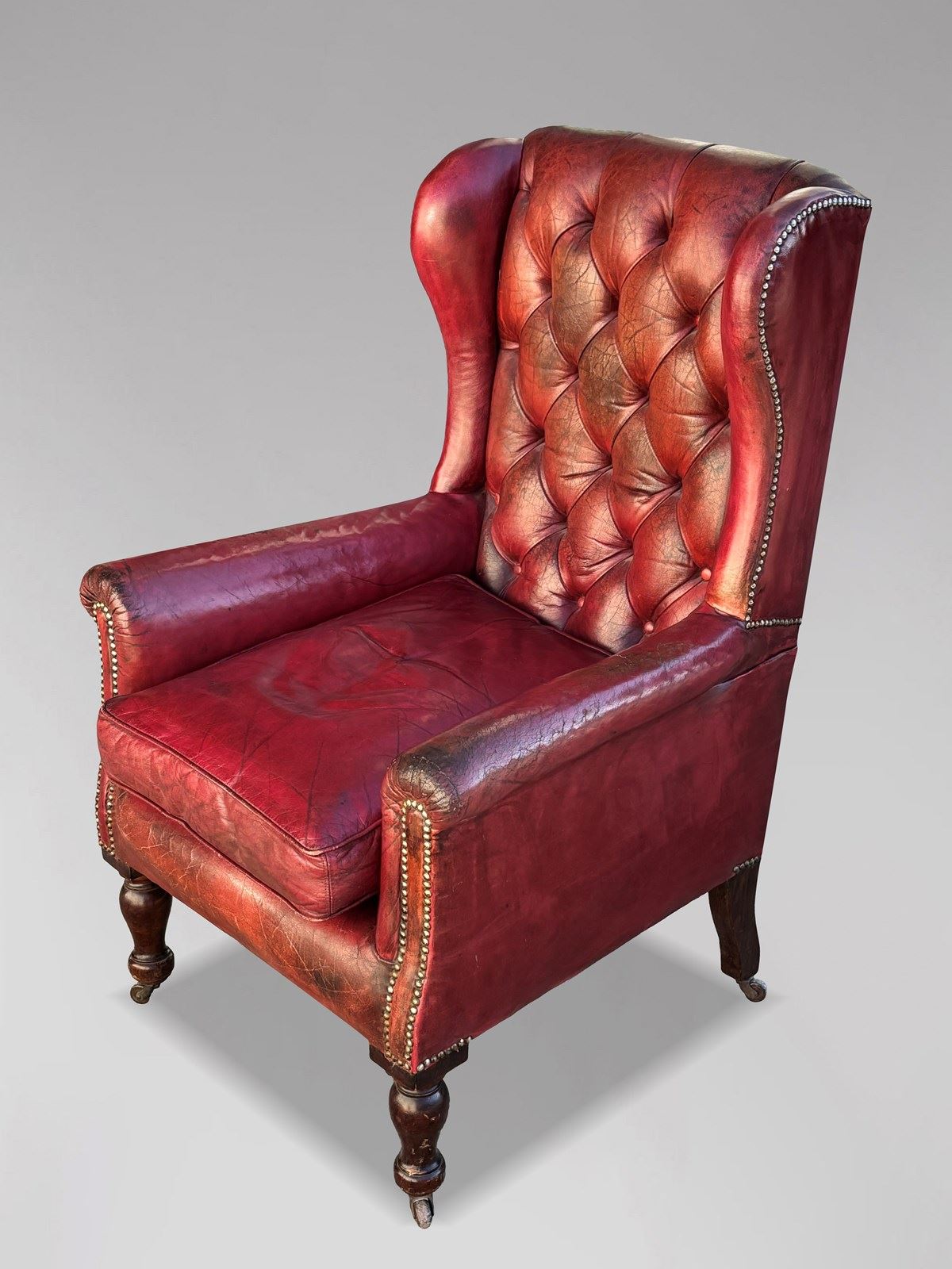 A quality, untouched 19th-century Victorian period red leather button back wing armchair. The substantial, well-shaped heavy solid frame features a deep-buttoned upholstered back, all covered in the original red leather. The chair boasts scrolling arms, a sprung seat, loose feathered cushion and close-nailed brass stud detailing. It is raised on tall turned baluster legs terminating in castors. The chair has a beautiful, untouched colour and rich patination, and it is very comfortable. It is in superb condition with no damage or repairs. The chair seat height is 53cm.