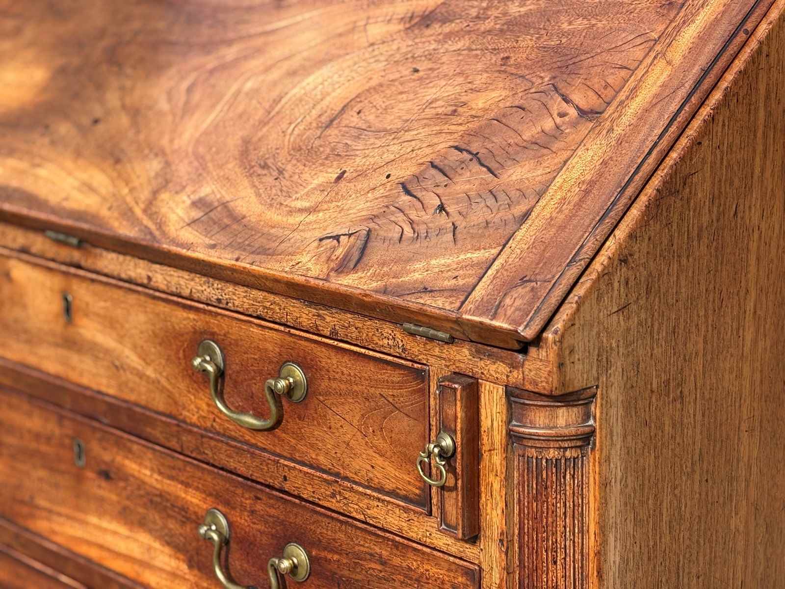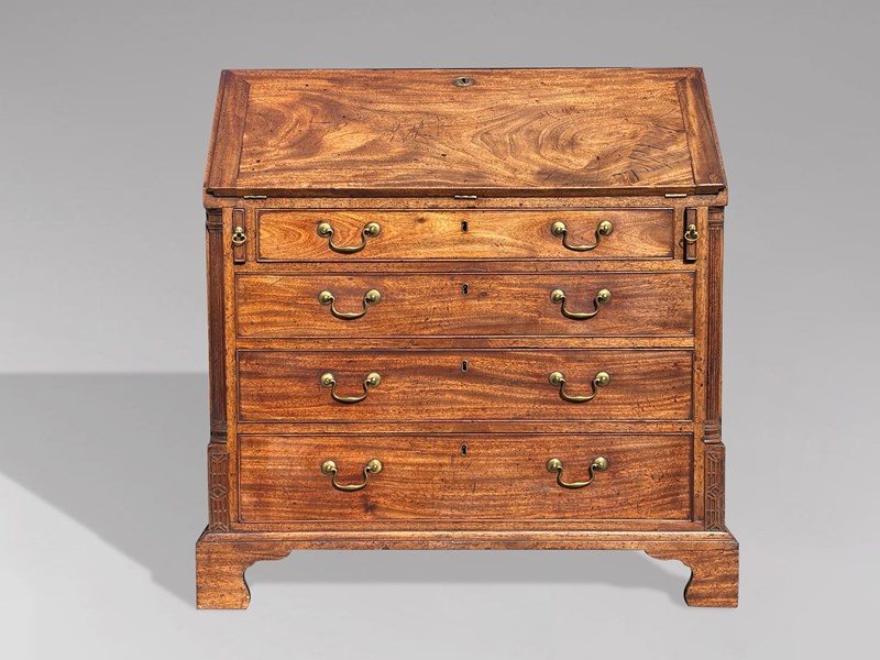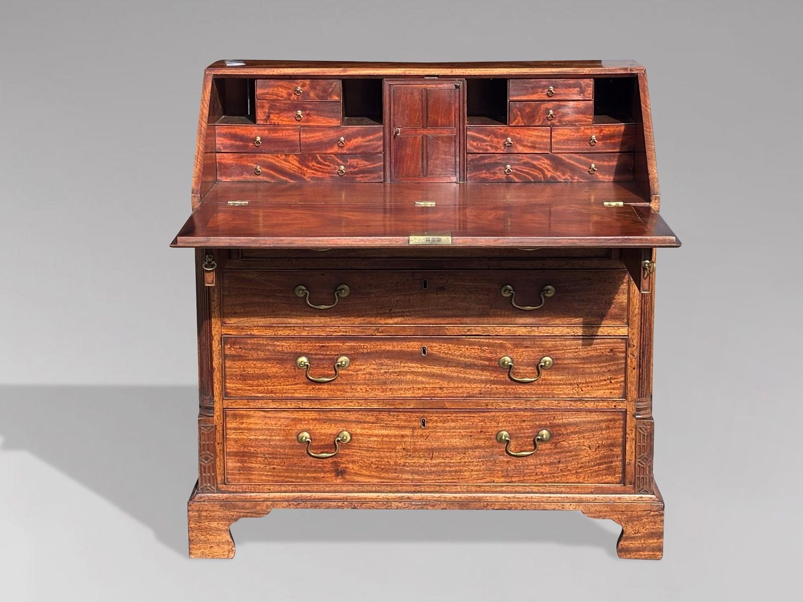 This charming late 18th-century George III period finely figured mahogany bureau showcases exquisite craftsmanship and timeless appeal. The fall front with brass escutcheon and original lock, opens to reveal a well organized fitted interior, consisting of a central door with pigeon holes and drawers to either side. This leads down to an arrangement of drawers, the bureau is fitted with four long graduated drawers, all adorned with elegant original brass swan neck handles and escutcheons. Flanked by turned reeded fluted pilasters. The piece stands proudly on bracket feet, the sides in solid mahogany, the back in original oak boards, all contributing to its classic design. Made in England, circa 1770, this bureau bookcase boasts a rich mahogany colour and is in superb original condition.