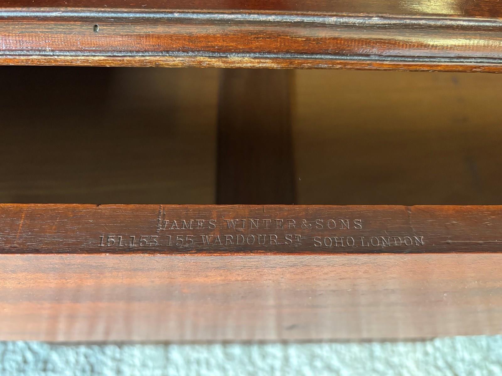 The upper section has an ogee moulded cornice over three original arched glazed doors, opening to adjustable shelves, ideal for displaying books, porcelain, or other treasured pieces. Below, the base is fitted with panelled mahogany cupboard doors enclosing a combination of fitted mahogany drawers and adjustable shelves, all raised on an integral moulded plinth base. The top internal drawer is stamped “James Winter & Sons, 151, 153, 155 Wardour St, Soho, London”, confirming a respected London maker. The bookcase retains its original keys and fully working locks.