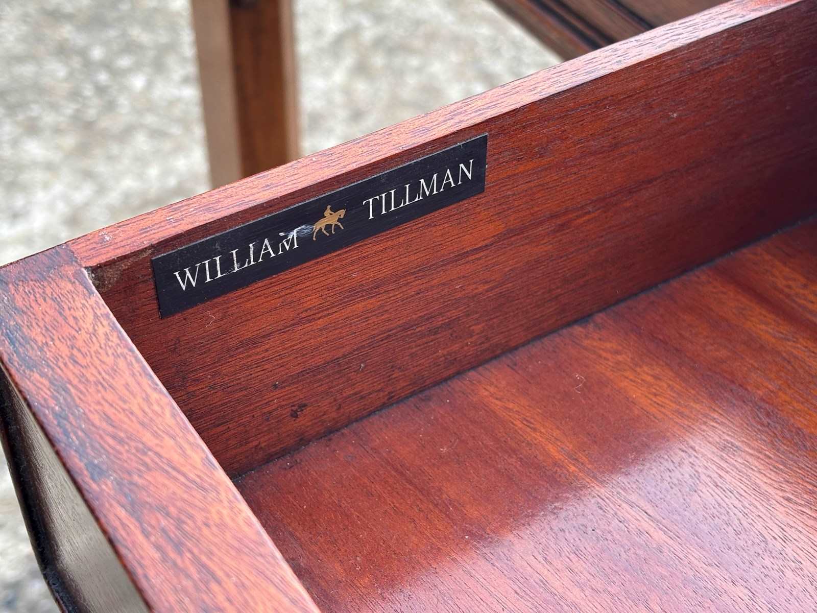 Crafted in England circa 1960, this partners writing table is made from beautifully figured mahogany with a rich, warm brown patina. The depth of grain and quality of finish are typical of William Tillman’s finest work. It remains in superb original condition and retains its maker’s label inside one of the drawers, confirming its authenticity.