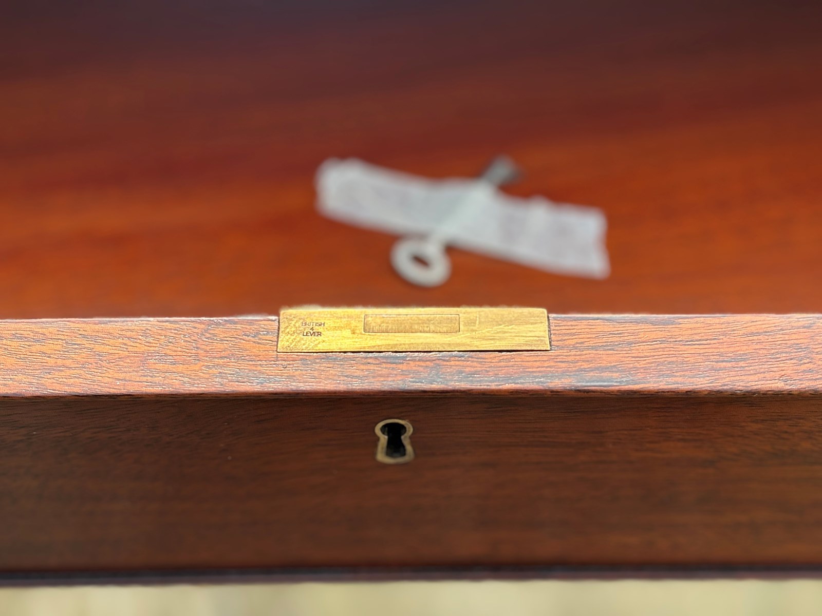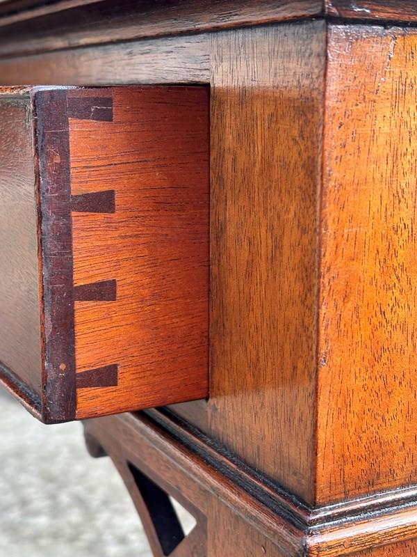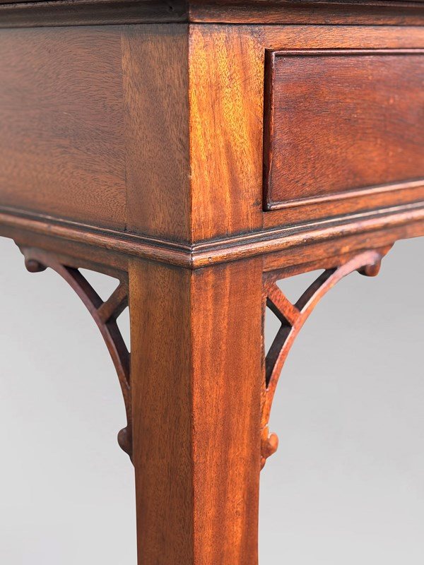 The drawers retain their original brass swan neck handles and working locks, accompanied by two original keys. The writing table stands on chamfered square section legs, enriched by pierced fretwork ears at the hips, giving the piece a refined decorative flourish and a distinctly Georgian character.