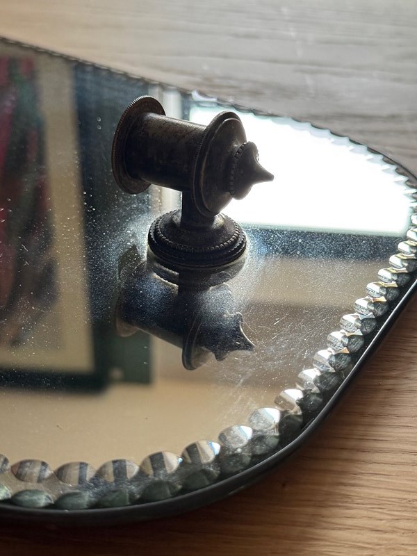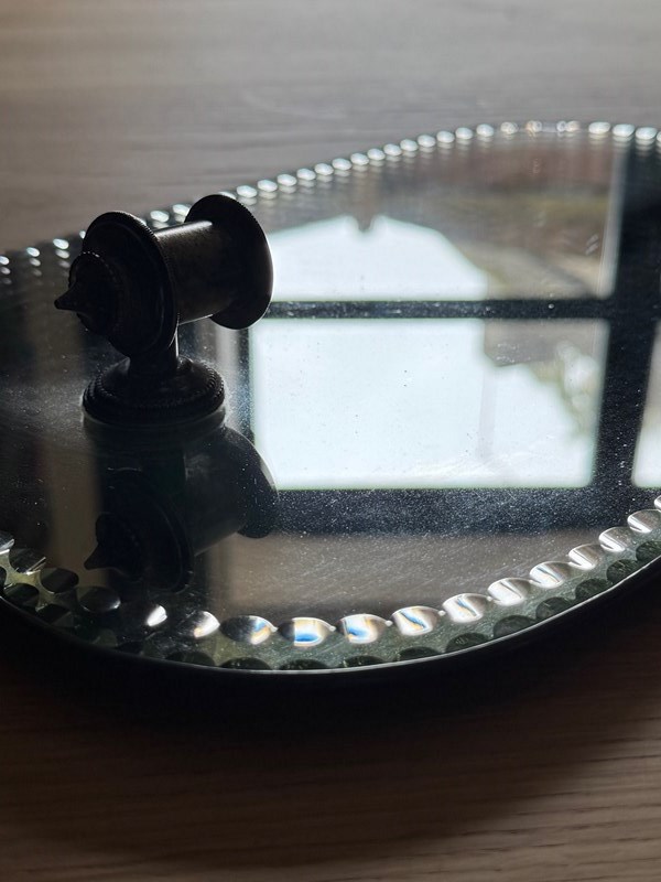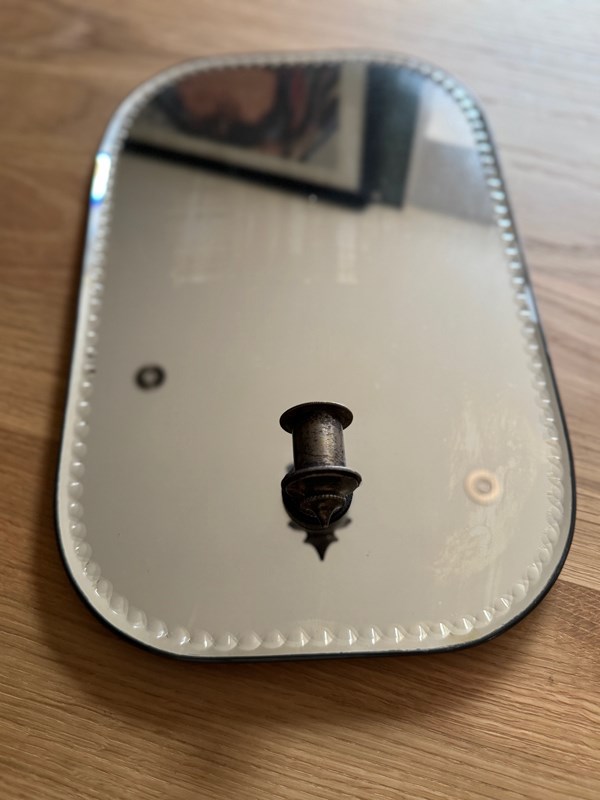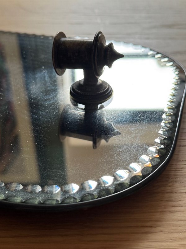 The edge is bordered with a repeating row of small convex bullseyes around the perimeter of the whole frame. To the bottom is the original metal candle holder.
