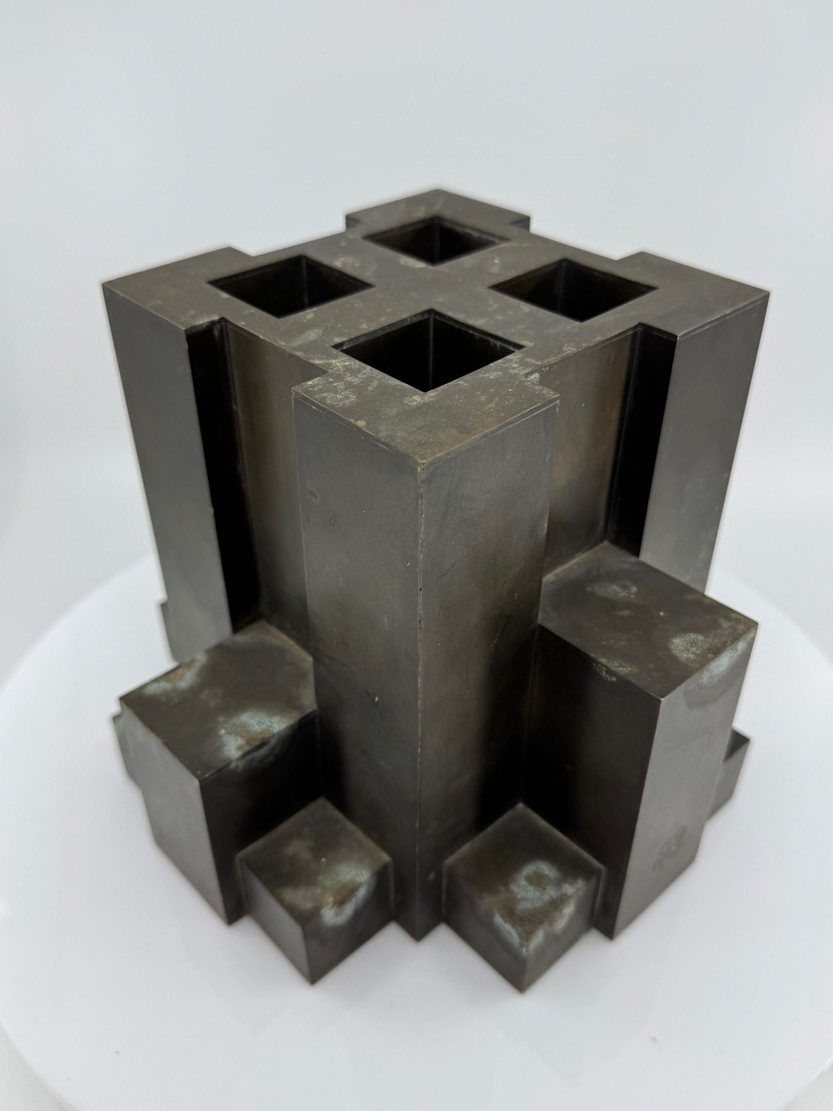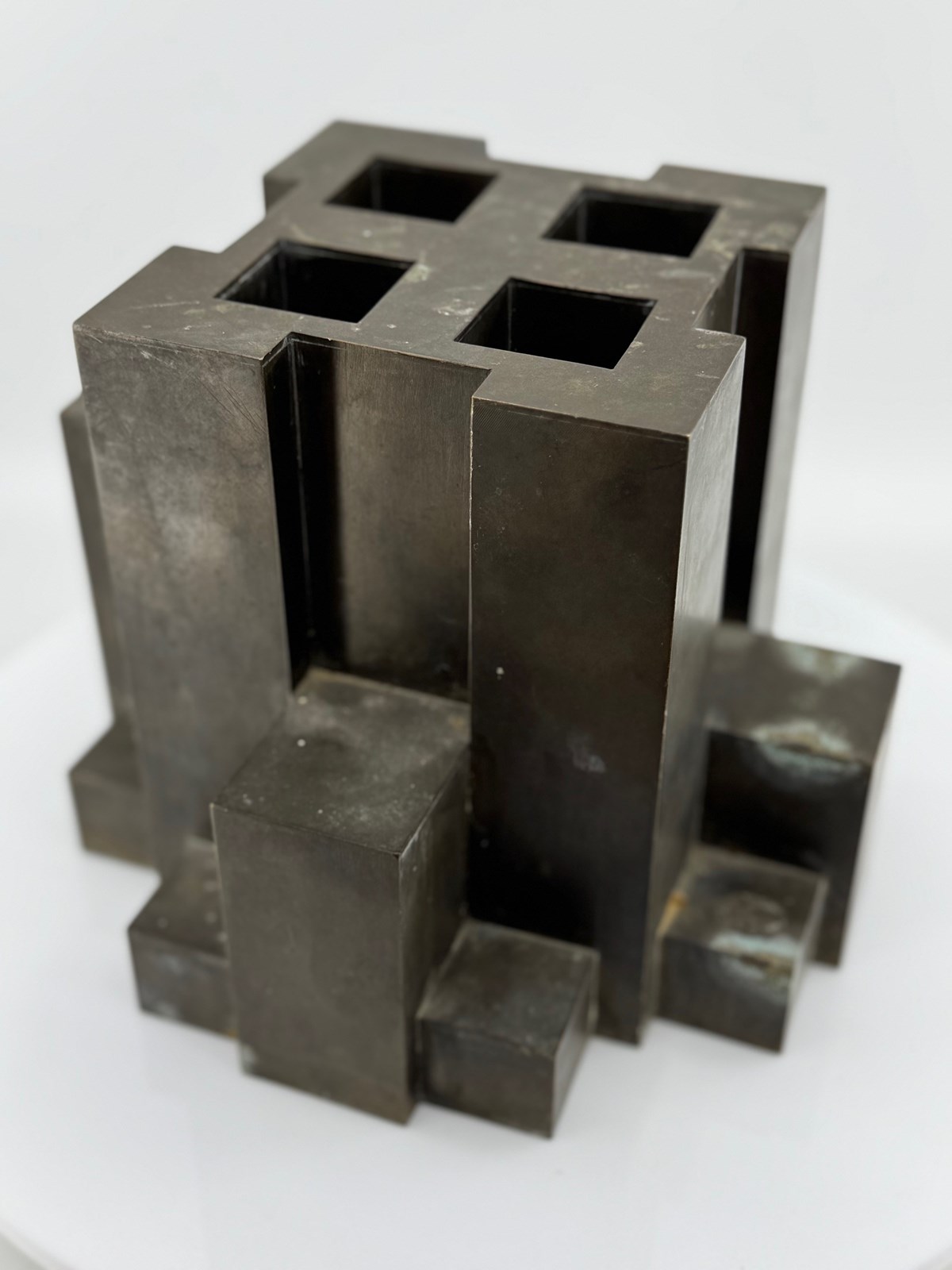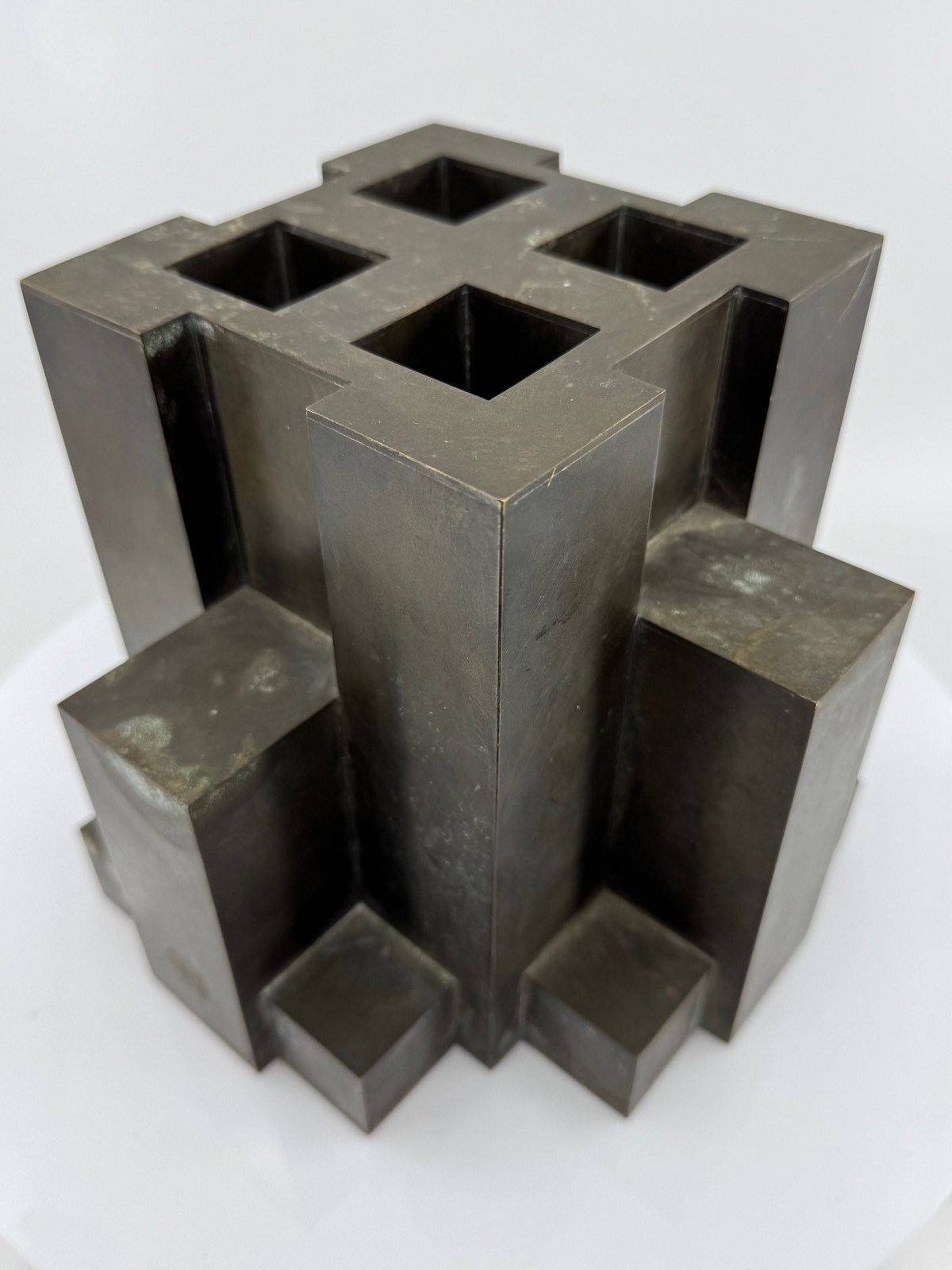 Believed to be of hollow form, it is still very weighty. Has a skyscraper kind of look to it and is obviously very 3 dimensional and intriguing with it's varied height pillars.