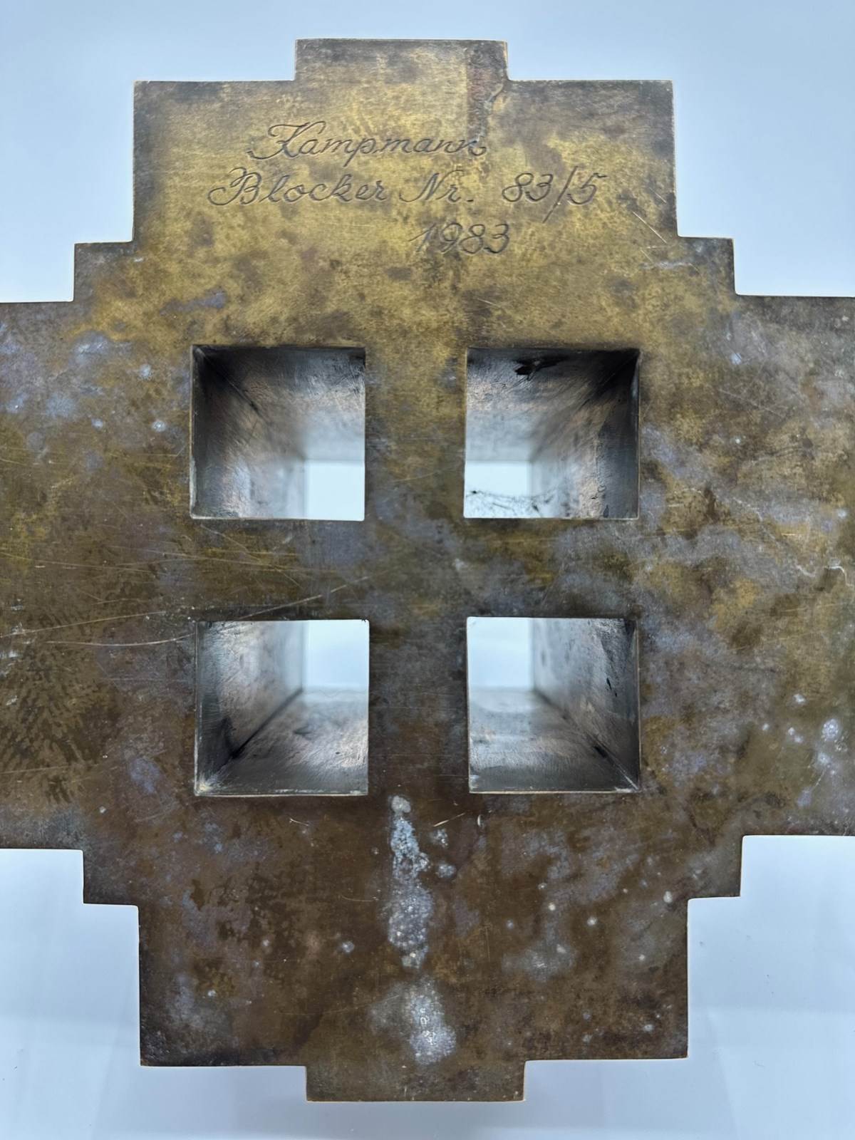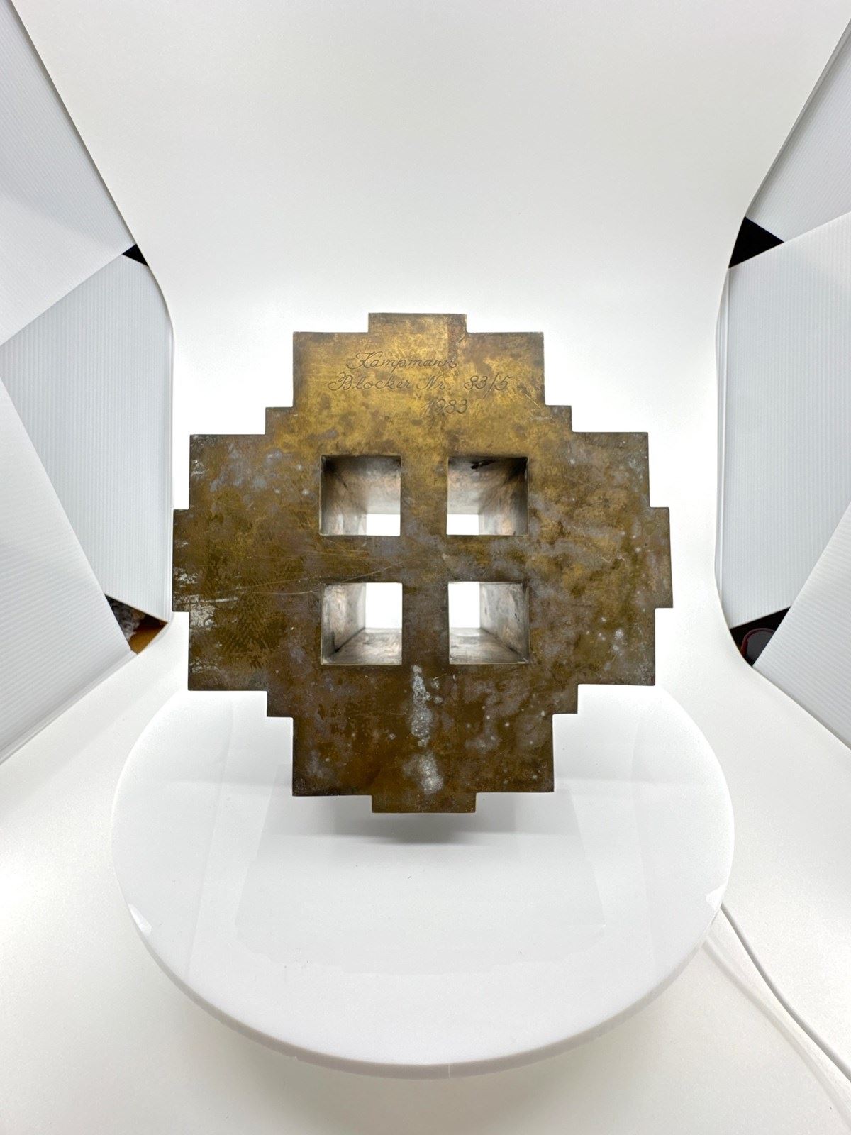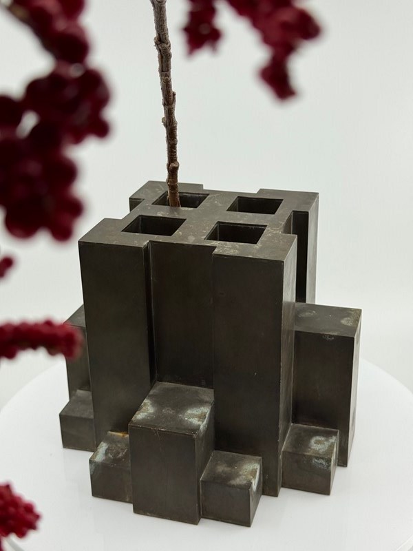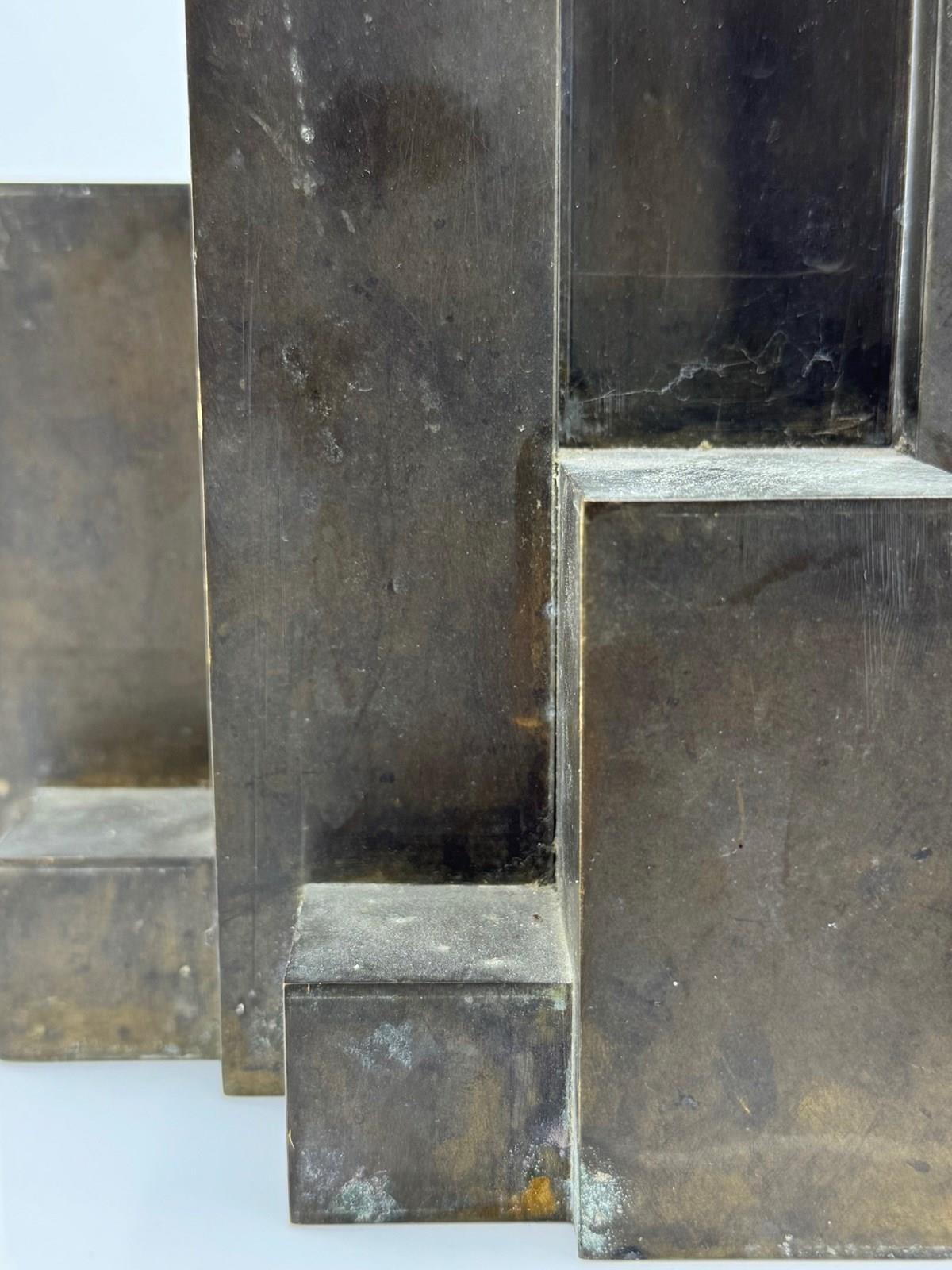 Believed to be of hollow form, it is still very weighty. Has a skyscraper kind of look to it and is obviously very 3 dimensional and intriguing with it's varied height pillars.