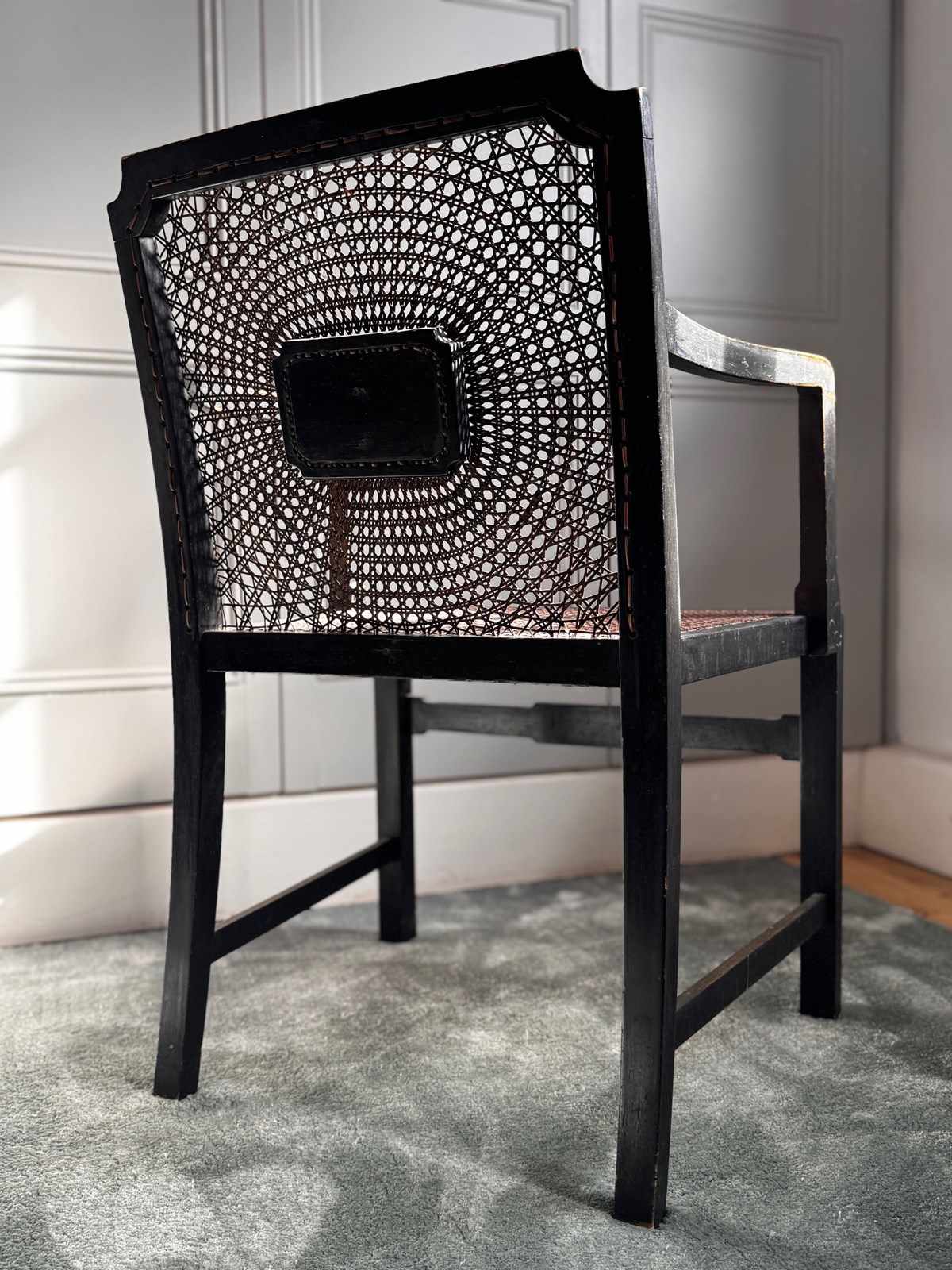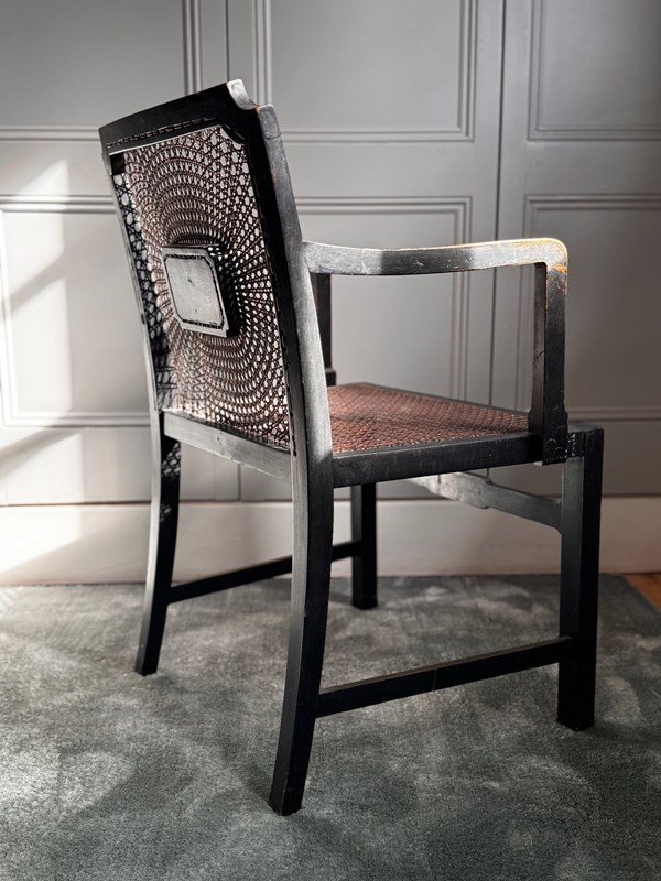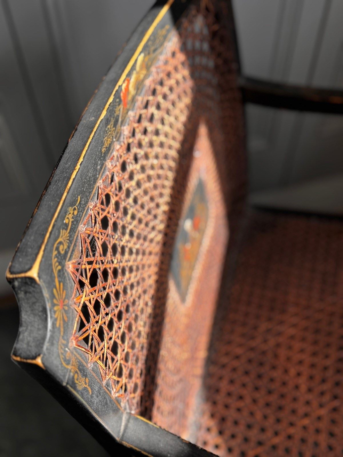 A pretty and decoratively painted English Edwardian chinoiserie bergere petite armchair, perfect for bedroom or dressing room use and with generous sized seat.