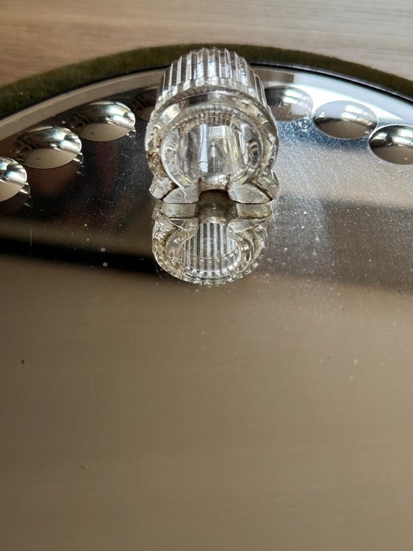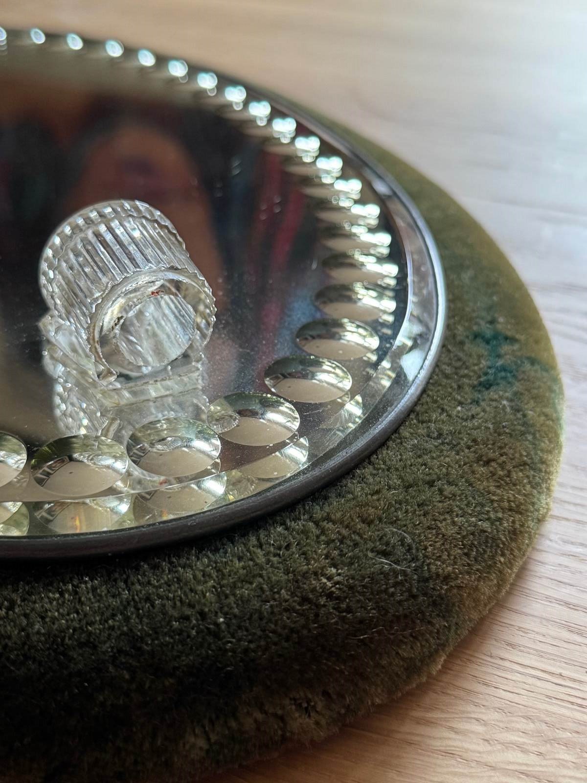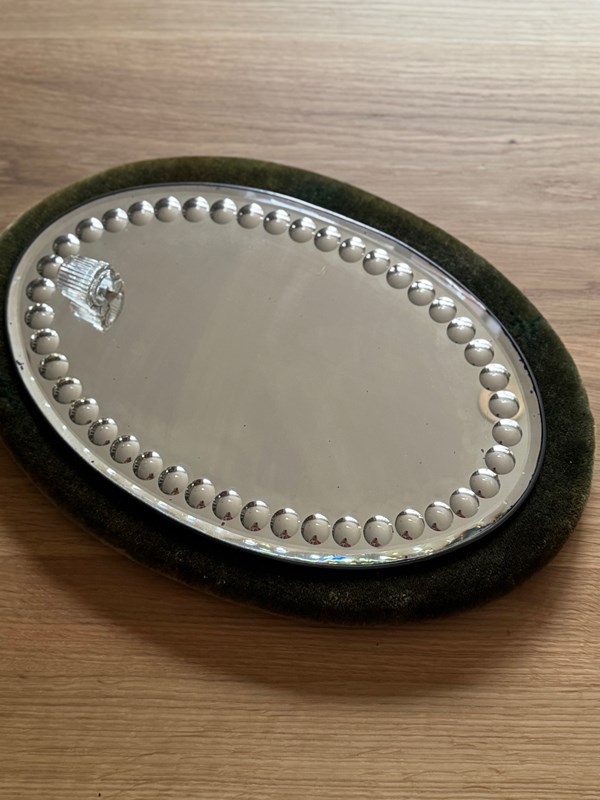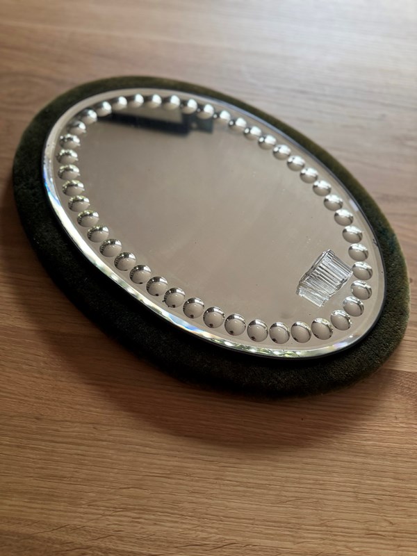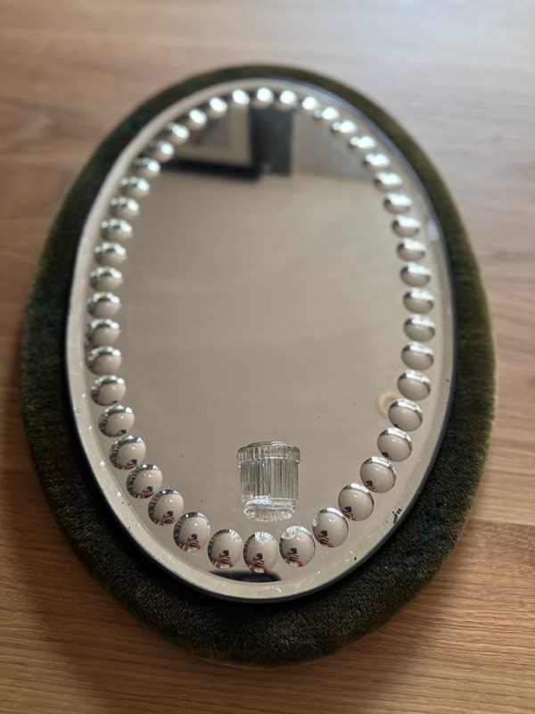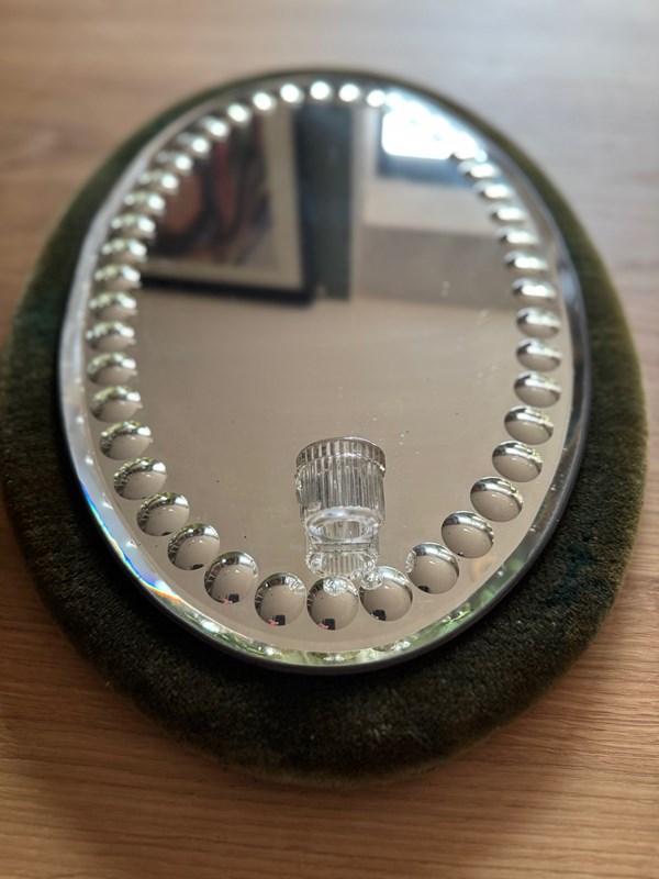 Backed on green velvet, the canted bevelled edge is bordered with a repeating row of small convex bullseyes around the perimeter of the whole frame. To the bottom is the original reeded glass candle holder.