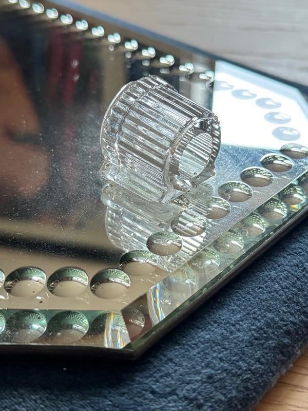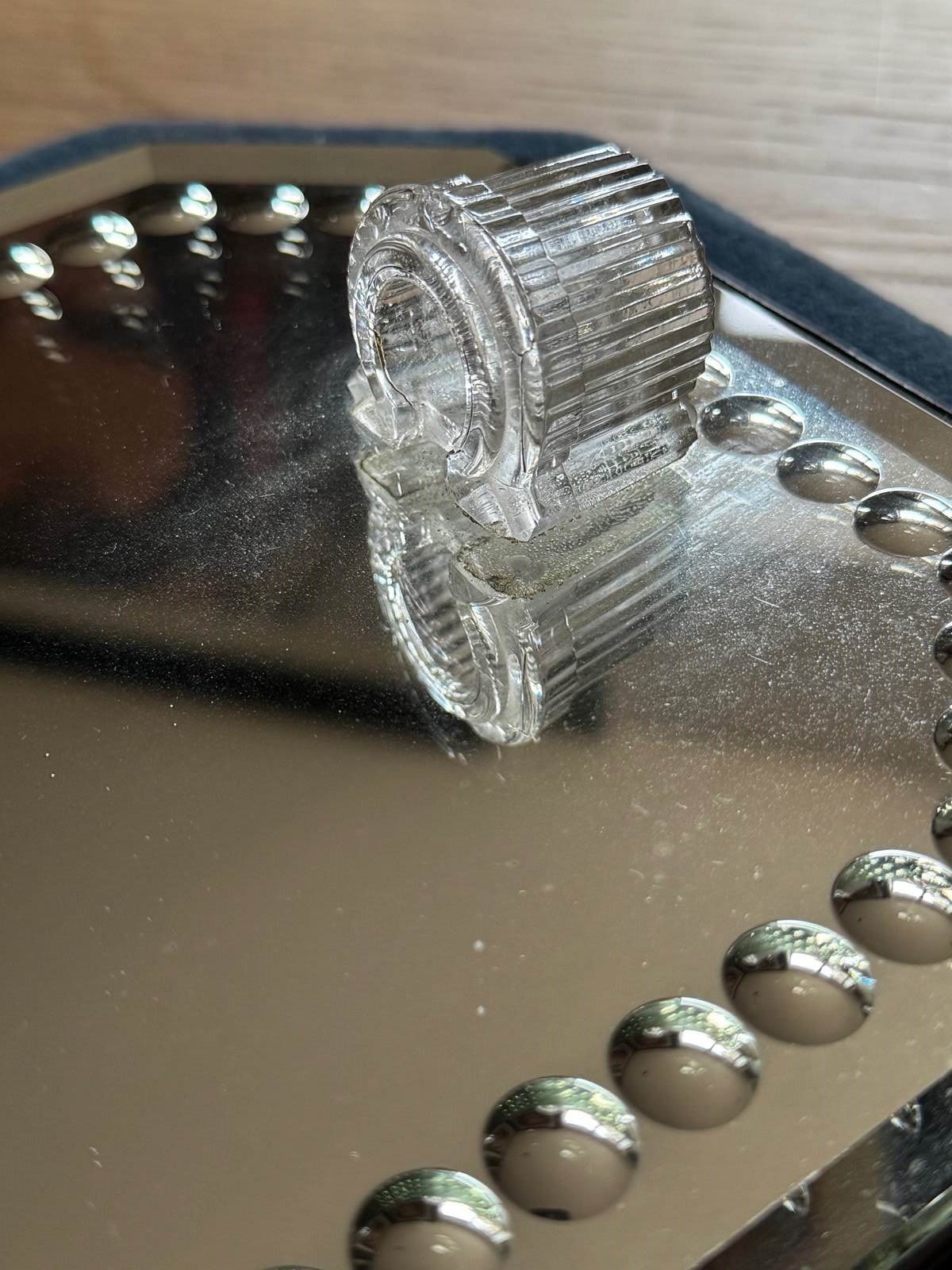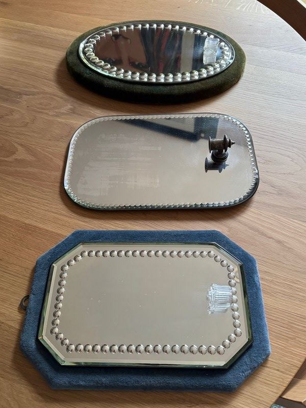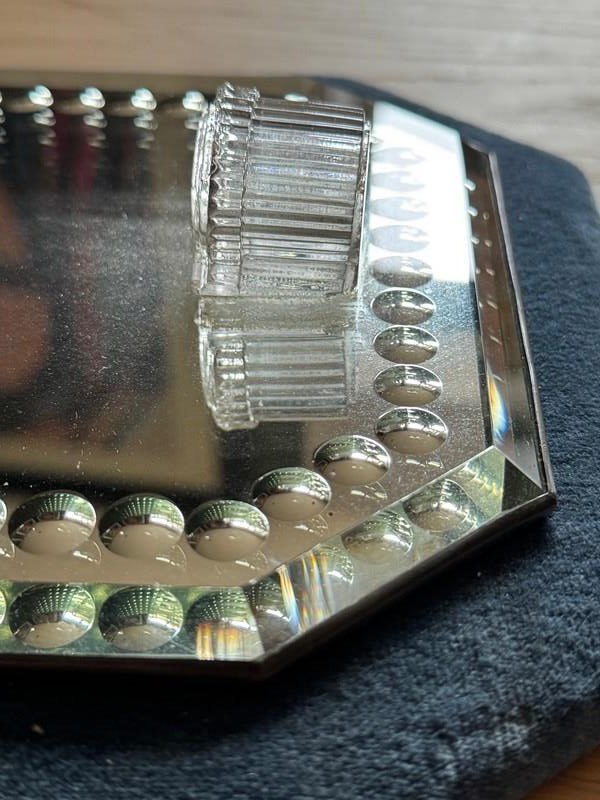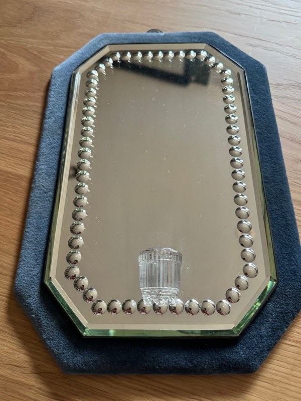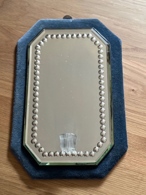 Backed on blue velvet, the canted bevelled edge is bordered with a repeating row of small convex bullseyes around the perimeter of the whole frame. To the bottom is the original reeded glass candle holder.