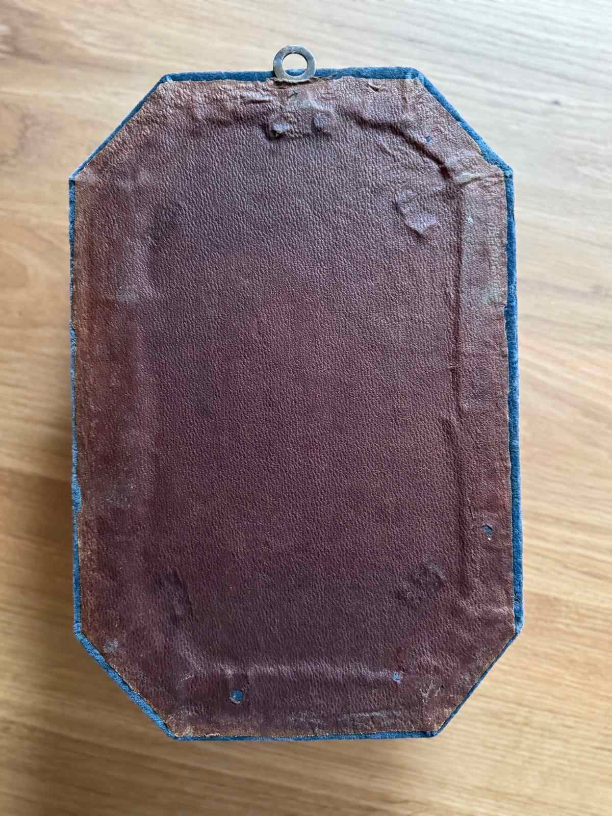 The reverse is covered in a now faded aubergine shagreen style covering.