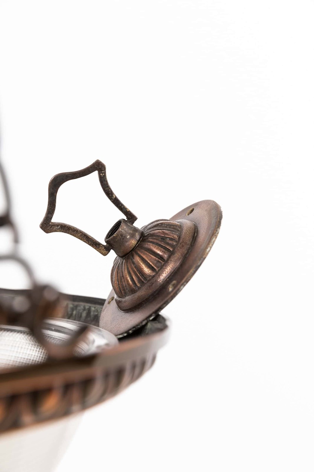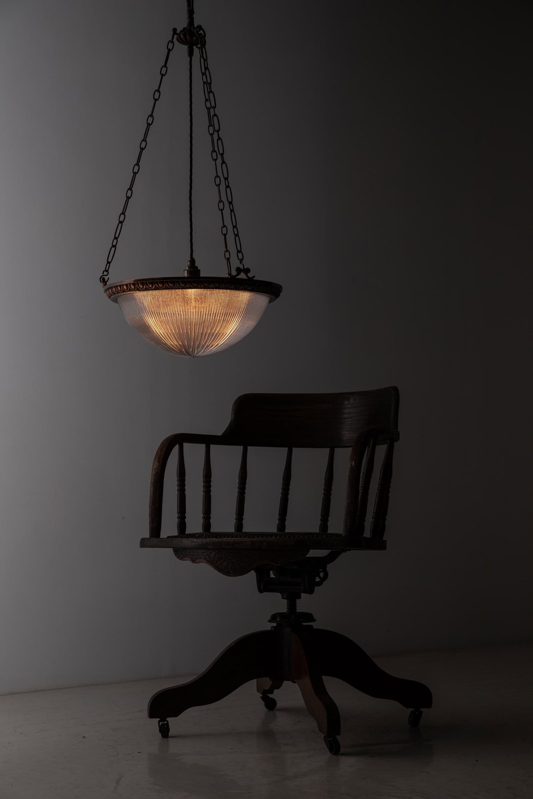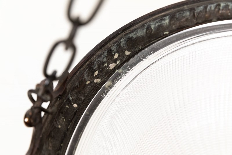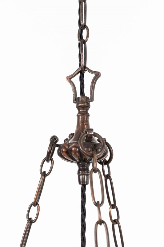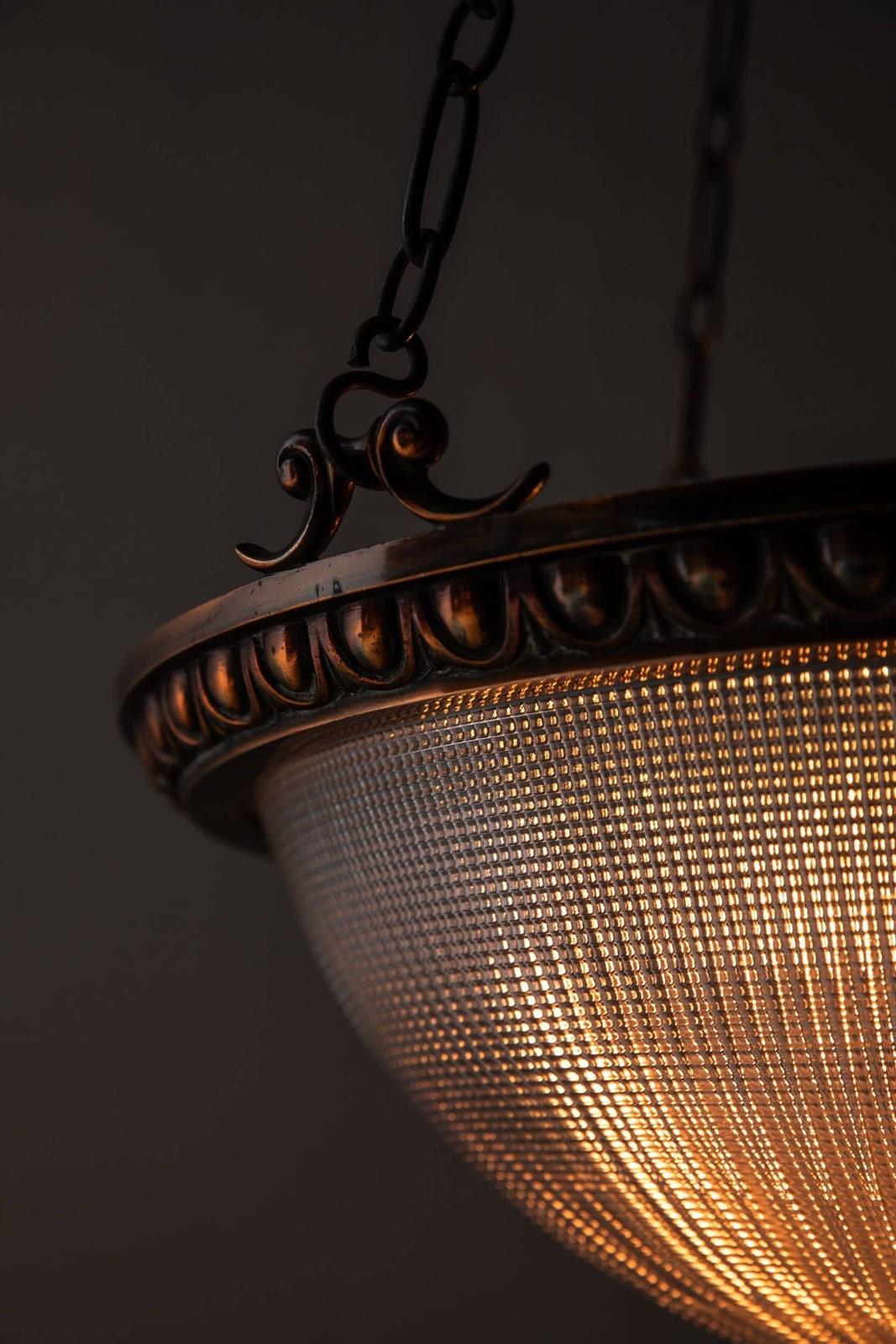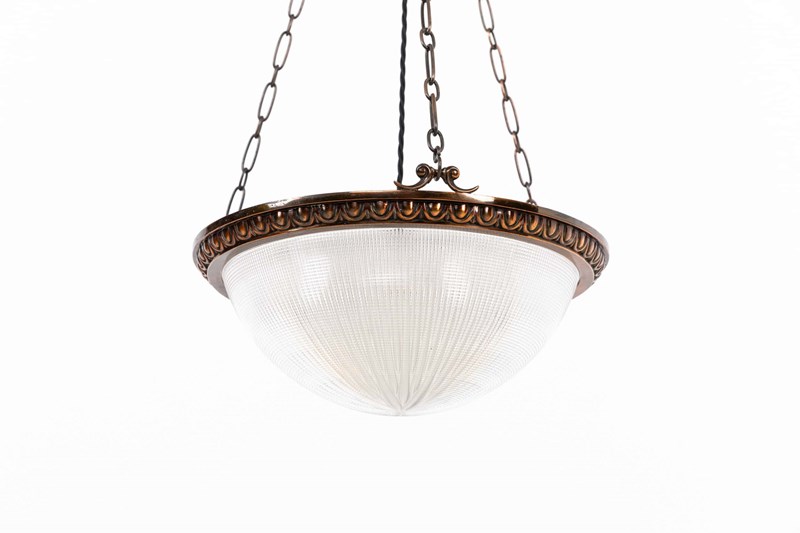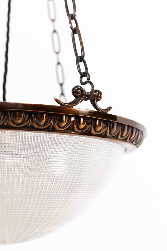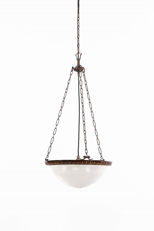 Prismatic glass bowl bearing the Holophane stamp to the inside rim, set inside a high quality cast brass ring retaining its original copper finish. Complete with hanger, chains and ceiling hook.