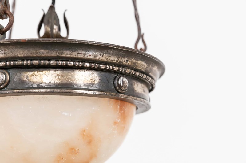 Off-white coloured alabaster with a swirled array of natural marbling. Smaller in proportions and well suited to a small space. The alabaster bowl is set into a high quality decorative cast brass ring retaining its original, patinated, silver plated finish. Complete with rods, hanger and ceiling plate.