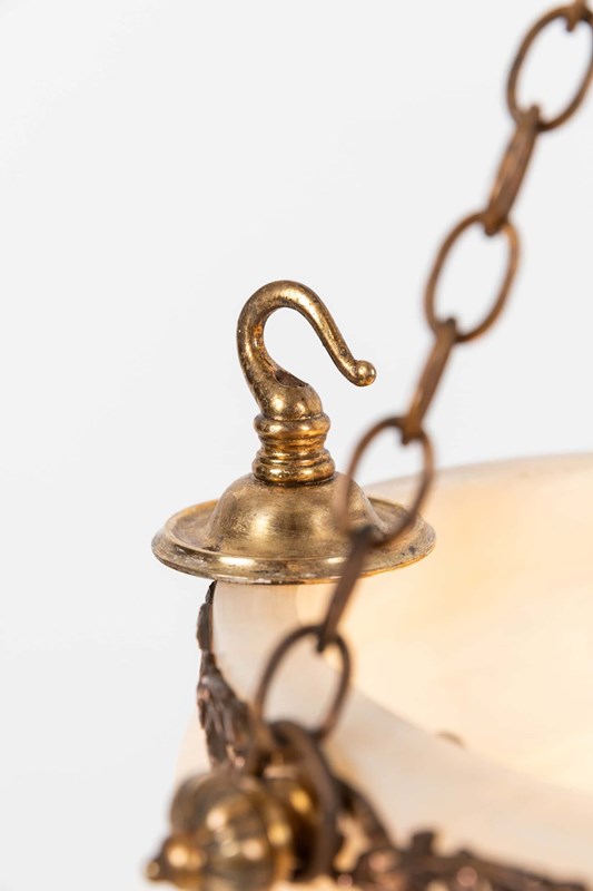 Off-white coloured alabaster, smaller in diameter but very heavy duty for its size. Supported by a delicately cast decorative brass ring. Complete with the original chain and decorative period hanging hardware.