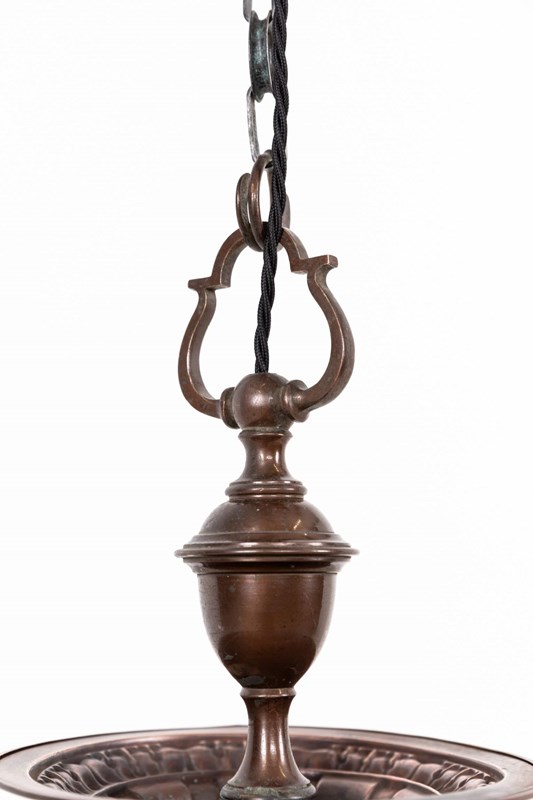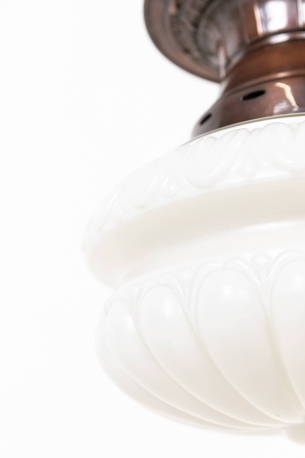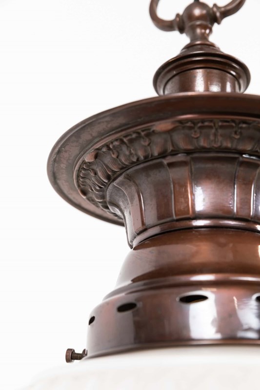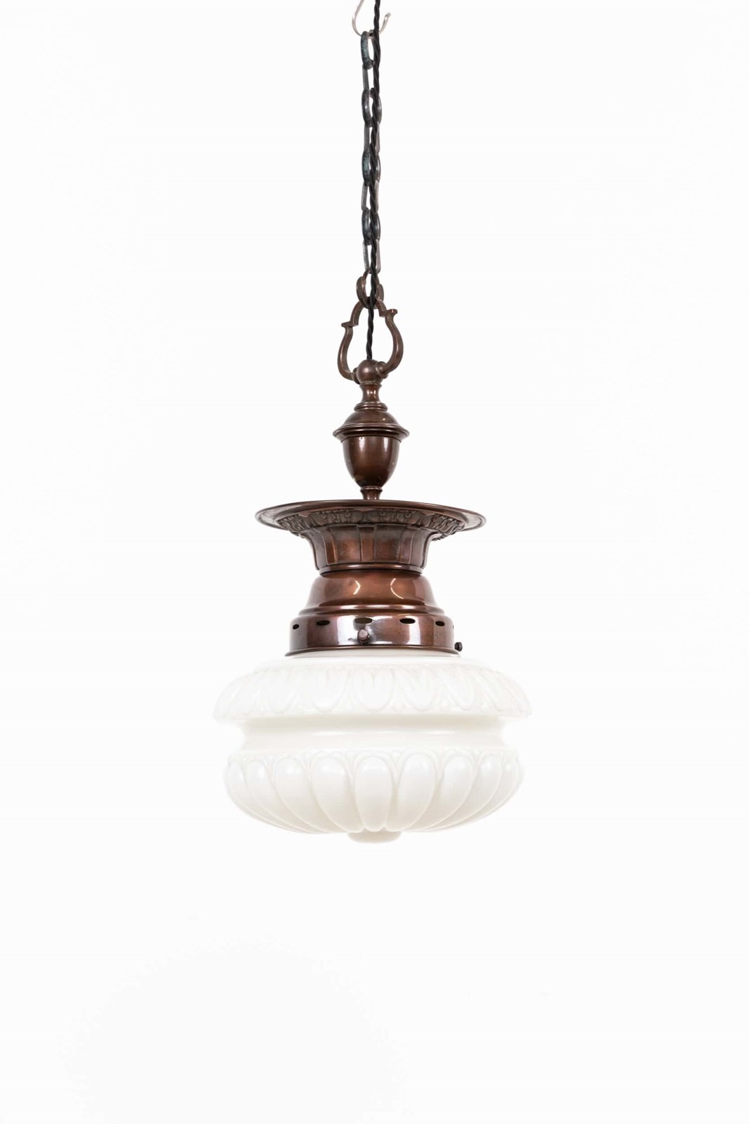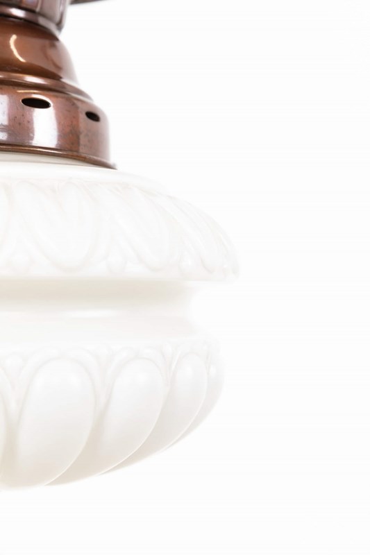 Well designed and pleasingly balanced, this pendant features a bulbous, thick pressed opaline glass shade with faint remnants of the original “Pearlstone” branding, a distinctive glass type produced by Falks. Above sits the original copper gallery, which complements the soft character of the glass without overpowering it.