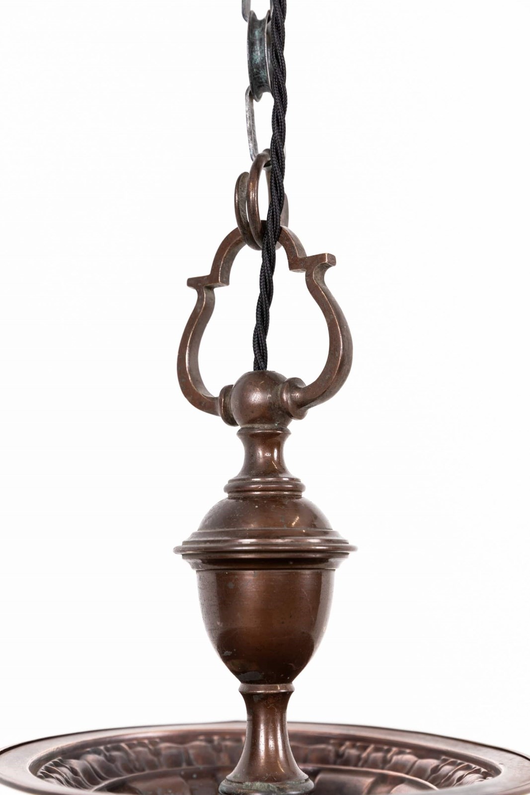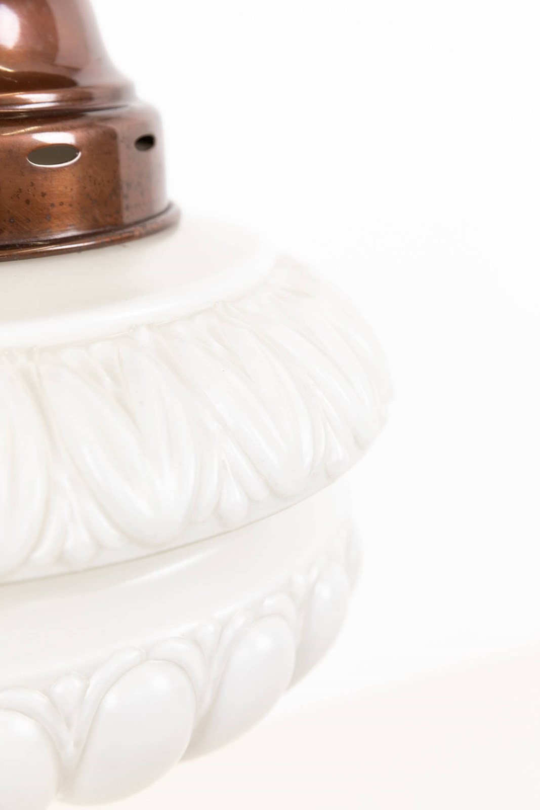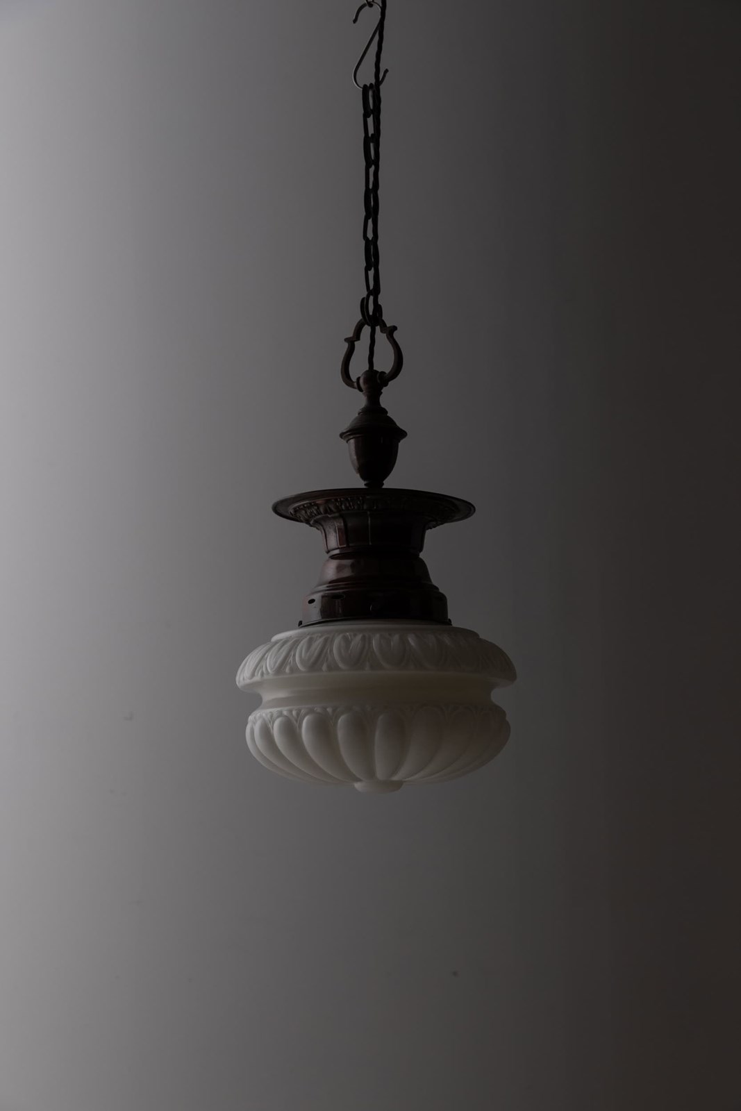 Well designed and pleasingly balanced, this pendant features a bulbous, thick pressed opaline glass shade with faint remnants of the original “Pearlstone” branding, a distinctive glass type produced by Falks. Above sits the original copper gallery, which complements the soft character of the glass without overpowering it.