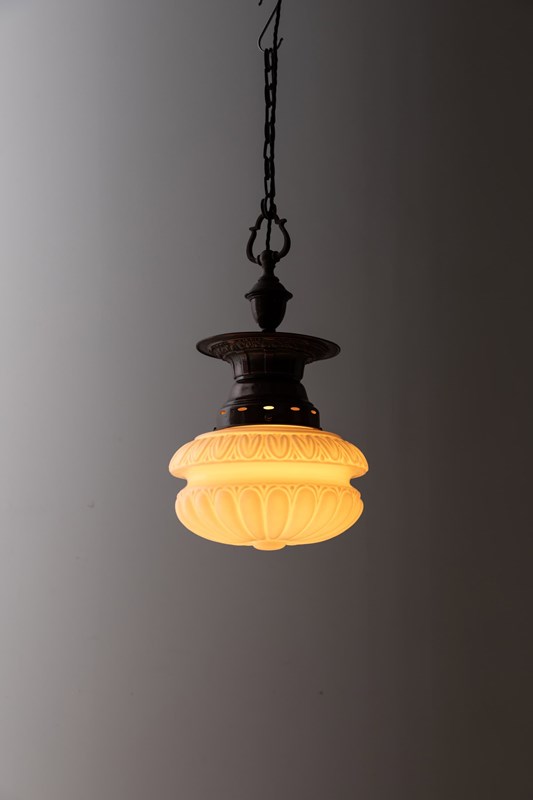 A beautifully decorative opaline glass pendant light made in England by Falks, dating to c.1915.