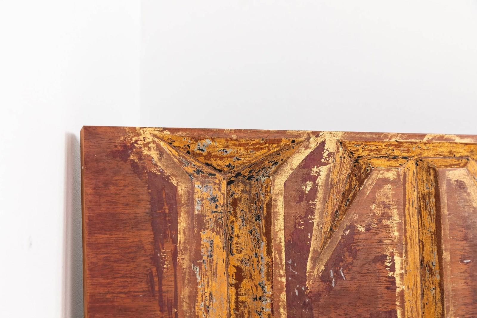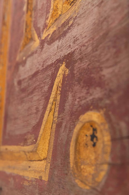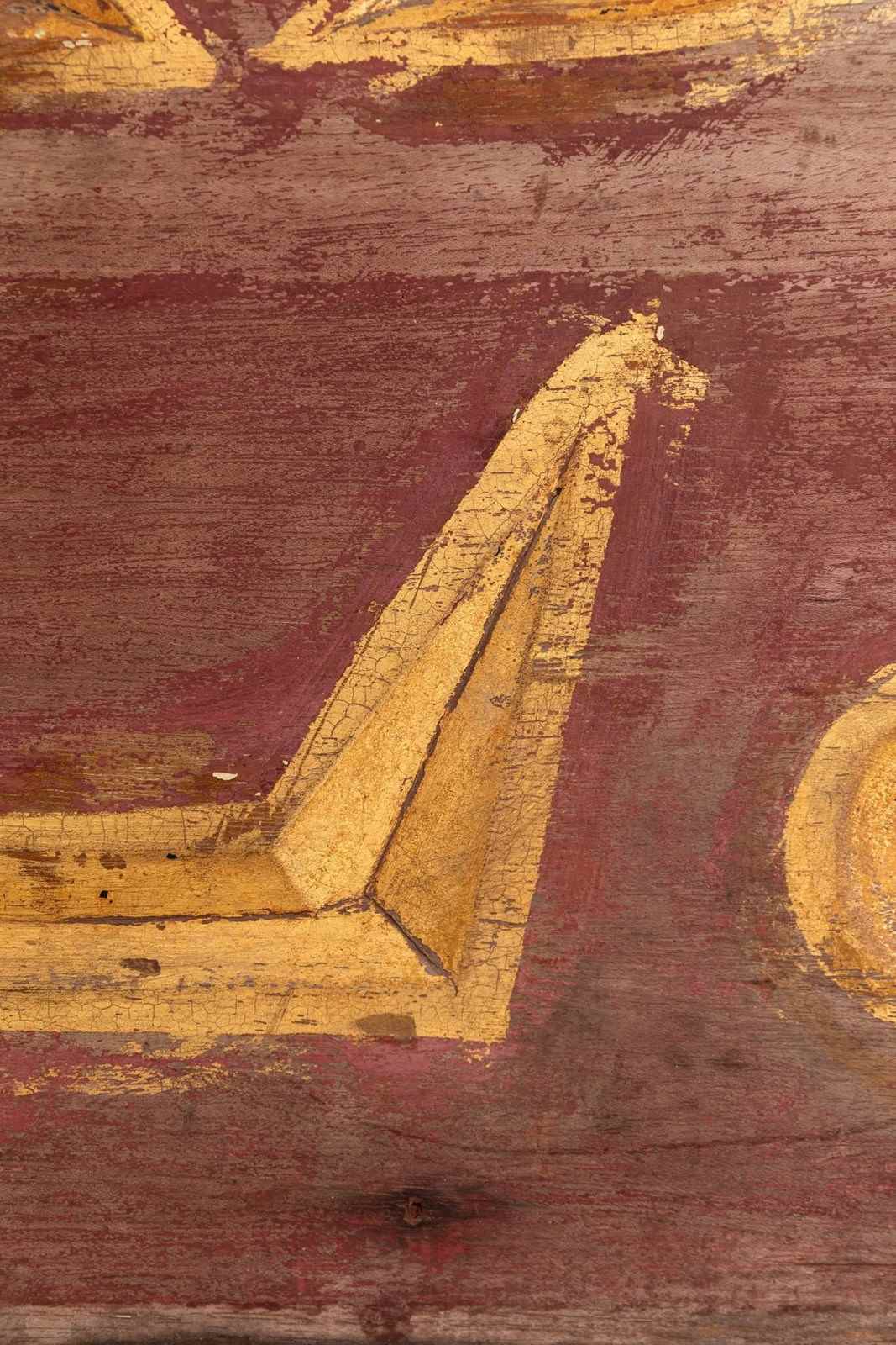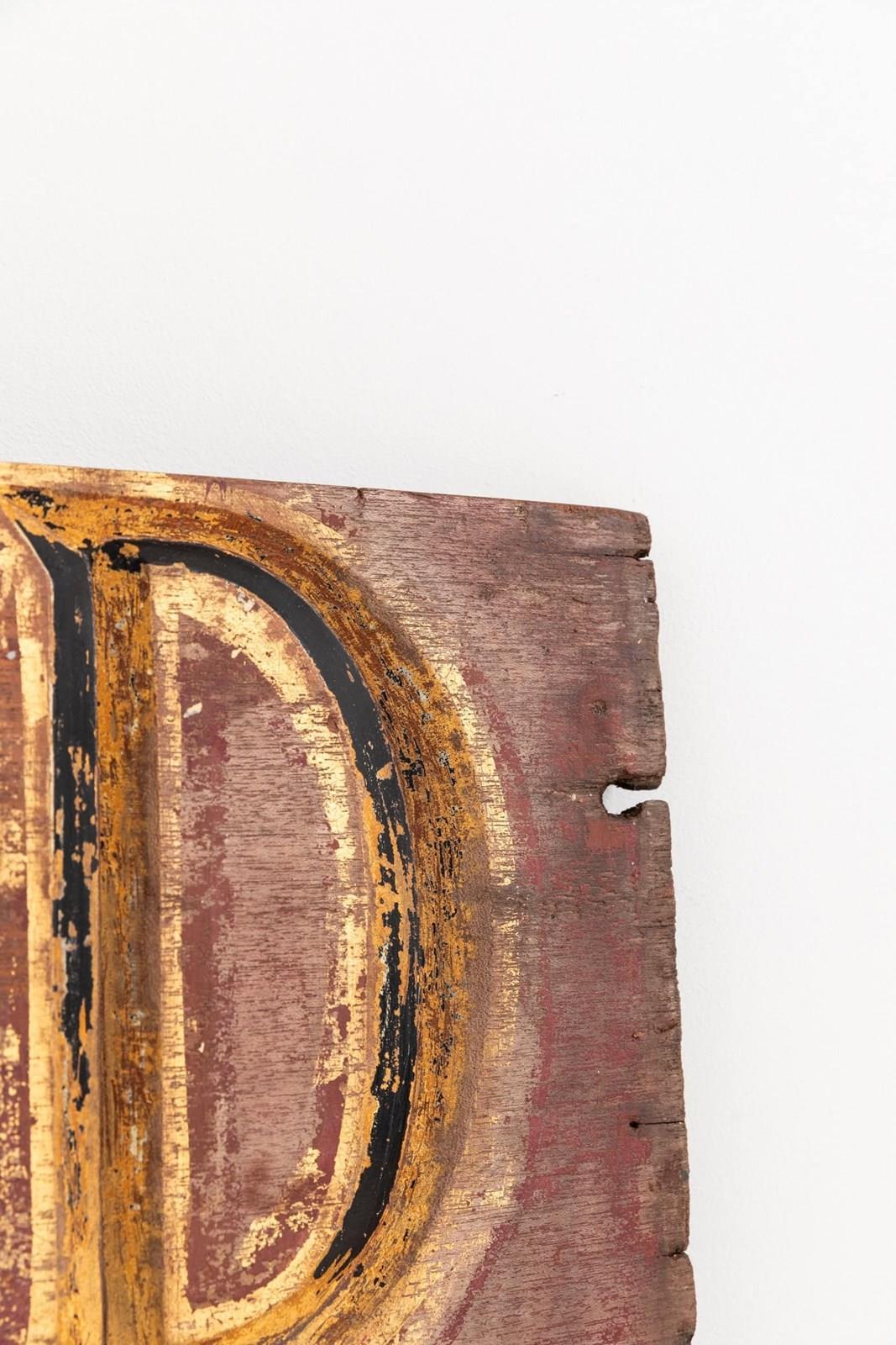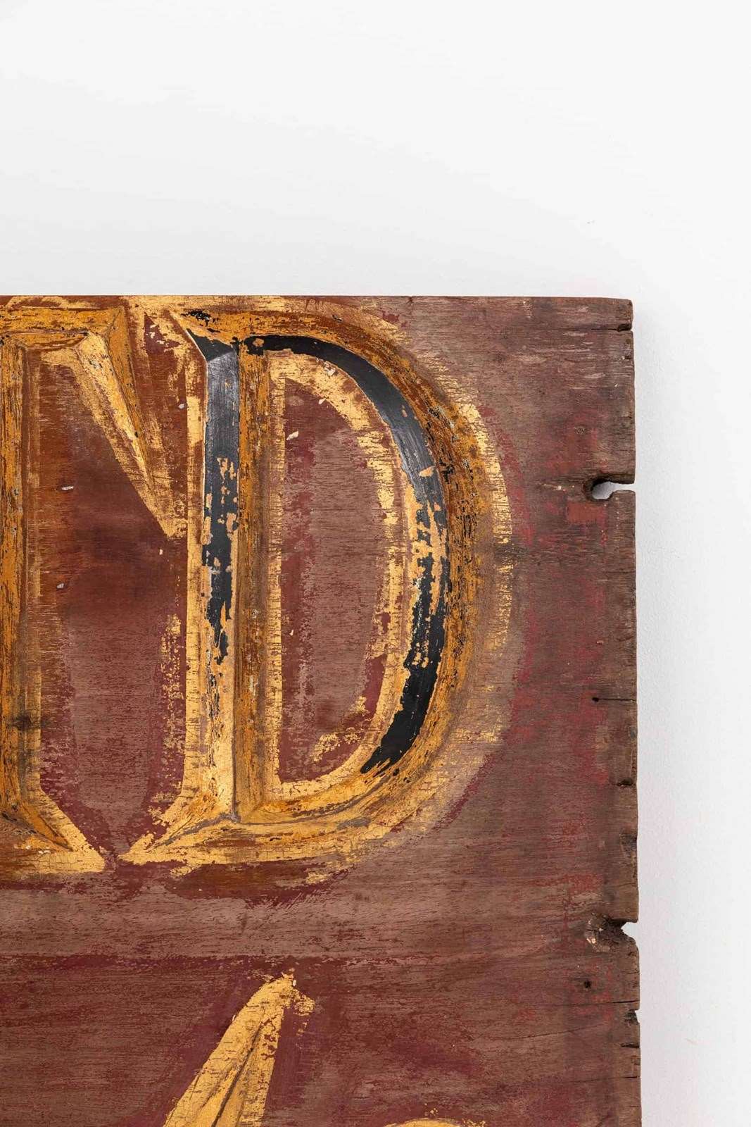 Once part of a larger shop sign with reverse painted glass over the top. Lovely decorative statement piece in wonderful original condition with old overpaint, primer and gilt lettering on show.