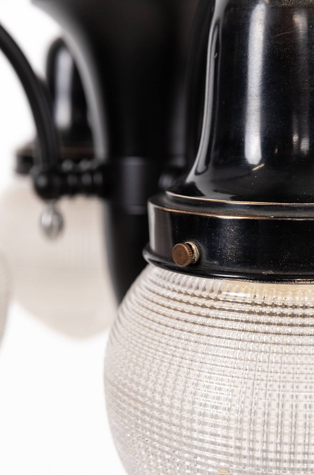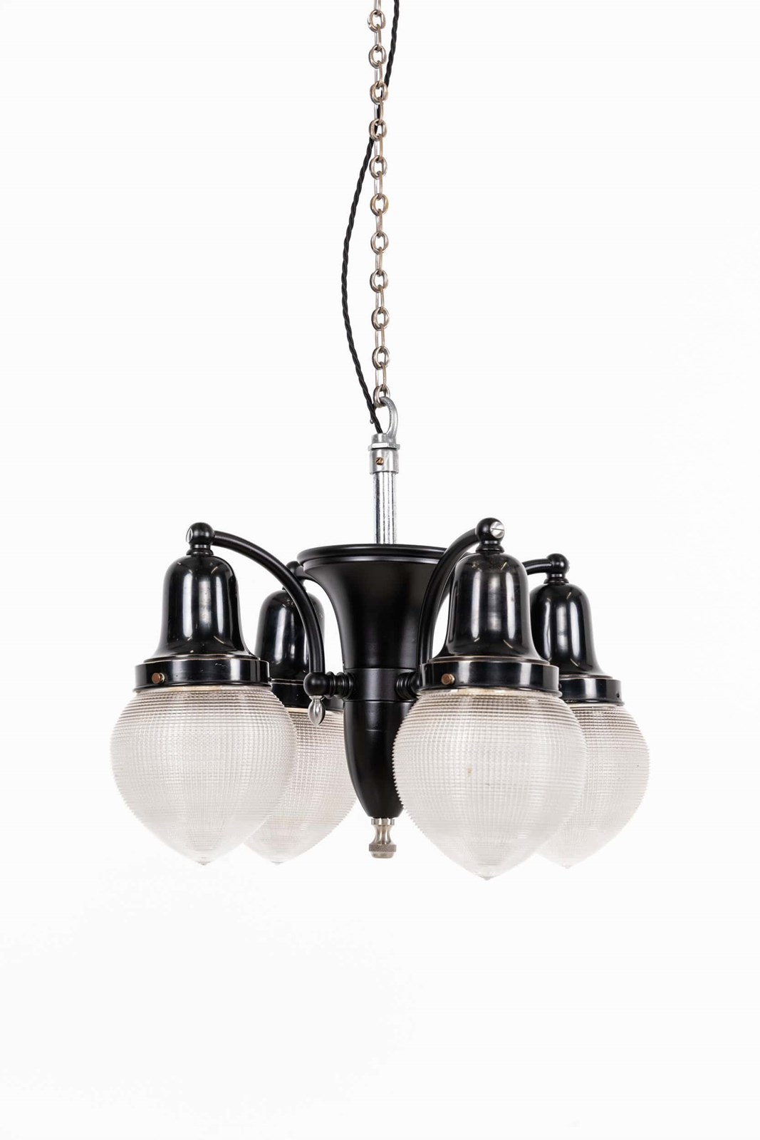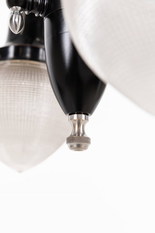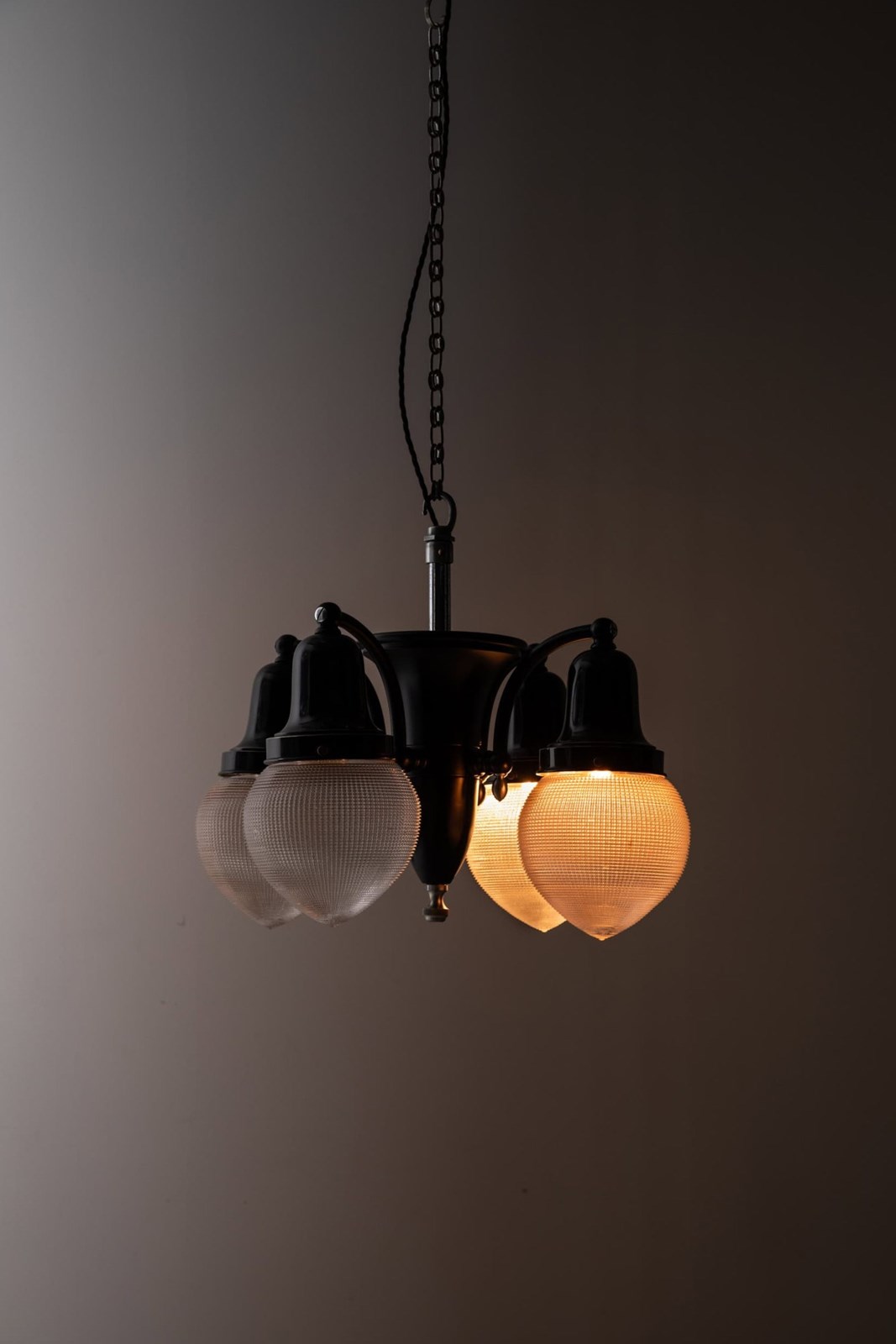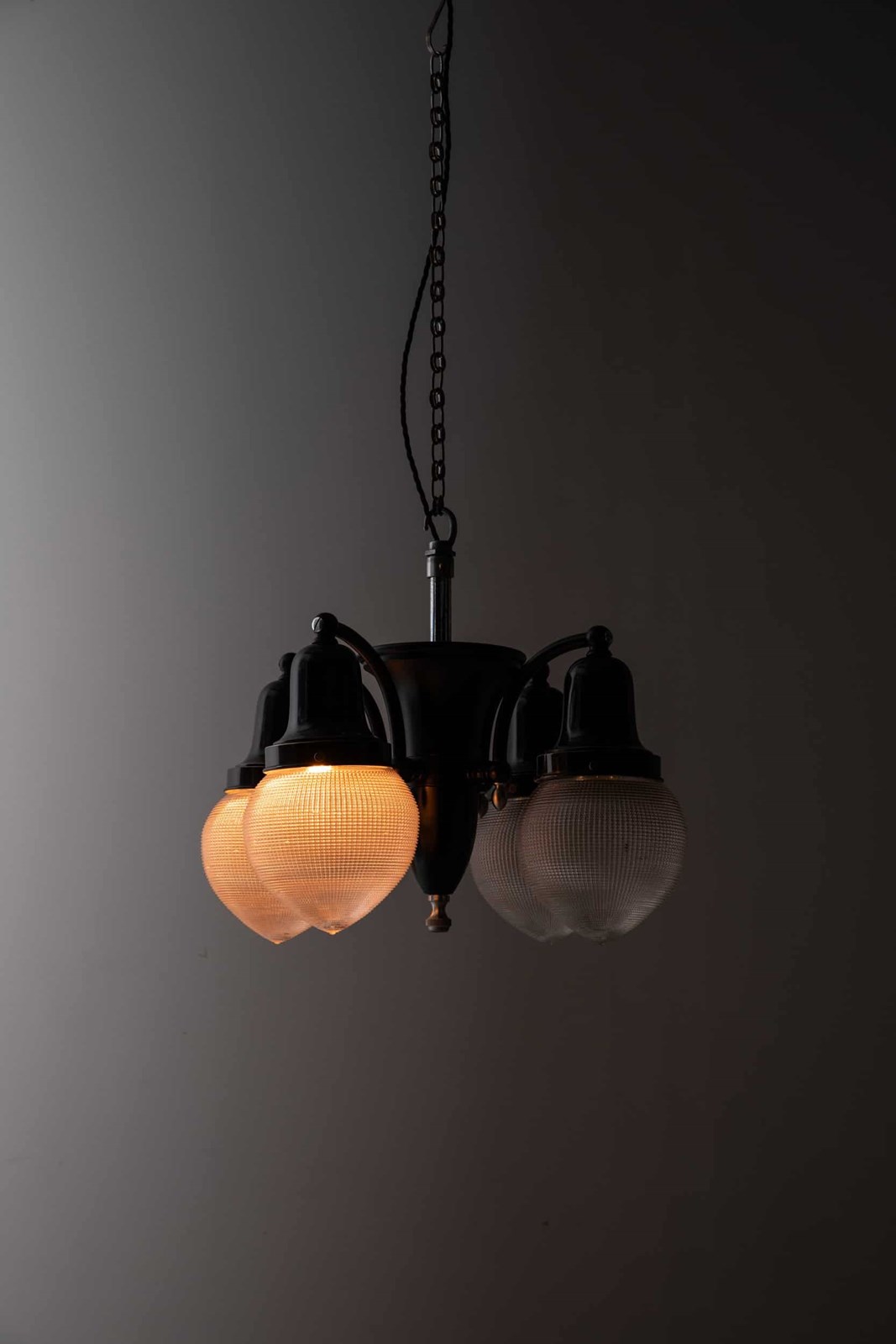 Converted for use as a pendant, complete with the four original Holophane prismatic glass onion shades. The central tactile switch, machined and knurled, allows staged illumination: either half independently or all four shades together, offering versatile light control and a striking visual effect. The original glass shades are all stamped Holophane, USA.