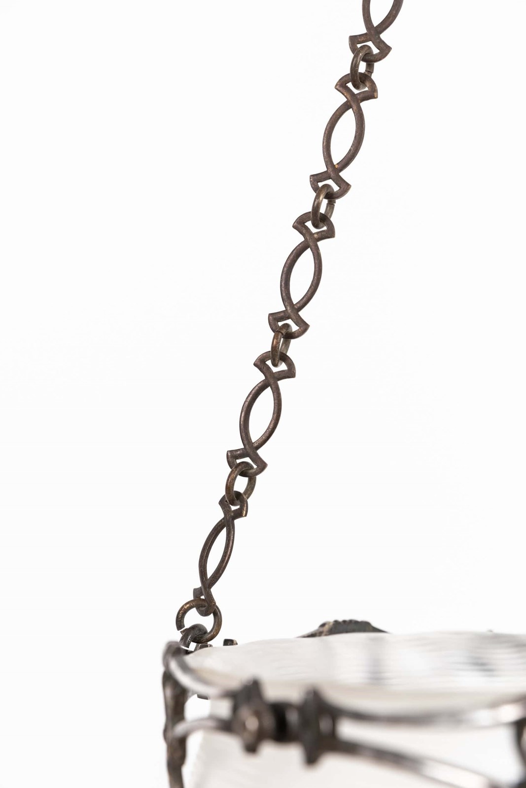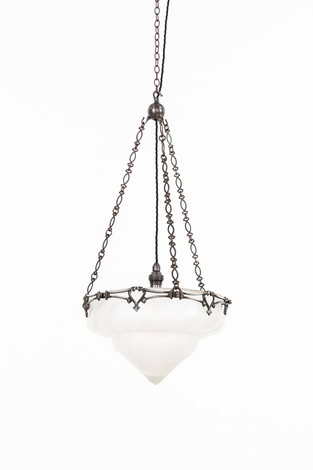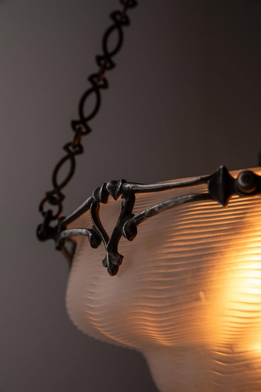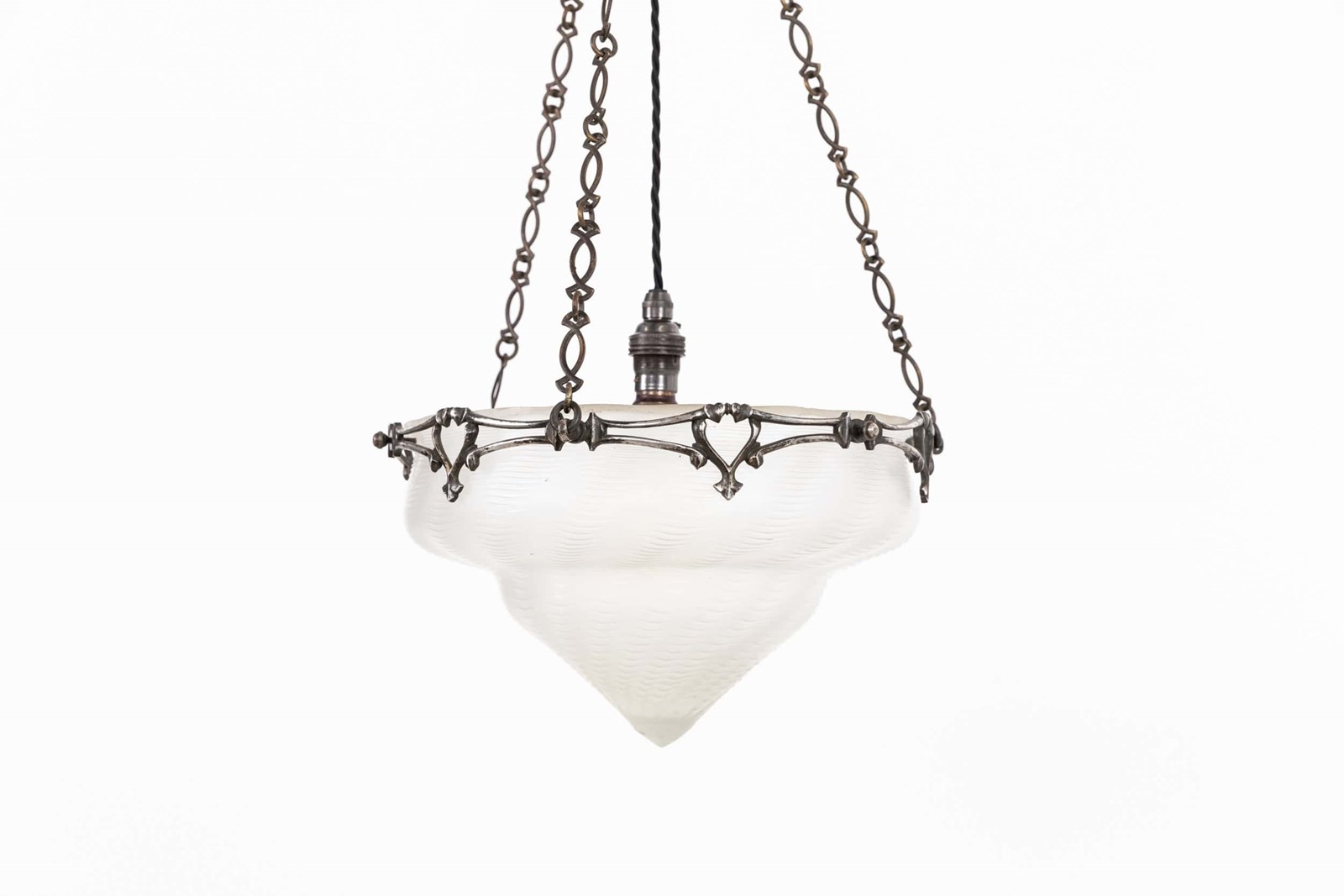 Wonderful quality cast decorative ring, retaining its original oxidised silver finish which has developed a beautiful patina over the past century. Complete with its original frosted and textured conical glass bowl made by James Powell & Sons / Whitefriars Glass - the best glass maker of the period.